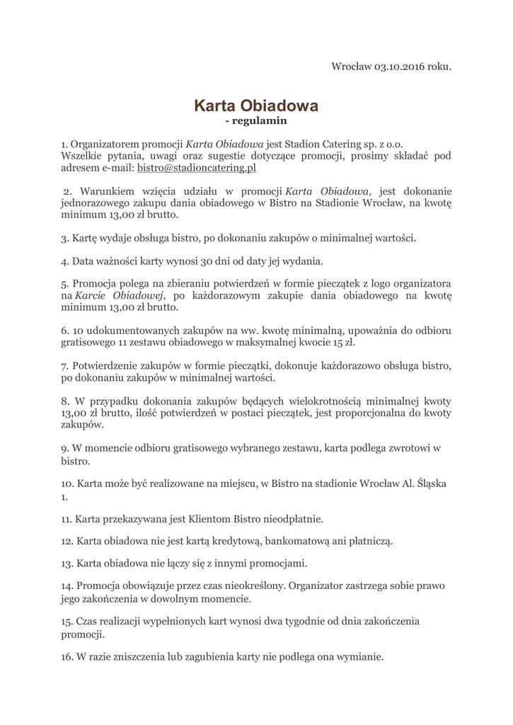 Wrocław 03.10.2016 roku. Karta Obiadowa - regulamin 1. Organizatorem promocji Karta Obiadowa jest Stadion Catering sp. z o.o. Wszelkie pytania, uwagi oraz sugestie dotyczące promocji, prosimy składać pod adresem e-mail: [email protected] 2. Warunkiem wzięcia udziału w promocji Karta Obiadowa, jest dokonanie jednorazowego zakupu dania obiadowego w Bistro na Stadionie Wrocław, na kwotę minimum 13,00 zł brutto. 3. Kartę wydaje obsługa bistro, po dokonaniu zakupów o minimalnej wartości. 4. Data ważności karty wynosi 30 dni od daty jej wydania. 5. Promocja polega na zbieraniu potwierdzeń w formie pieczątek z logo organizatora na Karcie Obiadowej, po każdorazowym zakupie dania obiadowego na kwotę minimum 13,00 zł brutto. 6. 10 udokumentowanych zakupów na ww. kwotę minimalną, upoważnia do odbioru gratisowego 11 zestawu obiadowego w maksymalnej kwocie 15 zł. 7. Potwierdzenie zakupów w formie pieczątki, dokonuje każdorazowo obsługa bistro, po dokonaniu zakupów w minimalnej wartości. 8. W przypadku dokonania zakupów będących wielokrotnością minimalnej kwoty 13,00 zł brutto, ilość potwierdzeń w postaci pieczątek, jest proporcjonalna do kwoty zakupów. 9. W momencie odbioru gratisowego wybranego zestawu, karta podlega zwrotowi w bistro. 10. Karta może być realizowane na miejscu, w Bistro na stadionie Wrocław Al. Śląska 1. 11. Karta przekazywana jest Klientom Bistro nieodpłatnie. 12. Karta obiadowa nie jest kartą kredytową, bankomatową ani płatniczą. 13. Karta obiadowa nie łączy się z innymi promocjami. 14. Promocja obowiązuje przez czas nieokreślony. Organizator zastrzega sobie prawo jego zakończenia w dowolnym momencie. 15. Czas realizacji wypełnionych kart wynosi dwa tygodnie od dnia zakończenia promocji. 16. W razie zniszczenia lub zagubienia karty nie podlega ona wymianie. 17. Informacja o zakończeniu promocji zostanie umieszczona z dwutygodniowym wyprzedzeniem na stronie WWW i w bistro. 18. Z promocji wyłączone są zakupy obejmujące obiady abonamentowe. 19. Korzystanie z karty obiadowej jest równoznaczne z akceptacją niniejszego regulaminu. 20. Organizator zastrzega sobie prawo dokonywania zmian w treści regulaminu. 11. Karta abonamentowa jest kartą imienną. Prawo do skorzystania z karty przysługuje osobie, na k ą karta została wypisana. 2. Karty wydawane są osobom indywidualnym. 3. Data ważności karty wynosi miesiąc od daty jej wydania. 4. Klient po zebraniu 10-ciu podpisów na karcie za zakup drugiego dania w cenie od 15zł, upoważniony jest do odbioru gratisowego drugiego dania z drobiu lub wieprzowiny. 5. W momencie odbioru gratisowego wybranego drugiego dania, karta podlega zwrotowi w barze. 6. Karty mogą być realizowane na miejscu, w barze Stary Wrocław ul. Bystrzycka 69c. 7. Korzystanie z karty rabatowej jest równoznaczne z akceptacją niniejszego regulaminu. 8. Bar Stary Wrocław zastrzega sobie prawo dokonywania zmian w treści regulaminu. 9. Każdy Klient posiada unikalny numer karty. 10. Karta przekazywana jest Klientom sieci baru Stary Wrocław nieodpłatnie. 11. Każdy Klient może korzystać jednorazowo z jednej karty. 12. Karta abonamentowa nie jest kartą kredytową, bankomatową ani płatniczą. 13. Karta abonamentowa nie łączy się z innymi promocjami. 14. Program obowiązuje przez czas nieokreślony. Bar Stary Wrocław zastrzega sobie prawo jego zakończenia w dowolnym momencie. 15. Czas realizacji wypełnionych kart wynosi dwa tygodnie od dnia zakończenia promocji. 16. W razie zniszczenia lub zagubienia karty abonamentowej nie podlega ona wymianie. 17. Informacja o zakończeniu promocji zostanie umieszczona z tygodniowym wyprzedzeniem na stronie WWW i w barze.. Karta abonamentowa jest kartą imienną. Prawo do skorzystania z karty przysługuje osobie, na którą karta została wypisana. 2. Karty wydawane są osobom indywidualnym. 3. Data ważności karty wynosi miesiąc od daty jej wydania. 4. Klient po zebraniu 10-ciu podpisów na karcie za zakup drugiego dania w cenie od 15zł, upoważniony jest do odbioru gratisowego drugiego dania z drobiu lub wieprzowiny. 5. W momencie odbioru gratisowego wybranego drugiego dania, karta podlega zwrotowi w barze. 6. Karty mogą być realizowane na miejscu, w barze Stary Wrocław ul. Bystrzycka 69c. 7. Korzystanie z karty rabatowej jest równoznaczne z akceptacją niniejszego regulaminu. 8. Bar Stary Wrocław zastrzega sobie prawo dokonywania zmian w treści regulaminu. 9. Każdy Klient posiada unikalny numer karty. 10. Karta przekazywana jest Klientom sieci baru Stary Wrocław nieodpłatnie. 11. Każdy Klient może korzystać jednorazowo z jednej karty. 12. Karta abonamentowa nie jest kartą kredytową, bankomatową ani płatniczą. 13. Karta abonamentowa nie łączy się z innymi promocjami. 14. Program obowiązuje przez czas nieokreślony. Bar Stary Wrocław zastrzega sobie prawo jego zakończenia w dowolnym momencie. 15. Czas realizacji wypełnionych kart wynosi dwa tygodnie od dnia zakończenia promocji. 16. W razie zniszczenia lub zagubienia karty abonamentowej nie podlega ona wymianie. 17. Informacja o zakończeniu promocji zostanie umieszczona z tygodniowym wyprzedzeniem na stronie WWW i w barze.