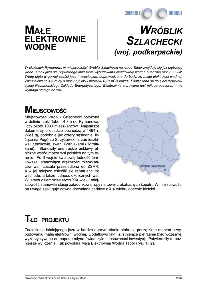 MAŁE ELEKTROWNIE WODNE WRÓBLIK SZLACHECKI (woj. podkarpackie) W okolicach Rymanowa w miejscowości Wróblik Szlachecki na rzece Tabor znajduje˛ sie˛ jaz pietrz ˛ acy ˛ wode. ˛ Obok jazu dla prywatnego inwestora wybudowano elektrownie˛ wodna˛ o łacznej ˛ mocy 30 kW. Wode˛ ujeto ˛ w górnej cz˛eści jazu i rurociagiem ˛ doprowadzono do budynku małej elektrowni wodnej. Zainstalowano 4 turbiny o mocy 7,5 kW i przełyku 0,21 m3 /s każda. Podłaczone ˛ sa˛ do sieci dystrybucyjnej Rzeszowskiego Zakładu Energetycznego. Elektrownia sterowana jest mikroprocesorem i nie wymaga stałego dozoru. MIEJSCOWOŚĆ Miejscowość Wróblik Szlachecki położona w dolinie rzeki Tabor, 4 km od Rymanowa, liczy około 1000 mieszkańców. Najstarsze dokumenty o osadzie pochodza˛ z 1494 r. Wieś ta, ˛ podobnie jak cztery sasiednie, ˛ leżace ˛ na Pogórzu Strzyżowskim, zamieszkiwali Łemkowie, zwani Górniakami (Horniakami). Stanowiły one ruskie enklawy etniczne wśród morza wsi polskich na tym terenie. Po II wojnie światowej ludność łemkowska, stanowiaca ˛ wiekszość ˛ mieszkańców wsi, została przesiedlona do ZSRR, a w jej miejsce osiedlili sie˛ repatrianci ze wschodu, a także ludność okolicznych wsi. W latach osiemdziesiatych ˛ XIX wieku miejscowość stanowiła stacje˛ załadunkowa˛ ropy naftowej z okolicznych kopalń. W miejscowości na uwage˛ zasługuje dawna drewniana cerkiew z XIX wieku, obecnie kościół. TŁO PROJEKTU Znalezienie istniejacego ˛ jazu w bardzo dobrym stanie stało sie˛ poczatkiem ˛ marzeń o wybudowaniu małej elektrowni wodnej. Dodatkowo fakt, iż istniejace ˛ pietrzenie ˛ było wcześniej wykorzystywane do napedu ˛ młyna świadczyło sensowności inwestycji. Potwierdziły to późniejsze wyliczenia. Tak powstała Mała Elektrownia Wodna Tabor (rys. 1 i 2). Stowarzyszenie Gmin Polska Sieć „Energie Cités” 2004 Małe elektrownie wodne Wróblik Szlachecki (woj. podkarpackie) Rys. 1. Widok budynku MEW i jazu. OPIS PROJEKTU W MEW Tabor (rys. 1 i 2) zastosowano ujecie wody typu tyrolskiego. Jest to konstrukcja betonowa w kształcie koryta, które jedna˛ ściana˛ przylega do progu wejściowego poprowadzone jest przez cała˛ szerokość rzeki. Dno koryta pochylone jest ze spadkiem 1,5% w kierunku poboru wody do elektrowni. W przekroju poprzecznym jego wymiary wewnetrzne ˛ to: wysokość 1 m, szerokość 1,2 m. Od góry przykryte segmentami (krata˛ stalowa). ˛ Z koryta ujet ˛ a˛ wode˛ poprowadzono rurociagiem ˛ do budynku elektrowni. W budynku MEW rura kończy sie˛ kolektorem do którego podczepione sa˛ turbozespoły (rys. 3). Woda przepływajac ˛ przez turbine˛ powoduje obrót śmigła, które za pośrednictwem wału napedza ˛ wirnik generatora. Liczba pracujacych ˛ turbin oraz moc rozwijana przez elektrownie ściśle zwiazana ˛ jest z aktualnym przepływem w rzece. Układ czterech niezależnych turbin pozwala na racjonalne wykorzystanie ilości wody płynacej ˛ w cieku. Charakterystyka budowli: Spad geometryczny Przepływ średni roczny w rzece Rok oddania do eksploatacji Prognozowana roczna produkcja energii Moc zainstalowana Liczba turbozespołów Moc elektryczna turbozespołu Przełyk turbiny Rodzaj turbiny Inwestor Generalny wykonawca Stowarzyszenie Gmin Polska Sieć „Energie Cités” 5,2 m 0,8 m3 /s 2000 150 000 kWh 30 kW 4 7,5 kW każdy 0,21 m3 /s Zatapialny turbozespół śmigłowy, bezprzekładniowy. TABOR Spółka z o.o. Wróblik Szlachecki „DR ZABER” ˛ Spółka z o.o ul. Magazynowa 1 33-300 Nowy Sacz ˛ tel. (18) 547 41 00÷01 fax. w. 1 2004 Małe elektrownie wodne Wróblik Szlachecki (woj. podkarpackie) Rys. 2 Zatapialny turbozespół śmigłowy firmy „DR ZABER” ˛ Sposób regulacji: MEW Tabor wyposażona została w komputerowy układ sterowania. Praca elektrowni nie wymaga ciagłego ˛ nadzoru człowieka. Mikroprocesorowy system sterowania realizuje kolejne właczenia ˛ lub wyłaczenia ˛ turbozespołów w zależności od aktualnego poziomu wody w rzece. W przypadkach awaryjnych system sterowania zatrzymuje elektrownie˛ lub wyłacza ˛ poszczególne turbozespoły wyświetlajac ˛ odpowiedni komunikat. Z warunkami awaryjnymi mamy do czynienia miedzy ˛ innymi gdy: • nie osiagana ˛ jest moc turbozespołów wynikajaca ˛ z obliczeń dla pomierzonej różnicy poziomów wody górnej i dolnej, • turbozespół przekroczy dopuszczalna˛ predkość ˛ obrotowa, ˛ • generator przekroczy dopuszczalna˛ temperature˛ pracy. Zamkniecie ˛ zaworów powoduje przepływ wody przez próg jazu do dolnego stanowiska, nie zaś przez elektrownie. ˛ Stowarzyszenie Gmin Polska Sieć „Energie Cités” 2004 Małe elektrownie wodne Wróblik Szlachecki (woj. podkarpackie) Rys. 3. Turbozespół śmigłowy zatapialny produkcji firmy „DR ZABER” ˛ (widok pogladowy) ˛ OCENA PROJEKTU I PERSPEKTYWY ROZWOJU Przedstawiona zabudowa MEW w postaci 4 małych turbin jest nowatorskim rozwiazaniem ˛ dla rzek o charakterze górskim. Zrealizowana inwestycja pozwoliła maksymalnie wykorzystać energetyczne zasoby wody niesione przez rzek˛e Tabor. Cenna˛ zaleta˛ tego rozwiazania ˛ jest, że praca elektrowni jest prawie całkowicie bezobsługowa. (Jedyna interwencja, to utrzymanie drożności ujecia ˛ po przejściu wielkiej wody.) Przy tak poważnej inwestycji jak elektrownia wodna zawsze doradza sie˛ inwestorowi wykonanie Założeń Techniczno Ekonomicznych (ZTE), obejmujacych: ˛ • dojazd na miejsce przyszłej lokalizacji, • zebranie informacji w odpowiednich urz˛edach, • dokonanie niezbednych ˛ pomiarów, • przy pomocy programów komputerowych stworzenie 3-wymiarowego modelu stanu istniejacego ˛ i propozycji konstrukcji elektrowni, • przeprowadzenie doboru turbin, generatorów, zaworów, rur ssawnych itd., • prognozowanie produkcji energii elektrycznej, • obliczanie składników kosztów inwestycji, które sa˛ równocześnie zobowiazaniem, ˛ że koszt budowy elektrowni nie przekroczy zaplanowanej 