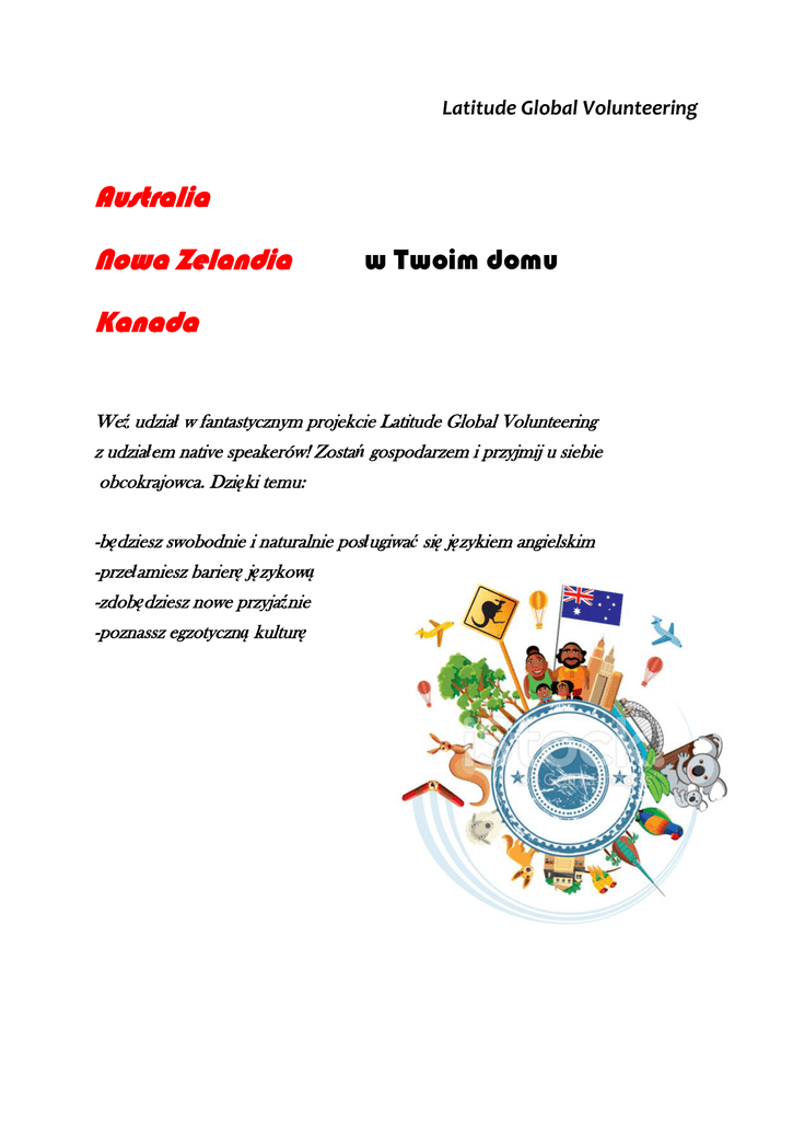 Latitude Global Volunteering Australia Nowa Zelandia w Twoim domu Kanada Weź udział w fantastycznym projekcie Latitude Global Volunteering z udziałem native speakerów! Zostań gospodarzem i przyjmij u siebie obcokrajowca. Dzięki temu: -będziesz swobodnie i naturalnie posługiwać się językiem angielskim -przełamiesz barierę językową -zdobędziesz nowe przyjaźnie -poznassz egzotyczną kulturę