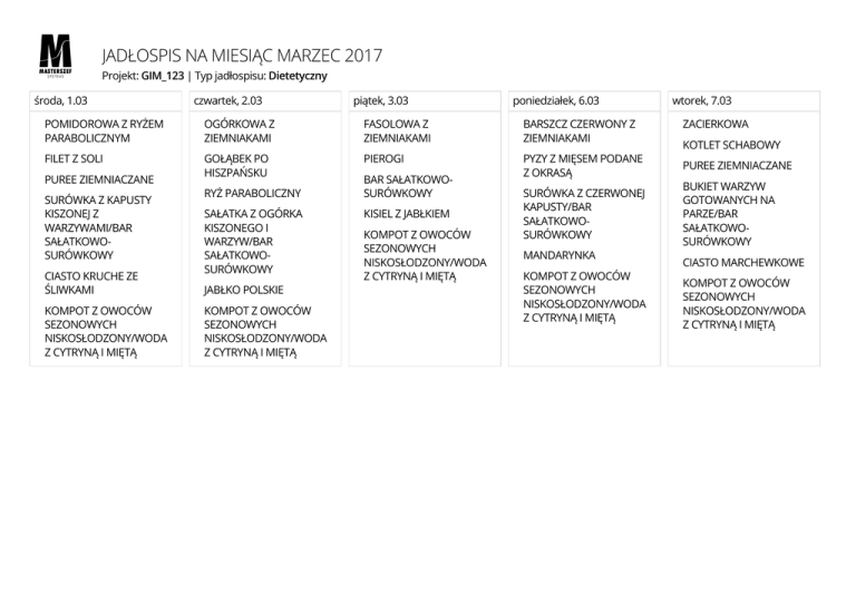 JADŁOSPIS NA MIESIĄC MARZEC 2017 Projekt: GIM_123 | Typ jadłospisu: Dietetyczny środa, 1.03 czwartek, 2.03 piątek, 3.03 poniedziałek, 6.03 POMIDOROWA Z RYŻEM PARABOLICZNYM OGÓRKOWA Z ZIEMNIAKAMI FASOLOWA Z ZIEMNIAKAMI BARSZCZ CZERWONY Z ZIEMNIAKAMI FILET Z SOLI GOŁĄBEK PO HISZPAŃSKU PIEROGI PYZY Z MIĘSEM PODANE Z OKRASĄ PUREE ZIEMNIACZANE SURÓWKA Z KAPUSTY KISZONEJ Z WARZYWAMI/BAR SAŁATKOWOSURÓWKOWY CIASTO KRUCHE ZE ŚLIWKAMI KOMPOT Z OWOCÓW SEZONOWYCH NISKOSŁODZONY/WODA Z CYTRYNĄ I MIĘTĄ RYŻ PARABOLICZNY SAŁATKA Z OGÓRKA KISZONEGO I WARZYW/BAR SAŁATKOWOSURÓWKOWY JABŁKO POLSKIE KOMPOT Z OWOCÓW SEZONOWYCH NISKOSŁODZONY/WODA Z CYTRYNĄ I MIĘTĄ BAR SAŁATKOWOSURÓWKOWY KISIEL Z JABŁKIEM KOMPOT Z OWOCÓW SEZONOWYCH NISKOSŁODZONY/WODA Z CYTRYNĄ I MIĘTĄ SURÓWKA Z CZERWONEJ KAPUSTY/BAR SAŁATKOWOSURÓWKOWY MANDARYNKA KOMPOT Z OWOCÓW SEZONOWYCH NISKOSŁODZONY/WODA Z CYTRYNĄ I MIĘTĄ wtorek, 7.03 ZACIERKOWA KOTLET SCHABOWY PUREE ZIEMNIACZANE BUKIET WARZYW GOTOWANYCH NA PARZE/BAR SAŁATKOWOSURÓWKOWY CIASTO MARCHEWKOWE KOMPOT Z OWOCÓW SEZONOWYCH NISKOSŁODZONY/WODA Z CYTRYNĄ I MIĘTĄ środa, 8.03 czwartek, 9.03 OGÓRKOWA Z ZIEMNIAKAMI KAPUŚNIACZEK Z ZIEMNIAKAMI SZNYCELEK W SOSIE WŁASNYM SPAGHETTI BOLOGNESE KASZA EKOLOGICZNA BURACZKI NA CIEPŁO/BAR SAŁATKOWOSURÓWKOWY JABŁKO POLSKIE KOMPOT Z OWOCÓW SEZONOWYCH NISKOSŁODZONY/WODA Z CYTRYNĄ I MIĘTĄ środa, 15.03 JARZYNOWA Z ZIEMNIAKAMI GULASZ WIEPRZOWY Z WARZYWAMI KASZA EKOLOGICZNA MARCHEW GOTOWANA NA PARZE/BAR SAŁATKOWOSURÓWKOWY JABŁKO POLSKIE KOMPOT Z OWOCÓW SEZONOWYCH NISKOSŁODZONY/WODA Z CYTRYNĄ I MIĘTĄ OGÓREK KISZONY/BAR SAŁATKOWOSURÓWKOWY KISIEL Z JABŁKIEM KOMPOT Z OWOCÓW SEZONOWYCH NISKOSŁODZONY/WODA Z CYTRYNĄ I MIĘTĄ czwartek, 16.03 GROCHOWA KOTLET SCHABOWY PUREE ZIEMNIACZANE SURÓWKA Z KAPUSTY BIAŁEJ Z WARZYWAMI/BAR SAŁATKOWOSURÓWKOWY BUDYŃ KOMPOT Z OWOCÓW SEZONOWYCH NISKOSŁODZONY/WODA Z CYTRYNĄ I MIĘTĄ piątek, 10.03 poniedziałek, 13.03 wtorek, 14.03 ROSÓŁ Z MAKARONEM KRUPNIK BARSZCZ BIAŁY FILET Z SOLI MAKARON Z MUSEM OWOCOWYM KOTLET MIELONY PUREE ZIEMNIACZANE SURÓWKA Z KAPUSTY KISZONEJ/BAR SAŁATKOWOSURÓWKOWY CIASTO TRÓJKOLOROWE PIASKOWE KOMPOT Z OWOCÓW SEZONOWYCH NISKOSŁODZONY/WODA Z CYTRYNĄ I MIĘTĄ piątek, 17.03 POMIDOROWA Z MAKARONEM FILET Z SOLI PUREE ZIEMNIACZANE SURÓWKA Z KAPUSTY KISZONEJ Z WARZYWAMI/BAR SAŁATKOWOSURÓWKOWY KISIEL Z JABŁKIEM KOMPOT Z OWOCÓW SEZONOWYCH NISKOSŁODZONY/WODA Z CYTRYNĄ I MIĘTĄ BAR SAŁATKOWOSURÓWKOWY MANDARYNKA KOMPOT Z OWOCÓW SEZONOWYCH NISKOSŁODZONY/WODA Z CYTRYNĄ I MIĘTĄ poniedziałek, 20.03 ŻUREK ŁAZANKI BAR SAŁATKOWOSURÓWKOWY JABŁKO POLSKIE KOMPOT Z OWOCÓW SEZONOWYCH NISKOSŁODZONY/WODA Z CYTRYNĄ I MIĘTĄ PUREE ZIEMNIACZANE BURACZKI NA CIEPŁO/BAR SAŁATKOWOSURÓWKOWY CIASTO BISZKOPTOWE KOMPOT Z OWOCÓW SEZONOWYCH NISKOSŁODZONY/WODA Z CYTRYNĄ I MIĘTĄ wtorek, 21.03 JARZYNOWA Z ZIEMNIAKAMI SZYNKA PIECZONA PUREE ZIEMNIACZANE SURÓWKA Z BURACZKÓW I JABŁKA/BAR SAŁATKOWOSURÓWKOWY CIASTO MARCHEWKOWE KOMPOT Z OWOCÓW SEZONOWYCH NISKOSŁODZONY/WODA Z CYTRYNĄ I MIĘTĄ środa, 22.03 czwartek, 23.03 piątek, 24.03 poniedziałek, 27.03 wtorek, 28.03 ROSÓŁ Z MAKARONEM KALAFIOROWA POMIDOROWA Z RYŻEM BARSZCZ UKRAIŃSKI KAPUŚNIACZEK KLOPS W SOSIE POMIDOROWYM POTRAWKA Z KURCZAKA NALEŚNIKI BITKI W SOSIE WŁASNYM RYŻ PARABOLICZNY BAR SAŁATKOWOSURÓWKOWY MAKARON Z MUSEM OWOCOWYM KASZA EKOLOGICZNA SURÓWKA Z SAŁATY LODOWEJ Z WARZYWAMI/BAR SAŁATKOWOSURÓWKOWY KISIEL Z JABŁKIEM KOMPOT Z OWOCÓW SEZONOWYCH NISKOSŁODZONY/WODA Z CYTRYNĄ I MIĘTĄ środa, 29.03 OGÓRKOWA Z ZIEMNIAKAMI SZNYCELEK W SOSIE WŁASNYM KASZA EKOLOGICZNA BAR SAŁATKOWOSURÓWKOWY JABŁKO POLSKIE KOMPOT Z OWOCÓW SEZONOWYCH NISKOSŁODZONY/WODA Z CYTRYNĄ I MIĘTĄ MARCHEW TARTA/BAR SAŁATKOWOSURÓWKOWY MANDARYNKA KOMPOT Z OWOCÓW SEZONOWYCH NISKOSŁODZONY/WODA Z CYTRYNĄ I MIĘTĄ czwartek, 30.03 MANDARYNKA KOMPOT Z OWOCÓW SEZONOWYCH NISKOSŁODZONY/WODA Z CYTRYNĄ I MIĘTĄ piątek, 31.03 KALAFIOROWA ROSÓŁ Z MAKARONEM SPAGHETTI BOLOGNESE FILET Z SOLI OGÓREK KISZONY/BAR SAŁATKOWOSURÓWKOWY PUREE ZIEMNIACZANE KISIEL Z JABŁKIEM KOMPOT Z OWOCÓW SEZONOWYCH NISKOSŁODZONY/WODA Z CYTRYNĄ I MIĘTĄ SURÓWKA Z KAPUSTY KISZONEJ/BAR SAŁATKOWOSURÓWKOWY CIASTO TRÓJKOLOROWE PIASKOWE KOMPOT Z OWOCÓW SEZONOWYCH NISKOSŁODZONY/WODA Z CYTRYNĄ I MIĘTĄ BAR SAŁATKOWOSURÓWKOWY CIASTO TRÓJKOLOROWE PIASKOWE KOMPOT Z OWOCÓW SEZONOWYCH NISKOSŁODZONY/WODA Z CYTRYNĄ I MIĘTĄ PUREE ZIEMNIACZANE BURACZKI NA CIEPŁO/BAR SAŁATKOWOSURÓWKOWY MANDARYNKA KOMPOT Z OWOCÓW SEZONOWYCH NISKOSŁODZONY/WODA Z CYTRYNĄ I MIĘTĄ