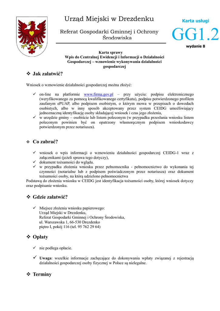 Urząd Miejski w Drezdenku Karta usługi Referat Gospodarki Gminnej i Ochrony Środowiska GG1.2 wydanie 8 Karta sprawy Wpis do Centralnej Ewidencji i Informacji o Działalności Gospodarczej – wznowienie wykonywania działalności gospodarczej Jak załatwić? Wniosek o wznowienie działalności gospodarczej można złożyć: on-line na platformie www.firma.gov.pl – przy użyciu: podpisu elektronicznego (weryfikowanego za pomocą kwalifikowanego certyfikatu), podpisu potwierdzonego profilem zaufanym ePUAP, albo podpisem osobistym, o którym mowa w przepisach o dowodach osobistych, albo w inny sposób akceptowany przez system CEIDG umożliwiający jednoznaczną identyfikację osoby składającej wniosek i czas jego złożenia, w urzędzie gminy – osobiście lub listem poleconym (w przypadku przesłania wniosku listem poleconym powinien być on opatrzony własnoręcznym podpisem wnioskodawcy potwierdzonym przez notariusza). Co zabrać? wniosek o wpis informacji o wznowieniu działalności gospodarczej CEIDG-1 wraz z załącznikami (jeżeli sprawa tego dotyczy), dokument tożsamości do wglądu. w przypadku złożenia wniosku przez pełnomocnika - pełnomocnictwo do wykonania tej czynności (notarialne lub z podpisem poświadczonym przez notariusza) oraz dokument tożsamości osoby, na którą udzielono pełnomocnictwa Podstawą do złożenia wniosku w CEIDG jest identyfikacja tożsamości osoby, której wniosek dotyczy oraz podpisanie wniosku. Gdzie załatwić? Miejsce złożenia wniosku papierowego: Urząd Miejski w Drezdenku, Referat Gospodarki Gminnej i Ochrony Środowiska, ul. Warszawska 1, 66-530 Drezdenko piętro I, pokój 116 (tel. 95 762 29 64) Opłaty nie podlega opłacie. Uwaga: wszelkie informacje zachęcające do dokonywania wpłaty związanej z rejestracją działalności gospodarczej osoby fizycznej w Polsce są nielegalne. Terminy Niezwłocznie (lub w terminie uzgodnionym z pracownikiem przyjmującym wniosek). Tryb Odwoławczy Brak Dodatkowe informacje Od 1 lipca 2011 r. organem ewidencyjnym jest minister właściwy do spraw gospodarki, który w systemie teleinformatycznym prowadzi Centralną Ewidencję i Informację o Działalności Gospodarczej (CEIDG).Wszelkie informacje można uzyskać na stronie www.firma.gov.pl (infolinia CEIDG: 801 055 088, 22 100 20 79). Niniejsza karta sprawy opracowana jest na potrzeby przedsiębiorcy, który składa wniosek papierowy za pośrednictwem Urzędu Miejskiego w Drezdenku, niezależnie od miejsca zamieszkania. Zaświadczenia o wpisie w CEIDG mają formę dokumentu elektronicznego albo wydruku ze strony internetowej www.firma.gov.pl. Przedsiębiorca ma możliwość wydrukowania swojego zaświadczenia oraz sprawdzenia kontrahenta za pomocą wyszukiwarki zamieszczonej na stronie internetowej CEIDG „baza przedsiębiorców”. Organy administracji publicznej nie mogą domagać od przedsiębiorców okazywania, przekazywania lub załączania do wniosków zaświadczeń o wpisie w CEIDG. Wznowienie wykonywania działalności gospodarczej następuje na wniosek przedsiębiorcy. Jeżeli przedsiębiorca nie wznowi działalności przed upływem 24 miesięcy, wpis zostanie wykreślony z urzędu. Data wznowienie nie może być wcześniejsza niż dzień złożenia wniosku. Przedsiębiorca może określić późniejszy dzień wznowienia, niż dzień złożenia wniosku. Numerem identyfikacyjnym przedsiębiorcy w CEIDG jest numer identyfikacji podatkowej (NIP). Wraz z wnioskiem o wpis do CEIDG przedsiębiorca składa oświadczenie o braku orzeczonych – wobec osoby, której wpis dotyczy – zakazów, pod rygorem odpowiedzialności karnej za złożenie fałszywego oświadczenia. PODSTAWA PRAWNA: Ustawa z dnia 2 lipca 2004 r. o swobodzie działalności gospodarczej (t. j. Dz. U. z 2015 r., poz. 584) Ustawa z dnia 25 marca 2011 r. o ograniczaniu barier administracyjnych dla obywateli i przedsiębiorców (Dz.U. 2011 r. nr 106 poz. 622) Ustawa z dnia 2 lipca 2004 r. Przepisy wprowadzające ustawę o swobodzie działalności gospodarczej (Dz.U. z 2004r., nr 173 poz. 1808 ze zm.) Ustawa z dnia 14 czerwca 1960 r. Kodeks postępowania administracyjnego (t. j. Dz. U. z 2016 r., poz. 23) Ustawa z dnia 16 listopada 2006 r. o opłacie skarbowej (tj. Dz.U. z 2015 r. poz. 783 z późn. zm.) Ustawa z dnia 16 listopada 2012 r. o redukcji niektórych obciążeń administracyjnych w gospodarce (Dz.U. z 2012 r., poz. 1342) Ustawa z dnia 5 grudnia 2014 r. o zmianach ustaw o swobodzie działalności gospodarczej (Dz.U. z 2014 r., poz. 1885) http://www.bip.drezdenko.pl/