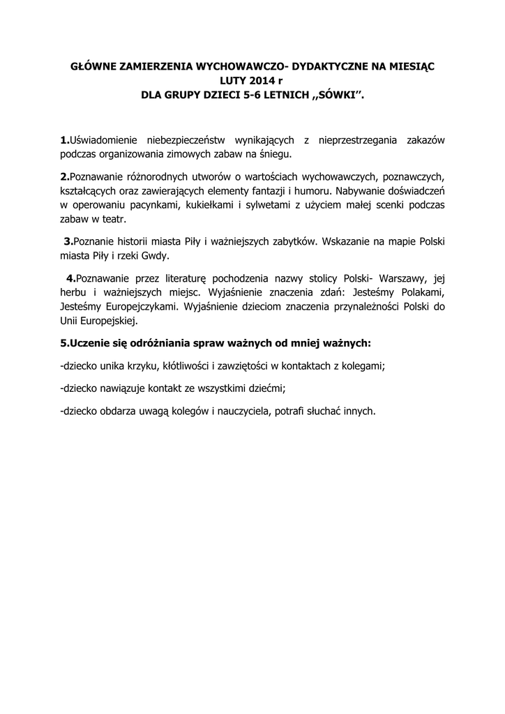 GŁÓWNE ZAMIERZENIA WYCHOWAWCZO- DYDAKTYCZNE NA MIESIĄC LUTY 2014 r DLA GRUPY DZIECI 5-6 LETNICH ,,SÓWKI’’. 1.Uświadomienie niebezpieczeństw wynikających z nieprzestrzegania zakazów podczas organizowania zimowych zabaw na śniegu. 2.Poznawanie róŜnorodnych utworów o wartościach wychowawczych, poznawczych, kształcących oraz zawierających elementy fantazji i humoru. Nabywanie doświadczeń w operowaniu pacynkami, kukiełkami i sylwetami z uŜyciem małej scenki podczas zabaw w teatr. 3.Poznanie historii miasta Piły i waŜniejszych zabytków. Wskazanie na mapie Polski miasta Piły i rzeki Gwdy. 4.Poznawanie przez literaturę pochodzenia nazwy stolicy Polski- Warszawy, jej herbu i waŜniejszych miejsc. Wyjaśnienie znaczenia zdań: Jesteśmy Polakami, Jesteśmy Europejczykami. Wyjaśnienie dzieciom znaczenia przynaleŜności Polski do Unii Europejskiej. 5.Uczenie się odróŜniania spraw waŜnych od mniej waŜnych: -dziecko unika krzyku, kłótliwości i zawziętości w kontaktach z kolegami; -dziecko nawiązuje kontakt ze wszystkimi dziećmi; -dziecko obdarza uwagą kolegów i nauczyciela, potrafi słuchać innych. PIOSENKA „Tramwajem po warszawie” I.Ruch w Warszawie, tak jak zwykle pędzą auta, motocykle, jedzie tramwaj za tramwajem, na przystankach kaŜdy staje. Ref:,,HejŜe, panie konduktorze! Czy w tramwaju miejsca są?’’ Przez warszawskich ulic sto! Dzyń, dzyń, dzyń….. II. Tramwaj jedzie, my ciekawie Przyglądamy się Warszawie. Domy, mosty, stadion duŜy oglądamy w tej podróŜy. Ref: ,,HejŜe ,panie konduktorze…..’’ Sł.H.Pietrusiewicz, Muz.F.Rybicki WIERSZ „Piła” Wśród licznych map w atlasie świata, jest taka jedna szczególna mapa i mała kropka, która oznacza moje miasto -Piłę na mapie świata. Piła to moje miasto rodzinne. Jest takie piękne, jak Ŝadne inne. Rosną tu kwiaty pośród zieleni, w słonecznym świetle rzeka się mieni. Jest tu muzeum- domek Staszica, nasze podwórko, moja ulica I piękne lasy-gdzie rosną grzyby, jeziora, w których pływają ryby. Jest teŜ boisko, gdzie w piłkę gramy, ławka nad rzeką- dla mojej mamy. Mosty, pomniki, kina i basen, gdzie moŜna sobie popływać czasem. Z herbu uśmiecha się jeleń miły, do mnie i mojej kochanej Piły ! W. Ścisłowski