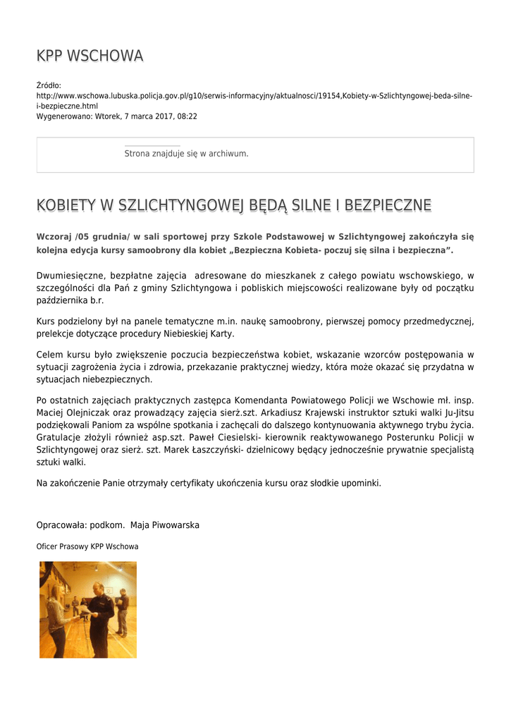 KPP WSCHOWA Źródło: http://www.wschowa.lubuska.policja.gov.pl/g10/serwis-informacyjny/aktualnosci/19154,Kobiety-w-Szlichtyngowej-beda-silnei-bezpieczne.html Wygenerowano: Wtorek, 7 marca 2017, 08:22 Strona znajduje się w archiwum. KOBIETY W SZLICHTYNGOWEJ BĘDĄ SILNE I BEZPIECZNE Wczoraj /05 grudnia/ w sali sportowej przy Szkole Podstawowej w Szlichtyngowej zakończyła się kolejna edycja kursy samoobrony dla kobiet „Bezpieczna Kobieta- poczuj się silna i bezpieczna”. Dwumiesięczne, bezpłatne zajęcia adresowane do mieszkanek z całego powiatu wschowskiego, w szczególności dla Pań z gminy Szlichtyngowa i pobliskich miejscowości realizowane były od początku października b.r. Kurs podzielony był na panele tematyczne m.in. naukę samoobrony, pierwszej pomocy przedmedycznej, prelekcje dotyczące procedury Niebieskiej Karty. Celem kursu było zwiększenie poczucia bezpieczeństwa kobiet, wskazanie wzorców postępowania w sytuacji zagrożenia życia i zdrowia, przekazanie praktycznej wiedzy, która może okazać się przydatna w sytuacjach niebezpiecznych. Po ostatnich zajęciach praktycznych zastępca Komendanta Powiatowego Policji we Wschowie mł. insp. Maciej Olejniczak oraz prowadzący zajęcia sierż.szt. Arkadiusz Krajewski instruktor sztuki walki Ju-Jitsu podziękowali Paniom za wspólne spotkania i zachęcali do dalszego kontynuowania aktywnego trybu życia. Gratulacje złożyli również asp.szt. Paweł Ciesielski- kierownik reaktywowanego Posterunku Policji w Szlichtyngowej oraz sierż. szt. Marek Łaszczyński- dzielnicowy będący jednocześnie prywatnie specjalistą sztuki walki. Na zakończenie Panie otrzymały certyfikaty ukończenia kursu oraz słodkie upominki. Opracowała: podkom. Maja Piwowarska Oficer Prasowy KPP Wschowa Ocena: 5/5 (1) Tweetnij