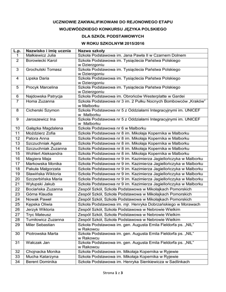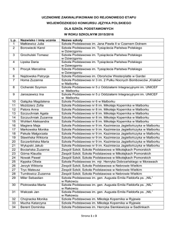UCZNIOWIE ZAKWALIFIKOWANI DO REJONOWEGO ETAPU WOJEWÓDZKIEGO KONKURSU JĘZYKA POLSKIEGO DLA SZKÓŁ PODSTAWOWYCH W ROKU SZKOLNYM 2015/2016 L.p. 1 2 Nazwisko i imię ucznia Małkiewicz Julia Borowiecki Karol 3 Grochulski Tomasz 4 Lipska Daria 5 Procyk Marcelina 6 7 Najdowska Patrycja Homa Zuzanna 8 Cicherski Szymon 9 Jaroszewicz Ina 10 11 12 13 14 15 16 17 18 19 20 21 22 23 24 25 26 27 28 29 Gałązka Magdalena Moździerz Zofia Patora Anna Szczuchniak Agata Szczuchniak Zuzanna Wohlert Aleksandra Magiera Maja Markowska Monika Pakuła Małgorzata Sławińska Wiktoria Szczerbińska Maria Wyłupski Jakub Bociańska Zuzanna Górna Klaudia Nowak Paweł Kępska Oliwia Jerzyk Wiktoria Tryc Mateusz Tumiłowicz Zuzanna Miler Sebastian 30 Piotrowska Marta 31 Walczak Jan 32 33 34 Chojnacka Monika Mucha Katarzyna Berent Dominika Nazwa szkoły Szkoła Podstawowa im. Jana Pawła II w Czarnem Dolnem Szkoła Podstawowa im. Tysiąclecia Państwa Polskiego w Dzierzgoniu Szkoła Podstawowa im. Tysiąclecia Państwa Polskiego w Dzierzgoniu Szkoła Podstawowa im. Tysiąclecia Państwa Polskiego w Dzierzgoniu Szkoła Podstawowa im. Tysiąclecia Państwa Polskiego w Dzierzgoniu Szkoła Podstawowa im. Obrońców Westerplatte w Gardei Szkoła Podstawowa nr 3 im. 2 Pułku Nocnych Bombowców „Kraków” w Malborku Szkoła Podstawowa nr 5 z Oddziałami Integracyjnymi im. UNICEF w Malborku Szkoła Podstawowa nr 5 z Oddziałami Integracyjnymi im. UNICEF w Malborku Szkoła Podstawowa nr 6 w Malborku Szkoła Podstawowa nr 8 im. Mikołaja Kopernika w Malborku Szkoła Podstawowa nr 8 im. Mikołaja Kopernika w Malborku Szkoła Podstawowa nr 8 im. Mikołaja Kopernika w Malborku Szkoła Podstawowa nr 8 im. Mikołaja Kopernika w Malborku Szkoła Podstawowa nr 8 im. Mikołaja Kopernika w Malborku Szkoła Podstawowa nr 9 im. Kazimierza Jagiellończyka w Malborku Szkoła Podstawowa nr 9 im. Kazimierza Jagiellończyka w Malborku Szkoła Podstawowa nr 9 im. Kazimierza Jagiellończyka w Malborku Szkoła Podstawowa nr 9 im. Kazimierza Jagiellończyka w Malborku Szkoła Podstawowa nr 9 im. Kazimierza Jagiellończyka w Malborku Szkoła Podstawowa nr 9 im. Kazimierza Jagiellończyka w Malborku Zespół Szkół, Szkoła Podstawowa w Mikołajkach Pomorskich Zespół Szkół, Szkoła Podstawowa w Mikołajkach Pomorskich Zespół Szkół, Szkoła Podstawowa w Mikołajkach Pomorskich Szkoła Podstawowa im. mjr. Henryka Dobrzańskiego w Morawach Zespół Szkół, Szkoła Podstawowa w Nebrowie Wielkim Zespół Szkół, Szkoła Podstawowa w Nebrowie Wielkim Zespół Szkół, Szkoła Podstawowa w Nebrowie Wielkim Szkoła Podstawowa im. gen. Augusta Emila Fieldorfa ps. „NIL” w Rakowcu Szkoła Podstawowa im. gen. Augusta Emila Fieldorfa ps. „NIL” w Rakowcu Szkoła Podstawowa im. gen. Augusta Emila Fieldorfa ps. „NIL” w Rakowcu Szkoła Podstawowa im. Mikołaja Kopernika w Ryjewie Szkoła Podstawowa im. Mikołaja Kopernika w Ryjewie Szkoła Podstawowa im. Henryka Sienkiewicza w Sadlinkach Strona 1 z 3 35 36 37 38 39 40 41 42 43 44 Kaszowicz Weronika Kępanowska Martyna Piróg Szymon Płachta Łukasz Poniatowski Paweł Machajewska Aurelia Omieczyńska Zuzanna Sędzikowski Juliusz Sikorska Weronika Bożek Magdalena 45 Chrzanowska Dagmara 46 Dubik Przemysław 47 Duchała Julia 48 Jędrzejewski Stanisław 49 Komorniczak Martyna 50 Lemańska Katarzyna 51 Matla Dominika 52 Mosakowska Aniela 53 Piotrowska Dominika 54 Reniecki Jan 55 Ulatowska Aleksandra 56 Woźniak Piotr 57 Wyszyńska Olga 58 59 60 61 62 63 64 65 66 67 68 69 70 71 72 Barganowski Jan Kaźmierski Paweł Kowalska Zuzanna Makos Oliwia Mordzon Liwia Mȕller Wiktor Okliński Mateusz Ostrowska Klaudia Saramak Kinga Tandecka Zuzanna Zboińska Martyna Żmudowska Dominika Brzozowska Dominika Grochowski Tymoteusz Jagielska Jagoda Szkoła Podstawowa im. Henryka Sienkiewicza w Sadlinkach Szkoła Podstawowa im. Henryka Sienkiewicza w Sadlinkach Szkoła Podstawowa im. gen. Józefa Bema w Starym Polu Szkoła Podstawowa im. gen. Józefa Bema w Starym Polu Szkoła Podstawowa im. gen. Józefa Bema w Starym Polu Szkoła Podstawowa nr 2 im. Maksymiliana Golisza w Sztumie Szkoła Podstawowa nr 2 im. Maksymiliana Golisza w Sztumie Szkoła Podstawowa nr 2 im. Maksymiliana Golisza w Sztumie Szkoła Podstawowa nr 2 im. Maksymiliana Golisza w Sztumie Szkoła Podstawowa nr 2 im. mjr. Henryka Sucharskiego w Kwidzynie Szkoła Podstawowa nr 2 im. mjr. Henryka Sucharskiego w Kwidzynie Szkoła Podstawowa nr 2 im. mjr. Henryka Sucharskiego w Kwidzynie Szkoła Podstawowa nr 2 im. mjr. Henryka Sucharskiego w Kwidzynie Szkoła Podstawowa nr 2 im. mjr. Henryka Sucharskiego w Kwidzynie Szkoła Podstawowa nr 2 im. mjr. Henryka Sucharskiego w Kwidzynie Szkoła Podstawowa nr 2 im. mjr. Henryka Sucharskiego w Kwidzynie Szkoła Podstawowa nr 2 im. mjr. Henryka Sucharskiego w Kwidzynie Szkoła Podstawowa nr 2 im. mjr. Henryka Sucharskiego w Kwidzynie Szkoła Podstawowa nr 2 im. mjr. Henryka Sucharskiego w Kwidzynie Szkoła Podstawowa nr 2 im. mjr. Henryka Sucharskiego w Kwidzynie Szkoła Podstawowa nr 2 im. mjr. Henryka Sucharskiego w Kwidzynie Szkoła Podstawowa nr 2 im. mjr. Henryka Sucharskiego w Kwidzynie Szkoła Podstawowa nr 2 im. mjr. Henryka Sucharskiego w Kwidzynie Szkoła Podstawowa nr 4 im. Adama Mickiewicza w Kwidzynie Szkoła Podstawowa nr 4 im. Adama Mickiewicza w Kwidzynie Szkoła Podstawowa nr 4 im. Adama Mickiewicza w Kwidzynie Szkoła Podstawowa nr 4 im. Adama Mickiewicza w Kwidzynie Szkoła Podstawowa nr 4 im. Adama Mickiewicza w Kwidzynie Szkoła Podstawowa nr 4 im. Adama Mickiewicza w Kwidzynie Szkoła Podstawowa nr 4 im. Adama Mickiewicza w Kwidzynie Szkoła Podstawowa nr 4 im. Adama Mickiewicza w Kwidzynie Szkoła Podstawowa nr 4 im. Adama Mickiewicza w Kwidzynie Szkoła Podstawowa nr 4 im. Adama Mickiewicza w Kwidzynie Szkoła Podstawowa nr 4 im. Adama Mickiewicza w Kwidzynie Szkoła Podstawowa nr 4 im. Adama Mickiewicza w Kwidzynie Szkoła Podstawowa Nr 5 im. Zjednoczonej Europy w Kwidzynie Szko