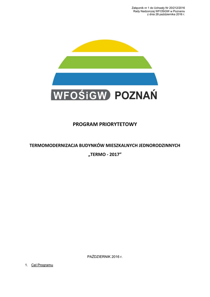 Załącznik nr 1 do Uchwały Nr 20/212/2016 Rady Nadzorczej WFOŚiGW w Poznaniu z dnia 28 października 2016 r. PROGRAM PRIORYTETOWY TERMOMODERNIZACJA BUDYNKÓW MIESZKALNYCH JEDNORODZINNYCH „TERMO - 2017” PAŹDZIERNIK 2016 r. 1. Cel Programu Program Priorytetowy Termomodernizacja budynków mieszkalnych jednorodzinnych „TERMO - 2017” Celem Programu jest poprawa efektywności energetycznej w sektorze mieszkaniowym poprzez termomodernizację budynków jednorodzinnych na obszarze województwa wielkopolskiego, a w konsekwencji ograniczenie lub uniknięcie emisji dwutlenku węgla (CO2). 2. Wskaźniki osiągnięcia celu Ograniczenie lub uniknięcie emisji CO2 co najmniej o 1500 Mg/rok, przy założeniu pełnego wykorzystania budżetu Programu. 3. Budżet Na realizację celu Programu przeznacza się kwotę w wysokości do 10 000 000,00 zł. 4. Okres wdrażania 1. Program realizowany będzie w latach 2017-2020, przy czym: 1) umowy pożyczki będą zawierane do końca 2017 r., 2) wypłata środków będzie następować do końca 2020 r. 2. Termin zakończenia realizacji przedsięwzięcia objętego maksymalnie 24 miesiące od daty zawarcia umowy pożyczki. pomocą finansową wynosi 5. Beneficjenci Osoby fizyczne. 6. Rodzaje przedsięwzięć 1. Prace termomodernizacyjne w budynkach jednorodzinnych wybudowanych przed rokiem 1999, tj. przed datą wejścia w życie Ustawy o wspieraniu przedsięwzięć termomodernizacyjnych (Dz. U. 1998 nr 162, poz. 1121), w tym: 1) ocieplenie ścian zewnętrznych, dachów, stropodachów, podłóg na gruncie, stropów nad/pod nieogrzewanymi pomieszczeniami, 2) wymiana stolarki okiennej i drzwiowej, bram garażowych. Zakres rzeczowy przedsięwzięcia musi wynikać z audytu energetycznego budynku, wykonanego zgodnie z Rozporządzeniem Ministra Infrastruktury z dnia 17 marca 2009 r. w sprawie szczegółowego zakresu i form audytu energetycznego oraz części audytu remontowego, wzorów kart audytów, a także algorytmu oceny opłacalności przedsięwzięcia termomodernizacyjnego (Dz.U.2009 nr 43 poz. 346 ze zm.) i zagwarantować minimalną oszczędność energii dla termomodernizowanego budynku na poziomie: co najmniej 15% - w budynkach, w których po 1984 r. przeprowadzono modernizację systemu grzewczego, co najmniej 25% - w pozostałych budynkach. 2. Jeśli wynika to z opracowanego audytu energetycznego, uzupełnieniem prac wskazanych w p. 6.1 pp. 1) i/lub 2) może być modernizacja/ wymiana źródła ciepła wraz z ewentualną modernizacją/ wymianą instalacji c.o. i c.w.u., obejmująca zakup i montaż: 2/5 Program Priorytetowy Termomodernizacja budynków mieszkalnych jednorodzinnych „TERMO - 2017” kotłów olejowych, kotłów gazowych, kotłów gazowo-olejowych, ogrzewania elektrycznego, wymiennika ciepła, kotłów na paliwa stałe, przy czym, w przypadku kotłów opalanych paliwami stałymi - muszą one spełniać następujące warunki: posiadać certyfikat zgodności z normą PN-EN 303-5:2012 „Kotły grzewcze - Część 5: Kotły grzewcze na paliwa stałe z ręcznym i automatycznym zasypem paliwa o mocy nominalnej do 500 kW - Terminologia, wymagania, badania i oznakowanie” lub równoważną, wydany przez właściwą jednostkę certyfikującą, spełniać wymagania klasy 5. 3. Elementem uzupełniającym prace wskazane w punkcie 6.1 pp. 1) i/lub 2) może być również zakup i montaż mikroinstalacji (o mocy do 40 kW) w zakresie odnawialnych źródeł energii (OZE - systemy zaopatrzenia w ciepło i energię elektryczną), w tym: 1) systemów grzewczych z zastosowaniem pomp ciepła, 2) systemów fotowoltaicznych, 3) kolektorów słonecznych. 7. Koszty kwalifikowane 1. Za kwalifikowane mogą być uznane koszty poniesione od momentu złożenia wniosku o udzielenie pomocy finansowej do dnia 31.12.2019 r. 2. Kosztami kwalifikowanymi przedsięwzięcia mogą być jedynie koszty w bezpośrednim związku z celami przedsięwzięcia objętego pomocą finansową. pozostające 3. Koszty kwalifikowane przedsięwzięcia mogą obejmować: 1) zakup, montaż i uruchomienie fabrycznie nowych materiałów i urządzeń, 2) roboty budowlane i usługi niezbędne do realizacji przedsięwzięcia, 3) podatek od towarów i usług (VAT), jeżeli Wnioskodawca nie ma prawnej możliwości jego odliczenia lub odzyskania, 4) koszt wykonania audytu energetycznego budynku, 5) koszt wykonania dokumentacji projektowej (jeżeli jest wymagana). 4. Maksymalna łączna wysokość kosztów kwalifikowanych w ramach kosztów wskazanych w punkcie 7.3 pp. 4) i 5) nie może przewyższać 10% łącznych kosztów kwalifikowanych przedsięwzięcia. 5. Pomoc finansowa może zostać udzielona na przedsięwzięcie, które nie zostało zakończone przed dniem złożenia wniosku o udzielenie pomocy finansowej. 8. Terminy i sposób składania wniosków 3/5 Program Priorytetowy Termomodernizacja budynków mieszkalnych jednorodzinnych „TERMO - 2017” Termin, sposób składania i rozpatrywania wniosków, określony zostanie odpowiednio w ogłoszeniu o naborze lub w regulaminie naboru, który zamieszczony będzie na stronie internetowej Funduszu. 9. Szczegółowe zasady udzielania pomocy finansowej Poniższe szczegółowe zasady wynikają z „Zasad udzielania i umarzania pożyczek oraz trybu i zasad udzielania i rozliczania dotacji ze środków WFOŚiGW w Poznaniu w roku 2017”: 1. Formy pomocy finansowej Pożyczka z możliwością umorzenia do 30%. 2. Intensywność pomocy finansowej Do 100% kosztów kwalifikowanych. 3. Warunki pomocy finansowej 1) Oprocentowanie w wysokości 0,5 s.r.w. w stosunku rocznym, lecz nie mniej niż 2,8% w stosunku rocznym. Odsetki z tytułu oprocentowania spłacane są na bieżąco w okresach miesięcznych. 2) Minimalny okres spłaty pożyczki wraz z należnymi odsetkami wynosi 2 lata od wypłaty ostatniej transzy pożyczki. W przypadku wcześniejszej całkowitej spłaty pożyczki wraz z należnymi odsetkami, nie będzie ona podlegać umorzeniu. 3) Maksymalny okres trwania um