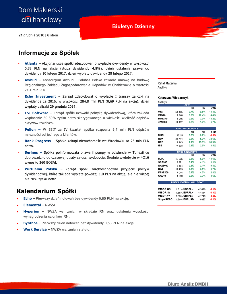 Biuletyn Dzienny 21 grudnia 2016 | 6 stron Informacje ze Spółek Atlanta – Akcjonariusze spółki zdecydowali o wypłacie dywidendy w wysokości 0,33 PLN na akcję (stopa dywidendy 4,8%), dzień ustalenia prawa do dywidendy 10 lutego 2017, dzień wypłaty dywidendy 28 lutego 2017. Awbud – Konsorcjum Awbud i Falubaz Polska zawarło umowę na budowę Regionalnego Zakładu Zagospodarowania Odpadów w Chabierowie o wartości 71,1 mln PLN. Echo Investment – Zarząd zdecydował o wypłacie I transzy zaliczki na dywidendę za 2016, w wysokości 284,8 mln PLN (0,69 PLN na akcję), dzień Rafał Materka Analityk Katarzyna Włodarczyk Analityk wypłaty zaliczki 29 grudnia 2016. LSI Software – Zarząd spółki uchwalił politykę dywidendową, która zakłada wypłacenie 30-50% zysku netto skorygowanego o wielkości wielkość odpisów aktywów trwałych. WIG WIG20 mWIG40 sWIG80 51 485 1 940 4 216 14 102 Pelion – W EBIT za IV kwartał spółka rozpozna 9,7 mln PLN odpisów należności od jednego z klientów. Rank Progress – Spółka zakupi nieruchomość we Wrocławiu za 25 mln PLN netto. Serinus – Spółka poinformowała o awarii pompy w odwiercie w Tunezji co doprowadziło do czasowej utraty całości wydobycia. Średnie wydobycie w 4Q16 wynosiło 260 BOE/d. GPW Wirtualna Polska – Zarząd spółki zarekomendował przyjęcie polityki dywidendowej, które zakłada wypłatę powyżej 1,0 PLN na akcję, ale nie więcej niż 70% zysku netto. 1D 0.7% 0.8% 0.6% 0.2% 1M 9.8% 12.4% 7.0% 1.4% YTD 10.8% 4.4% 18.2% 6.7% 1M 6.7% 5.3% 15.3% 2.9% YTD -0.5% 32.6% 50.9% 8.5% 1M 5.9% 4.1% 3.1% 7.5% 4.0% 7.7% YTD 14.6% 11.1% 9.5% 6.7% 12.8% 4.6% RYNKI WSCHODZĄCE MSCI BUX RTS ISE 122.5 31 714 1 143 77 808 1D 0.5% 0.2% 1.1% 0.8% RYNKI ROZWINIĘTE DJIA S&P500 NASDAQ DAX FTSE100 CAC40 19 975 2 271 5 484 11 465 7 044 4 850 1D 0.5% 0.4% 0.5% 0.3% 0.4% 0.6% RYNEK PIENIĘŻNY I WALUTOWY Kalendarium Spółki Echo – Pierwszy dzień notowań bez dywidendy 0,85 PLN na akcję. Elemental – NWZA. Hyperion – NWZA ws. zmian w składzie RN oraz ustalenia wysokości wynagrodzenia członków RN. Synthos – Pierwszy dzień notowań bez dywidendy 0,53 PLN na akcję. Work Service – NWZA ws. zmian statutu. WIBOR O/N WIBOR 1M WIBOR 1Y Stopa REPO 1.61% 1.66% 1.85% 1.50% USDPLN EURPLN CHFPLN EURUSD 4.2470 4.4114 4.1249 1.0387 Biuro Analiz DMBH -0.1% -0.3% -0.4% -0.1% Biuletyn dzienny 21 grudnia 2016 Kalendarium Makro GUS – Wskaźnik koniunktury w budownictwie w grudniu (w listopadzie -12,3 pkt). GUS – Wskaźnik koniunktury w handlu detalicznym w grudniu (w listopadzie 4 pkt). GUS – Wskaźnik koniunktury w przemyśle w grudniu (w listopadzie -1,8 pkt). GUS – Bieżący wskaźnik ufności konsumenckiej w grudniu (w listopadzie -2,4 pkt.). GUS – Wyprzedzający wskaźnik ufności konsumenckiej w grudniu (w listopadzie -5,4 pkt.). Wezwania Kofola – KSM Investment ogłosił wezwanie do sprzedaży 1.038 akcji (0,0047% kapitału zakładowego), oferowana cena 78,6 PLN za udział. Zapisy potrwają od 4 stycznia do 6 lutego 2 017. Biuletyn dzienny 21 grudnia 2016 Wskaźniki Spółek (1) C/Z Spółka C/WK EV/EBITDA Kurs 2015 2016 2017 2015 2016 2017 2015 2016 2017 69 10.4 13.7 13.3 1.1 1.0 1.0 49.1 5.1 4.9 199.50 22.9 16.1 15.3 8.5 7.3 6.7 10.9 7.7 6.8 ELEKTROBUDOWA 94.89 7.4 9.5 10.4 1.2 1.1 1.0 5.5 4.2 4.2 TRAKCJA PRKiI 12.85 11.4 12.4 14.8 0.9 0.9 0.8 5.9 5.2 6.4 13.2 12.3 11.6 11.7 0.8 0.8 0.8 3.5 3.5 3.7 10.01 -10.2 5.2 5.8 0.4 0.4 0.3 4.3 5.3 5.8 9.17 4.6 23.2 6.8 0.4 0.4 0.4 3.8 4.6 4.8 EUROCASH 37.78 24.8 24.4 22.1 4.7 4.5 4.1 11.9 11.3 10.3 FARMACOL 52.00 14.0 13.5 12.9 1.0 0.9 0.9 8.8 8.4 7.5 62.7 10.2 12.5 12.2 1.0 0.9 0.9 5.9 6.3 6.1 279.7 26.4 16.6 13.1 3.3 2.8 2.3 18.5 13.0 10.8 BOGDANKA BUDIMEX ELECTRICA ENEA ENERGA GRUPA AZOTY INTERCARS JSW 73 -2.6 -24.5 -19.9 2.2 2.5 2.8 -4.4 17.0 17.2 KETY 382.50 17.2 13.2 15.6 2.8 2.6 2.5 11.3 9.8 9.6 KGHM 92.29 17.5 14.9 16.8 0.9 0.9 0.8 -5.1 4.3 4.5 LPP 5640 29.1 36.9 27.5 5.4 4.9 4.3 15.0 17.4 13.8 NEUCA 388.00 19.8 18.1 16.4 3.3 3.0 2.6 12.6 11.5 10.3 CCC 196 29.0 29.3 22.9 6.7 5.9 5.0 24.9 20.0 15.7 ORANGE POLSKA 5.28 27.9 73.3 -129.3 0.6 0.6 0.6 3.2 3.8 4.7 24 13.2 15.2 13.5 1.5 1.3 1.2 7.4 7.5 7.4 ORBIS 70.00 17.8 18.0 16.4 1.8 1.7 1.6 8.9 9.1 8.5 PELION 49.20 21.4 13.5 13.6 0.8 0.8 0.7 5.6 8.5 8.2 PGE 10.58 -9.3 7.1 7.7 0.5 0.5 0.4 3.6 5.1 5.9 5.62 15.5 14.0 13.4 1.1 1.1 1.0 6.1 5.9 5.6 47 21.5 114.3 28.0 0.6 0.6 0.6 3.6 4.7 4.2 84.77 12.8 8.9 9.4 1.6 1.4 1.3 7.3 5.7 5.9 LOTOS 39.7 -27.9 12.6 8.8 1.0 0.9 0.8 13.1 6.1 6.2 TAURON 2.97 -3.0 6.3 6.3 0.3 0.3 0.3 456.3 5.1 5.5 ZE PAK 12.92 -0.3 2.5 2.2 0.3 0.3 0.3 -1.7 3.8 3.0 CYFROWY POLSAT PGNIG PKP CARGO PKN Źródło: DMBH Wskaźniki Spółek (2) C/Z Spółka C/WK ROE Kurs 2015 2016 2017 2015 2016 2017 2015 2016 2017 5.4 10.1 13.0 10.5 1.0 0.9 0.9 9% 11% 8% m BANK 345.95 12.3 15.2 13.7 1.2 1.1 1.0 11% 9% 8% BZ WBK 323.5 15.6 17.5 15.2 1.7 1.6 1.4 13% 11% 10% ING BSK 159.80 17.6 17.9 16.9 1.9 1.8 1.8 11% 12% 11% PEKAO 124.4 13.0 16.8 15.1 1.4 1.4 1.4 10% 10% 9% PKO BP 27.98 11.7 13.8 11.8 1.2 1.1 1.0 9% 9% 9% BGŻ BNPP 56.1 33.6 37.8 13.8 0.8 0.7 0.7 0% 3% 5% GETIN NOBLE BANK 1.25 6.7 37.2 4.9 0.2 0.2 0.2 1% 1% 4% GETIN HOLDING 1.05 5.5 2.9 5.8 0.4 0.4 0.4 7% 14% 6% PZU 33.10 12.6 16.0 13.4 2.2 2.2 2.1 18% 14% 16% GPW 39.50 13.4 12.6 12.1 2.3 2.2 2.1 17% 18% 18% 1.74 3.4 -2.1 23.3 0.2 0.3 0.4 8% -13% 1% BANK MILLENNIUM OPEN FINANCE Źródło: DMBH Biuletyn dzienny 21 grudnia 2016 Informacja Dodatkowa PRZED PRZYSTĄPIENIEM PRZEZ PAŃSTWA DO LEKTURY BIULETYNU DMBH INFORMUJE, ŻE: Niniejszy biuletyn został sporządzony przez Dom Maklerski Banku Handlowego S.A. (zwany dalej DMBH). Sporządzanie i udostępnianie biuletynu nie stanowi działalności maklerskiej w rozumieniu art. 69 ustawy z dnia 29 lipca 2005 r. o obrocie instrumentami finansowymi i jest wykonywane w ramach działalności poza maklerskiej. Biuletyn został przygotowany na podstawie dostępnych i wiarygodnych danych z zastrzeż eniem, że DMBH nie