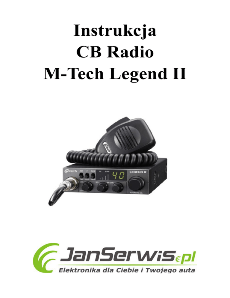 Instrukcja CB Radio M-Tech Legend II URUCHOMIENIE RADIOTELEFONU CB Najpierw należy podłączyć antenę do gniazda antenowego, zamocowanego z tyłu radiotelefonu (gniazdo nr 12). Nastepnie podłaczamy mikrofon do gniazda mikrofonowego (7). Dopiero na końcu należy podłaczyć kabel zasilajacy radiotelefon. Przewód czerwony podłączamy do +12V, a przewód czarny do -12V. Należy bezwzgklędnie pamiętać, że nie wolno uruchamiać radiotelefonu CB bez podłaczonej i zestrojonej anteny nadawczo-odbiorczej. Przed instalowaniem CB M-Tech LEGEND II. Prosze dokładnie sprawdzić rodzaj instalacji elektrycznej swojego samochodu. Próba samodzielnego montażu CB Radio w samochodzie wymaga pewnego doświadczenia elektrotechnicznego, dlatego też osoby nie posiadające takiego doświadczenia powinny skorzystać z usług specjalisty. Regulacje i wskaźniki 1. Przełącznik AM/FM – pozwala wybrać rządaną modulację. 2. Przełącznik konfiguracji umożliwiawybór norny kraju, w którym zamierzamy działać. 3. Przełącznik “szybka 19” - włącza radio automatycznie na kanał drogowy “19”. 4. Wskaźnik nośnej “TX” - włacza sie w momencie, gdy radio nadaje. 5. Wskaźniki S/RF – wskazuje siłę sygnału nadawczego. 6. Wskaźnik kanału – wyświetla aktualnie używany kanał. 7. Gniazdo mikrofonowe – tu podłaczamy mikrofon. 8. Pokrętło Volume ON/OFF – włacznik I wyłącznik radia a także regulacja głośności. 9. Pokrętło squelch – eliminuje niepożądane zakłócenia umożliwiająć komfortowy nasłuch. 10. Pokrętło RF Gain – służy do regulacji czułości radia. 11. Pokrętło wyboru kanalu – pozwala wybrać 1 z 40 kanałów na których chcemy prowadzić łączność. 12. Gniazdo antenowe – tu podłączamy antenę. 13. Gniazdo głośnika dodatkowego – użyteczne np w przypadku gdy radio zabudowane jest e desce rozdzielczej. 14. Kabel zasilający 12V – do podłaczenia na stałe bądź przez wtyk do gniazda zapalniczki. 15. Kapsułka z bezpiecznikiem. 16. Przycisk PTT (Push-to-talk) – przycisk służący do rozpoczęcia nadawania. WYBIERANIE NORMY KRAJU: 1. Wyłącz radio (Pokrętło ON/OFF). 2. Przełącznik konfiguracji (F/OFF) ustaw w pozycji “F”. 3. Włącz radio (Pokrętło ON/OFF). 4. Wybierz pożądaną konfigurację pokrętłem zmiany kanałów (tabela konfiguracji na sąsiedniej stronie). 5. Przełącznik konfiguracji (F/OFF) ustaw w pozycji OFF“. 6. Dla zatwierdzenia wybranej konfiguracji wyłącz I włacz radio. TABELA KONFIGURACJI DANE TECHNICzNE CB M-TECH LEGEND II: - Częstotliwość 26,960-27,400 MHz - Moc wyjściowa - max 4 W - Typy modulacji AM, FM - Napięcie zasilania: 13.8 V - Pobór prądu: Nadajnik-1.3 A, Odbiornik - 200 mA WYMIARY: - Szerokość: 115mm - Wysokość: 35mm - Głębokość: 180mm ODBIÓR 1. Upewnij się czy antena, źródło pradu i mikrofon podłaczone są do odpowiednich gniazd. 2. Włacz radio przekręcajac pokrętło ON/OFF VOL (8) zgodnie z kierunkiem ruchu wskazówek zegara. 3. Ustaw SQUELCH (9) tak, żeby przy braku sygnału wejściowego szumy znikły. Odbiornik będzie teraz cichy, aż do momentu otrzymania właściwego sygnału. Nie zakręcaj blokady mocno, gdyż nie usłyszysz słabszych odleglejszych stacji. 4. Ustaw przełacznik kanaów CHANNEL (11) na wybranym przez siebie kanale. NADAWANIE 1. Przełącznikiem kanaów CHANNEL (11) wybierz pożadany kanał. 2. Jeśli kanał jest wolny, naciśnij przycisk nadawania znajdujacy się z boku mikrofonu i zacznij mówić wyraźnym naturalnym głosem. Krzyczenie do mikrofonu nie zwiększa poziomu ani mocy sygnału. Prawidłowe usuwanie produktu – – – – – Nie wyrzucaj urządzeń elektrycznych razem z innymi odpadami komunalnymi. Urzyj oddzielnych punktów zbiórki odpadów. W celu uzyskania informacji na temat miejsca i sposobu bezpiecznego dla środowiska recyklingu tego produktu użytkownicy w gospodarstwach domowych powinni skontaktować się z punktem sprzedaży detalicznej, w którym dokonali zakupu produktu, lub z organem władz lokalnych. Opakowanie może być poddane recyklingowi. Gospodarstwo domowe pełni rolę w przyczynianiu się do ponownego użycia i odzysku, w tym recyklingu zużytego sprzętu elektrycznego. Przestrzeganie zasad selektywnej zbiórki sprzętu ma zapewnić właściwy poziom zdrowia ludzkiego i ochrony środowiska naturalnego.