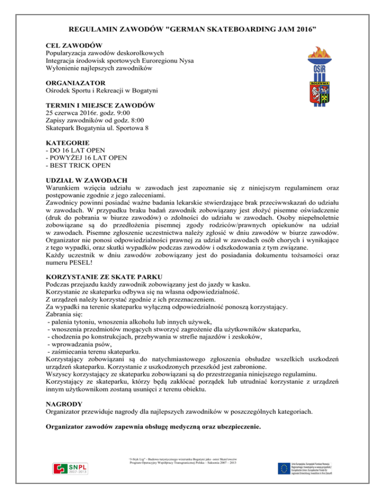 REGULAMIN ZAWODÓW "GERMAN SKATEBOARDING JAM 2016” CEL ZAWODÓW Popularyzacja zawodów deskorolkowych Integracja środowisk sportowych Euroregionu Nysa Wyłonienie najlepszych zawodników ORGANIAZATOR Ośrodek Sportu i Rekreacji w Bogatyni TERMIN I MIEJSCE ZAWODÓW 25 czerwca 2016r. godz. 9:00 Zapisy zawodników od godz. 8:00 Skatepark Bogatynia ul. Sportowa 8 KATEGORIE - DO 16 LAT OPEN - POWYŻEJ 16 LAT OPEN - BEST TRICK OPEN UDZIAŁ W ZAWODACH Warunkiem wzięcia udziału w zawodach jest zapoznanie się z niniejszym regulaminem oraz postępowanie zgodnie z jego zaleceniami. Zawodnicy powinni posiadać ważne badania lekarskie stwierdzające brak przeciwwskazań do udziału w zawodach. W przypadku braku badań zawodnik zobowiązany jest złożyć pisemne oświadczenie (druk do pobrania w biurze zawodów) o zdolności do udziału w zawodach. Osoby niepełnoletnie zobowiązane są do przedłożenia pisemnej zgody rodziców/prawnych opiekunów na udział w zawodach. Pisemne zgłoszenie uczestnictwa należy zgłosić w dniu zawodów w biurze zawodów. Organizator nie ponosi odpowiedzialności prawnej za udział w zawodach osób chorych i wynikające z tego wypadki, oraz skutki wypadków podczas zawodów i odszkodowania z tym związane. Każdy uczestnik w dniu zawodów zobowiązany jest do posiadania dokumentu tożsamości oraz numeru PESEL! KORZYSTANIE ZE SKATE PARKU Podczas przejazdu każdy zawodnik zobowiązany jest do jazdy w kasku. Korzystanie ze skateparku odbywa się na własna odpowiedzialność. Z urządzeń należy korzystać zgodnie z ich przeznaczeniem. Za wypadki na terenie skateparku wyłączną odpowiedzialność ponoszą korzystający. Zabrania się: - palenia tytoniu, wnoszenia alkoholu lub innych używek, - wnoszenia przedmiotów mogących stworzyć zagrożenie dla użytkowników skateparku, - chodzenia po konstrukcjach, przebywania w strefie najazdów i zeskoków, - wprowadzania psów, - zaśmiecania terenu skateparku. Korzystający zobowiązani są do natychmiastowego zgłoszenia obsłudze wszelkich uszkodzeń urządzeń skateparku. Korzystanie z uszkodzonych przeszkód jest zabronione. Wszyscy korzystający ze skateparku zobowiązani są do przestrzegania niniejszego regulaminu. Korzystający ze skateparku, którzy będą zakłócać porządek lub utrudniać korzystanie z urządzeń innym użytkownikom zostaną usunięci z terenu obiektu. NAGRODY Organizator przewiduje nagrody dla najlepszych zawodników w poszczególnych kategoriach. Organizator zawodów zapewnia obsługę medyczną oraz ubezpieczenie. Lig" - Budowa turystycznego wizerunku Bogatyni jako ostoi Skate'owców Program Operacyjny Współpracy Transgranicznej Polska – Saksonia 2007 – 2013 "3-Styk