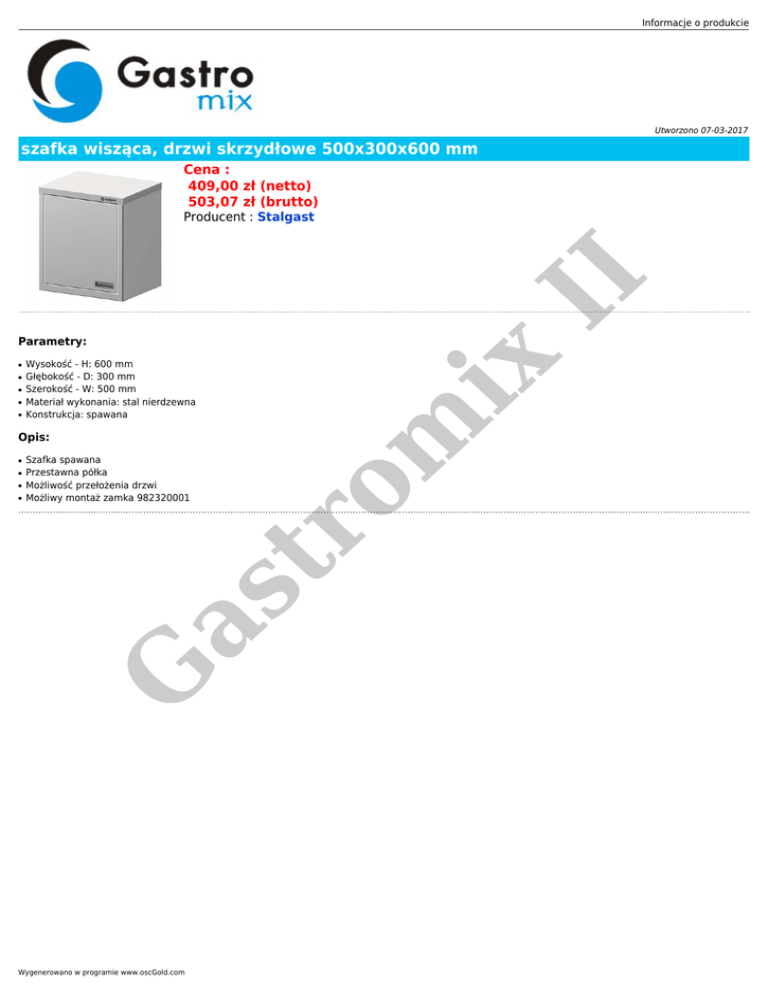Informacje o produkcie Utworzono 07-03-2017 szafka wisząca, drzwi skrzydłowe 500x300x600 mm Cena : 409,00 zł (netto) 503,07 zł (brutto) II Producent : Stalgast ● ● ● ● Wysokość - H: 600 mm Głębokość - D: 300 mm Szerokość - W: 500 mm Materiał wykonania: stal nierdzewna Konstrukcja: spawana m ● ix Parametry: ● ● ● G as ● Szafka spawana Przestawna półka Możliwość przełożenia drzwi Możliwy montaż zamka 982320001 tr o Opis: Wygenerowano w programie www.oscGold.com