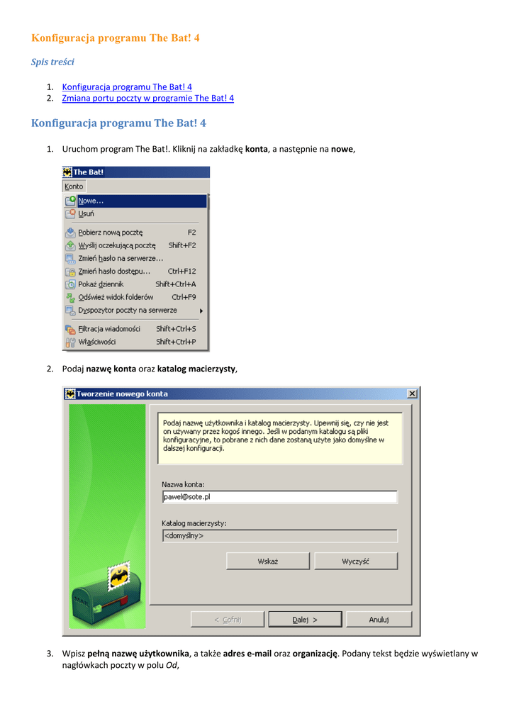 Konfiguracja programu The Bat! 4 Spis treści 1. Konfiguracja programu The Bat! 4 2. Zmiana portu poczty w programie The Bat! 4 Konfiguracja programu The Bat! 4 1. Uruchom program The Bat!. Kliknij na zakładkę konta, a następnie na nowe, 2. Podaj nazwę konta oraz katalog macierzysty, 3. Wpisz pełną nazwę użytkownika, a także adres e-mail oraz organizację. Podany tekst będzie wyświetlany w nagłówkach poczty w polu Od, 4. Uzupełnij adres serwera do odbioru poczty i adres serwera SMTP do wysyłki poczty oraz zaznacz checkbox serwer SMTP wymaga uwierzytelnienia, 5. Podaj login (użytkownik) i hasło, 6. Wybierz opcję tak dla sprawdzenia ustawień konta i wciśnij przycisk zakończ, 7. Z menu wybierz serwery, a w sekcji wysyłka poczty (SMTP) kliknij na przycisk uwierzytelnienie, 8. Checkbox uwierzytelnienie dla SMTP (wg RFC 2554) oraz opcja użyj ustawień jak dla pobierania poczty powinny być zaznaczone, Zmiana portu poczty w programie The Bat! 4 1. Uruchom program The Bat!. Kliknij prawym przyciskiem myszy na nazwę konta i wybierz właściwości, 2. Z menu wybierz serwery, a w sekcji wysyłka poczty (SMTP) zmień port z 25, na 587 3. Teraz wciśnij przycisk OK. Od tego momentu poczta wychodząca będzie wysyłana przez port 587. Źródło: http://www.sote.pl/trac/wiki/hosting/bat