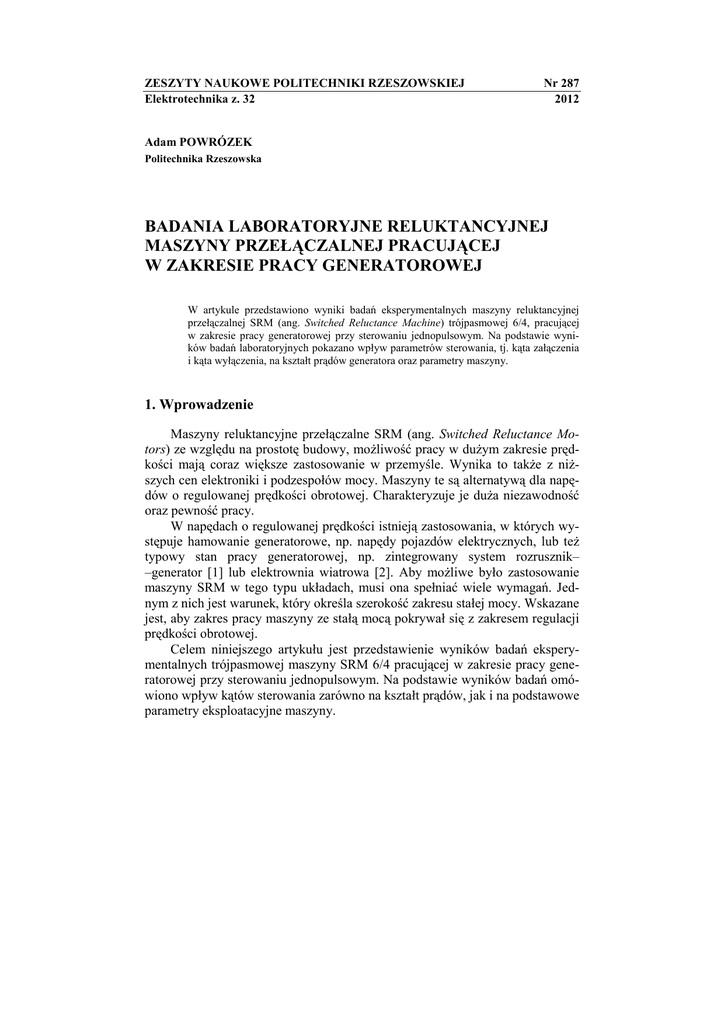ZESZYTY NAUKOWE POLITECHNIKI RZESZOWSKIEJ Elektrotechnika z. 32 Nr 287 2012 Adam POWRÓZEK Politechnika Rzeszowska BADANIA LABORATORYJNE RELUKTANCYJNEJ MASZYNY PRZEŁĄCZALNEJ PRACUJĄCEJ W ZAKRESIE PRACY GENERATOROWEJ W artykule przedstawiono wyniki badań eksperymentalnych maszyny reluktancyjnej przełączalnej SRM (ang. Switched Reluctance Machine) trójpasmowej 6/4, pracującej w zakresie pracy generatorowej przy sterowaniu jednopulsowym. Na podstawie wyników badań laboratoryjnych pokazano wpływ parametrów sterowania, tj. kąta załączenia i kąta wyłączenia, na kształt prądów generatora oraz parametry maszyny. 1. Wprowadzenie Maszyny reluktancyjne przełączalne SRM (ang. Switched Reluctance Motors) ze względu na prostotę budowy, moŜliwość pracy w duŜym zakresie prędkości mają coraz większe zastosowanie w przemyśle. Wynika to takŜe z niŜszych cen elektroniki i podzespołów mocy. Maszyny te są alternatywą dla napędów o regulowanej prędkości obrotowej. Charakteryzuje je duŜa niezawodność oraz pewność pracy. W napędach o regulowanej prędkości istnieją zastosowania, w których występuje hamowanie generatorowe, np. napędy pojazdów elektrycznych, lub teŜ typowy stan pracy generatorowej, np. zintegrowany system rozrusznik– –generator [1] lub elektrownia wiatrowa [2]. Aby moŜliwe było zastosowanie maszyny SRM w tego typu układach, musi ona spełniać wiele wymagań. Jednym z nich jest warunek, który określa szerokość zakresu stałej mocy. Wskazane jest, aby zakres pracy maszyny ze stałą mocą pokrywał się z zakresem regulacji prędkości obrotowej. Celem niniejszego artykułu jest przedstawienie wyników badań eksperymentalnych trójpasmowej maszyny SRM 6/4 pracującej w zakresie pracy generatorowej przy sterowaniu jednopulsowym. Na podstawie wyników badań omówiono wpływ kątów sterowania zarówno na kształt prądów, jak i na podstawowe parametry eksploatacyjne maszyny. 32 A. Powrózek 2. Praca generatorowa maszyny SRM Maszyna SRM moŜe pracować w trybie pracy silnikowej i generatorowej. Dobór kątów sterujących, tj. kąta załączenia θon oraz kąta wyłączenia θoff, dostosowuje się do trybu pracy maszyny. Podczas pracy generatorowej kąt załączenia θon jest tak dobierany, aby prąd pasma płynął, gdy pochodna dL/dθ < 0, w przypadku zaś pracy silnikowej – aby pochodna dL/dθ > 0. Podczas pracy generatorowej napięcie rotacji urot ma wartość ujemną. Dzięki temu moŜliwy jest wzrost prądu pasma przy duŜej prędkości obrotowej. Amplituda napięcia rotacji jest proporcjonalna do prędkości wirnika i napięcie to wpływa na kształt prądu pasmowego. Na rysunku 1a pokazano przepływ energii dla stanu wzbudzenia maszyny, natomiast na rys. 1b przepływ energii dla stanu generacji. Na rysunku 2. pokazano zaś prąd pasma, strumień sprzęŜony na tle wyidealizowanej indukcyjności własnej pasma maszyny SRM pracującej jako generator. a) b) i in a) i dc b) T1 T1 D1 off i out i ph W U dc D1 on i ph W Pasmo A u rot C U dc Pasmo A T2 T2 i out D2 D2 on u rot C off Rys. 1. Kierunek przepływu energii dla jednego pasma maszyny SRM: a) dla stanu wzbudzenia, b) dla stanu generacji Ψph L i ph i out i in θ on θ off θ ex θ Rys. 2. Prąd pasma (iph), strumień sprzęŜony (Ψph) na tle wyidealizowanej indukcyjności własnej pasma (L) Badania laboratoryjne reluktancyjnej maszyny przełączalnej ... 33 W przedziale od θon do θoff pasmo jest zasilane ze źródła i w tym przedziale jest gromadzona energia w polu magnetycznym. Po wyłączeniu tranzystorów (θoff) prąd wciąŜ płynie przez diody D1, D2, zwracając zgromadzoną energię do źródła zasilania, aŜ do momentu zaniku prądu (θex). Gdy ilość energii zwróconej jest większa niŜ pobranej, występuje tryb pracy generatorowej, natomiast gdy ilość energii pobranej jest większa niŜ zwróconej, występuje tryb pracy hamulcowej. Sterowanie maszyną SRM pracującą jako generator Zakładając analogię do pracy silnikowej, moŜna przyjąć, Ŝe maszyna SRM moŜe być sterowana w zakresie pracy generatorowej [3]: • prądowo, • napięciowo z regulacją współczynnika wypełnienia, • jednopulsowo. Zasadniczą róŜnicą jest praca przy opadającym zboczu indukcyjności własnej pasma. Sterowanie jednopulsowe jest szczególnym przypadkiem sterowania napięciowego, gdy współczynnik wypełnienia sygnału PWM wynosi 1. W przypadku pracy generatorowej ma ono szczególne znaczenie. Maszynę SRM pracującą jako generator projektuje się najczęściej tak, aby sterowanie jednopulsowe pokrywało cały zakres zmian prędkości obrotowej powyŜej prędkości bazowej. Kąty sterowania są tak dobierane, aby otrzymać wymaganą średnią moc wyjściową Poutav lub średni prąd Idcav. Jednak jednocześnie naleŜy kontrolować napięcie na zaciskach maszyny Udc, dlatego teŜ kąty sterowania muszą być nie tylko uzaleŜnione od prędkości n, ale takŜe od wartości napięcia na zaciskach maszyny Udc [4]. 3. Sposoby konfiguracji uzwojeń biegunów pasma fazowego W zaleŜności od liczby biegunów (Na) przypadających na jedno pasmo uzwojenia biegunów maszyny SRM mogą być konfigurowane na kilka sposobów. W przypadku badanej maszyny SRM 6/4, gdzie dwa bieguny przypadały na jedno pasmo (Na = 2), uzwojenia były łączone: • szeregowo, • równolegle. Połączenie szeregowe jest najpowszechniej stosowanym rozwiązaniem i w tym przypadku prąd uzwojenia bieguna jest jednocześnie prądem pasma. Stosowane jest głównie w rozwiązaniach niskoobrotowych. W przypadku połączenia równoległego uzwojeń biegunów pasma prąd pasmowy jest sumą prądów pochodzących od uzwojeń biegunów tworzących pasmo i ma zastosowanie głównie w rozwiązaniach wysokoobrotowych. PoniewaŜ prąd pasmowy jest sumą prądów pochodzących od obu uzwojeń biegunów, stwarza to większe wymagania prądowe dla źródła zasilania, i dlatego teŜ jest rzadko stosowane w prakt