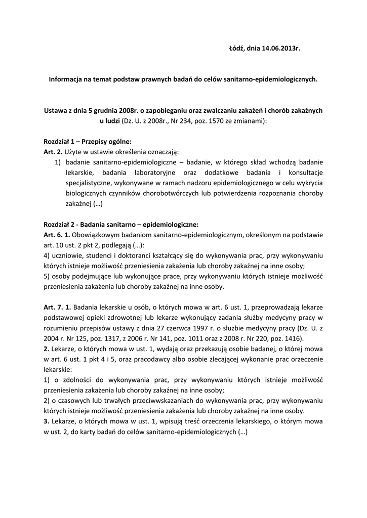 Łódź, dnia 14.06.2013r. Informacja na temat podstaw prawnych badań do celów sanitarno-epidemiologicznych. Ustawa z dnia 5 grudnia 2008r. o zapobieganiu oraz zwalczaniu zakażeń i chorób zakaźnych u ludzi (Dz. U. z 2008r., Nr 234, poz. 1570 ze zmianami): Rozdział 1 – Przepisy ogólne: Art. 2. Użyte w ustawie określenia oznaczają: 1) badanie sanitarno-epidemiologiczne – badanie, w którego skład wchodzą badanie lekarskie, badania laboratoryjne oraz dodatkowe badania i konsultacje specjalistyczne, wykonywane w ramach nadzoru epidemiologicznego w celu wykrycia biologicznych czynników chorobotwórczych lub potwierdzenia rozpoznania choroby zakaźnej (…) Rozdział 2 - Badania sanitarno – epidemiologiczne: Art. 6. 1. Obowiązkowym badaniom sanitarno-epidemiologicznym, określonym na podstawie art. 10 ust. 2 pkt 2, podlegają (…): 4) uczniowie, studenci i doktoranci kształcący się do wykonywania prac, przy wykonywaniu których istnieje możliwość przeniesienia zakażenia lub choroby zakaźnej na inne osoby; 5) osoby podejmujące lub wykonujące prace, przy wykonywaniu których istnieje możliwość przeniesienia zakażenia lub choroby zakaźnej na inne osoby. Art. 7. 1. Badania lekarskie u osób, o których mowa w art. 6 ust. 1, przeprowadzają lekarze podstawowej opieki zdrowotnej lub lekarze wykonujący zadania służby medycyny pracy w rozumieniu przepisów ustawy z dnia 27 czerwca 1997 r. o służbie medycyny pracy (Dz. U. z 2004 r. Nr 125, poz. 1317, z 2006 r. Nr 141, poz. 1011 oraz z 2008 r. Nr 220, poz. 1416). 2. Lekarze, o których mowa w ust. 1, wydają oraz przekazują osobie badanej, o której mowa w art. 6 ust. 1 pkt 4 i 5, oraz pracodawcy albo osobie zlecającej wykonanie prac orzeczenie lekarskie: 1) o zdolności do wykonywania prac, przy wykonywaniu których istnieje możliwość przeniesienia zakażenia lub choroby zakaźnej na inne osoby; 2) o czasowych lub trwałych przeciwwskazaniach do wykonywania prac, przy wykonywaniu których istnieje możliwość przeniesienia zakażenia lub choroby zakaźnej na inne osoby. 3. Lekarze, o których mowa w ust. 1, wpisują treść orzeczenia lekarskiego, o którym mowa w ust. 2, do karty badań do celów sanitarno-epidemiologicznych (…) Art. 8. 4. Koszty badań sanitarno-epidemiologicznych wykonywanych u osób, o których mowa w art. 6 ust. 1 pkt 5, są finansowane przez pracodawcę lub zlecającego wykonanie prac. Art. 10. 1. Osoby, u których orzeczono czasowe lub trwałe przeciwwskazania do wykonywania prac, określonych na podstawie ust. 2 pkt 5, nie mogą wykonywać tych prac. Pracodawca lub zlecający wykonanie prac jest obowiązany, z zachowaniem poufności, niezwłocznie odsunąć pracownika lub wykonującego prace od wykonywania tych prac. 2. Minister właściwy do spraw zdrowia określi, w drodze rozporządzenia: 1) zakażenia i choroby zakaźne, w przypadku wystąpienia których lub podejrzenia wystąpienia przeprowadza się obowiązkowe badania sanitarno-epidemiologiczne, 2) rodzaje obowiązkowych badań sanitarno-epidemiologicznych oraz terminy przeprowadzania tych badań, 3) sposób dokumentowania badań oraz sposób dokumentowania wyników tych badań, 4) wzór karty badań dla celów sanitarno-epidemiologicznych i wzór orzeczenia lekarskiego, o których mowa w art. 7 ust. 2 i 3, 5) rodzaje prac, przy wykonywaniu których istnieje możliwość przeniesienia zakażenia lub choroby zakaźnej na inne osoby 6) sposób postępowania z osobą, u której stwierdzono przeciwwskazania do wykonywania prac, o których mowa w pkt 5 – mając na uwadze ochronę zdrowia publicznego oraz uwzględniając rodzaje zakażeń i chorób zakaźnych, wywołujące je biologiczne czynniki chorobotwórcze i drogi ich szerzenia się. Przepisy uchylone z dniem 02.01.2012r.: - rozporządzenie Ministra Zdrowia z dnia 2 lutego 2006r. w sprawie badań do celów sanitarno – epidemiologicznych (Dz. U. z 2006r., Nr 25, poz. 191) - rozporządzenie Ministra Zdrowia z dnia 10 lipca 2006r. w sprawie wykazu czynników chorobotwórczych oraz stanów chorobowych spowodowanych tymi czynnikami, którymi zakażenie wyklucza wykonywanie niektórych prac, przy wykonywaniu których istnieje możliwość przeniesienia zakażenia na inne osoby (Dz. U. z 2006r., Nr 132, poz. 928) - rozporządzenie Ministra Zdrowia z dnia 10 lipca 2006r. w sprawie wykazu prac, przy wykonywaniu których istnieje możliwość przeniesienia zakażenia na inne osoby (Dz. U. z 2006r., Nr 133, poz. 939).