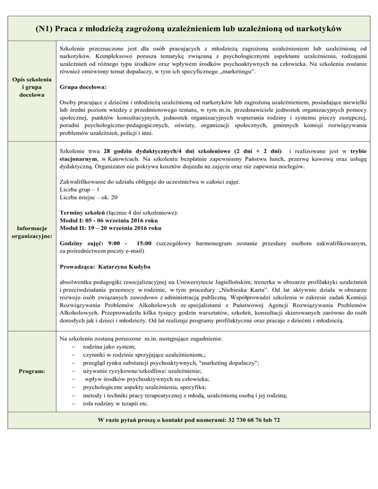 (N1) Praca z młodzieżą zagrożoną uzależnieniem lub uzależnioną od narkotyków Szkolenie przeznaczone jest dla osób pracujących z młodzieżą zagrożoną uzależnieniem lub uzależnioną od narkotyków. Kompleksowo porusza tematykę związaną z psychologicznymi aspektami uzależnienia, rodzajami uzależnień od różnego typu środków oraz wpływem środków psychoaktywnych na człowieka. Na szkoleniu zostanie również omówiony temat dopalaczy, w tym ich specyficznego „marketingu”. Opis szkolenia i grupa docelowa Grupa docelowa: Osoby pracujące z dziećmi i młodzieżą uzależnioną od narkotyków lub zagrożoną uzależnieniem, posiadające niewielki lub średni poziom wiedzy z przedmiotowego tematu, w tym m.in. przedstawiciele jednostek organizacyjnych pomocy społecznej, punktów konsultacyjnych, jednostek organizacyjnych wspierania rodziny i systemu pieczy zastępczej, poradni psychologiczno-pedagogicznych, oświaty, organizacji społecznych, gminnych komisji rozwiązywania problemów uzależnień, policji i inni. Szkolenie trwa 28 godzin dydaktycznych/4 dni szkoleniowe (2 dni + 2 dni) i realizowane jest w trybie stacjonarnym, w Katowicach. Na szkoleniu bezpłatnie zapewniamy Państwu lunch, przerwę kawową oraz usługę dydaktyczną. Organizator nie pokrywa kosztów dojazdu na zajęcia oraz nie zapewnia noclegów. Zakwalifikowanie do udziału obliguje do uczestnictwa w całości zajęć. Liczba grup – 1 Liczba miejsc – ok. 20 Informacje organizacyjne: Terminy szkoleń (łącznie 4 dni szkoleniowe): Moduł I: 05 - 06 września 2016 roku Moduł II: 19 – 20 września 2016 roku Godziny zajęć: 9:00 15:00 (szczegółowy harmonogram zostanie przesłany osobom zakwalifikowanym, za pośrednictwem poczty e-mail) Prowadząca: Katarzyna Kudyba absolwentka pedagogiki resocjalizacyjnej na Uniwersytecie Jagiellońskim, trenerka w obszarze profilaktyki uzależnień i przeciwdziałania przemocy w rodzinie, w tym procedury „Niebieska Karta”. Od lat aktywnie działa w obszarze rozwoju osób związanych zawodowo z administracją publiczną. Współprowadzi szkolenia w zakresie zadań Komisji Rozwiązywania Problemów Alkoholowych ze specjalistami z Państwowej Agencji Rozwiązywania Problemów Alkoholowych. Przeprowadziła kilka tysięcy godzin warsztatów, szkoleń, konsultacji skierowanych zarówno do osób dorosłych jak i dzieci i młodzieży. Od lat realizuje programy profilaktyczne oraz pracuje z dziećmi i młodzieżą. Program: Na szkoleniu zostaną poruszone m.in. następujące zagadnienia: − rodzina jako system; − czynniki w rodzinie sprzyjające uzależnieniom,; − przegląd rynku substancji psychoaktywnych, "marketing dopalaczy"; − używanie ryzykowne/szkodliwe/ uzależnienie; − wpływ środków psychoaktywnych na człowieka; − psychologiczne aspekty uzależnienia, specyfika; − metody i techniki pracy terapeutycznej z młodą, uzależnioną osobą i jej rodziną; − rola rodziny w terapii etc. W razie pytań proszę o kontakt pod numerami: 32 730 68 76 lub 72