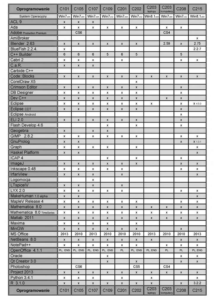 O p ro g ra m o w a n ie C101 C105 C107 C109 C201 S y s te m O p e ra c y jn y W i n 7 x64 W i n 7 x64 W i n 7 x64 W i n 7 x32 W i n 7 x64 ACL 9 x x x Ada x x x x x Adobe C 202 C203 C203 laptopy k o m p u te ry W i n 7 x32 W i n 8 . 1 x64 x CS6 P roduction Prem ium C208 C215 W i n 7 x64 W i n 7 x32 W i n 8 . 1 x64 x x CS4 A m iB r o k e r x B le n d e r 2 .6 3 x x x B lu e F is h 2 .2 .4 . x C + + B u ild e r 6 6 6 C a b ri 2 x x x C .a .R . x x x x x x x x x 2 .5 9 x 2 .7 5 2 .2 .7 5 6 5 5 x x x x x C a rb id e C + + C o d e ::B lo c k s x x C o re lD r a w X 5 x x x x C rim s o n E d ito r x x x x x x D B D e s ig n e r x x x x x x D ev C++ x x x x x x E c lip s e x x x x x x x x x x x x E c lip s e c d t E c lip s e A n d ro id x x x x x x x 4.5.0 x x E LI 2 .0 x x x F la s h D e v e lo p 4 .6 x x G e o g e b ra x G IM P x x G n u P ro lo g x x G ra p h x x H a s k e l P la tfo rm x x 2 .8 .2 x x x x x x x x x x x x x x x x 1.3.1 x x x IC A P 4 x Im a g e J x x x x x In k s c a p e 0 .4 8 x x x x x Irfa n V ie w x x x L o g o m o c ja x x x x x x x x x x x L T s p ic e IV x x x L Y X 2 .0 x x x M akeH um an x x M a p le V R e le a s e 4 x x x x x x M a th e m a tic a 8 .0 x x x x x x x x x x x x x M a tla b 2 0 1 1 x x x x x x M a x im a x x x x M in G W x x x x x x 2013 2010 2013 2010 2010 2010 2013 N e tB e a n s 8 .0 x x x x x x x N o te P a d + + x x x x x x PL, ENG PL, ENG PL, ENG PL, ENG PL PL, ENG 1 .0 a lp h a M a th e m a tic a 8 .0 T im e S erie s M S O ffic e O p e n O ffic e 4 .1 .1 x x x x Q t C r e a to r 3 .0 x x x x x x x x x x x x x x x x PL, ENG CS6 CS5 x x x P y th o n 3 .4 .1 x x x R 3 .1 .0 x x x x x x C101 C105 C107 C109 C201 C 202 x 2010 x x x 2010 2013 x x x x x PL PL PL, ENG x x x x x x x P ro je c t 2 0 1 3 O p ro g ra m o w a n ie x x O ra c le P h o to s h o p x CS4 x x x x x C203 C203 laptopy k o m pu tery x 3 .2 .2 C208 C215 O p ro g ra m o w a n ie S Q L S e rv e r C101 C105 C107 C109 C201 C 202 C203 laptopy k o m pu tery C208 C215 x x x x x x x 2015 x x 2008 R2 S ta tis tic a 12 x S W P 3 .0 x x x x x x x x x x x x x x x x S y m fo n ia T E X L iv e C203 x dem o 2013 T o rto is e S V N x Type Tool 3 x V e r tr ig o x x x x x x x x V is io x x x x x x x x x x x x x 2013 x 2013 2013 2013 2013 x V M w a r e P la y e r x x x x x x x x 7.1.2 W a m p S e rv e r x x x x x x x x 2.5 W in d o w s Phone S D K x x x x x x W in d o w s V irtu a l P C x x x x x W in g ID E 101 1 .5 x x x x x x X M L m in d X M L E d ito r x x x x x x C101 C105 C107 C109 C201 C 202 2013 V is u a l S tu d io 2015 O p r o g ra m o w a n ie x x x x x x C203 C203 laptopy k o m pu tery C208 C215