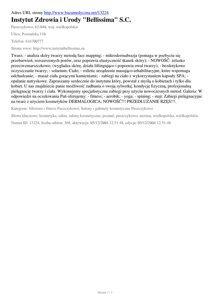 Adres URL strony http://www.bazamedyczna.net/13224 Instytut Zdrowia i Urody "Bellissima" S.C. Puszczykowo, 62-040, woj. wielkopolskie Ulica: Poznańska 110 Telefon: 616700777 Strona www: http://www.instytutbellissima.eu Twarz; - analiza skóry twarzy metodą face mapping; - mikrodermabrazja (pomaga w pozbyciu się przebarwień, rozszerzonych porów, oraz poprawia elastyczność tkanek skóry); - NOWOŚĆ: żelazko przeciwzmarszczkowe; (wygładza skórę, działa liftingująco i poprawia owal twarzy); - bezdotykowe oczyszczanie twarzy; - solarium; Ciało; - rolletic urządzenie masująco-rehabilitacyjne, które wspomaga odchudzanie; - masaż ciała gorącymi kamieniami; - zabiegi na ciało z wykorzystaniem kapsuły SPA; opalanie natryskowe. Zapraszamy serdecznie do instytutu który, powstał z myślą o kobietach i tylko dla kobiet. U nas znajdziecie panie możliwość zadbania o swoją sylwetkę, kondycję fizyczną, profesjonalną pielęgnację twarzy i ciała. Wykonujemy specjalistyczne zabiegi przy użyciu nowoczesnych metod. Galeria: W odpowiedzi na oczekiwania Pań oferujemy: - fitness; - aerobik; - yoga; - spining; - step; Zabiegi pielęgnacyjne na twarz z użyciem kosmetyków DERMALOGICA; NOWOŚĆ!!! PRZEDŁUŻANIE RZĘS!!!. Kategorie: Siłownie i fitness Puszczykowo, Salony i gabinety kosmetyczne Puszczykowo Słowa kluczowe: kosmetyka, salon, salony kosmetyczne, poznań, puszczykowo, mosina, wielkopolska, wielkopolskie Numer ID: 13224, liczba odsłon: 368, aktywacja: 05/12/2004 12:51:48, edycja: 05/12/2004 12:51:48 Strona 1 / 1