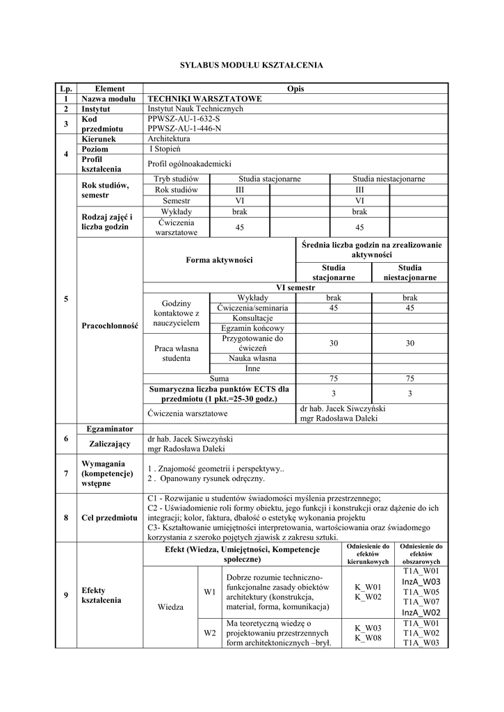 SYLABUS MODUŁU KSZTAŁCENIA Lp. 1 2 3 4 Element Nazwa modułu Instytut Kod przedmiotu Kierunek Poziom Profil kształcenia Rok studiów, semestr Rodzaj zajęć i liczba godzin Opis TECHNIKI WARSZTATOWE Instytut Nauk Technicznych PPWSZ-AU-1-632-S PPWSZ-AU-1-446-N Architektura I Stopień Profil ogólnoakademicki Tryb studiów Rok studiów Semestr Wykłady Ćwiczenia warsztatowe Studia stacjonarne III VI brak 45 Forma aktywności 5 Pracochłonność Studia niestacjonarne III VI brak 45 Średnia liczba godzin na zrealizowanie aktywności Studia Studia stacjonarne niestacjonarne VI semestr Wykłady brak brak Godziny Ćwiczenia/seminaria 45 45 kontaktowe z Konsultacje nauczycielem Egzamin końcowy Przygotowanie do 30 30 ćwiczeń Praca własna studenta Nauka własna Inne Suma 75 75 Sumaryczna liczba punktów ECTS dla 3 3 przedmiotu (1 pkt.=25-30 godz.) dr hab. Jacek Siwczyński Ćwiczenia warsztatowe mgr Radosława Daleki Egzaminator 6 7 Zaliczający Wymagania (kompetencje) wstępne 8 Cel przedmiotu 9 Efekty kształcenia dr hab. Jacek Siwczyński mgr Radosława Daleki 1 . Znajomość geometrii i perspektywy.. 2 . Opanowany rysunek odręczny. C1 - Rozwijanie u studentów świadomości myślenia przestrzennego; C2 - Uświadomienie roli formy obiektu, jego funkcji i konstrukcji oraz dążenie do ich integracji; kolor, faktura, dbałość o estetykę wykonania projektu C3- Kształtowanie umiejętności interpretowania, wartościowania oraz świadomego korzystania z szeroko pojętych zjawisk z zakresu sztuki. Odniesienie do Odniesienie do Efekt (Wiedza, Umiejętności, Kompetencje efektów efektów społeczne) kierunkowych obszarowych T1A_W01 Dobrze rozumie technicznoInzA_W03 funkcjonalne zasady obiektów K_W01 W1 T1A_W05 architektury (konstrukcja, K_W02 T1A_W07 materiał, forma, komunikacja) Wiedza InzA_W02 W2 Ma teoretyczną wiedzę o projektowaniu przestrzennych form architektonicznych –brył. K_W03 K_W08 T1A_W01 T1A_W02 T1A_W03 T1A_W04 InzA_W05 Umiejętność W3 Zna główne pojęcia z zakresu estetyki architektury (symetria, osiowość, proporcje, złoty podział itp.) K_W12 K_W17 U1 Potrafi trafnie określić cechy projektu architektonicznego K_U01 K_U03 Potrafi swą wiedzę przełożyć na projekt i sporządzenie modelu Zna podstawowe metody i techniki potrzebne do wykonania modelu . Czuje odpowiedzialność za prace własną i zespołową oraz odczuwa potrzebę stałego podnoszenia swych indywidualnych kwalifikacji K_U04 K_U05 U2 U3 Kompetencje społeczne Efekt kształcenia W1 10 Forma i warunki potwierdzenia efektu kształcenia W2 W3 U1 U2 U3 K1 K1 T1A_W03 T1A_W04 InzA_W01 InzA_W02 T1A_U01 T1A_U08 InzA_U01 T1A_U13 InzA_U04 K_U06 K_U07 T1A_U02 K_K01 K_K06 T1A_K01 T1A_K03 T1A_K04 T1A_K04 Sposób potwierdzenia (weryfikacji) Forma zaliczenia w oparciu o zrealizowane prace i zaangażowanie w zajęcia. Ocena wieloelementowa uwzględnia odpowiedź na stawiane problemy. Jak wyżej Jak wyżej Na podstawie frekwencji i poprawności projektu, modelu oraz oceny jego wykonania. Jak wyżej Jak wyżej Na podstawie frekwencji i oceny udziału studenta w ćwiczeniach warsztatowych oraz jego współpracy z grupą 1. Modelowanie przestrzennej kompozycji architektonicznej rozwijające wyobraźnię przestrzenną studentów jako pomoc przy wizualizacji projektu architektonicznego. 2.. Opanowanie warsztatu modelarskiego i rzeźbiarskiego oraz konstrukcji mebli ;umiejętność stosowania podstawowych technik wykonawczych (od zaprojektowania płaskiego modelu do jego przestrzennego uformowania). 11 Treści merytoryczne przedmiotu 3. Zagospodarowanie przestrzeni architektonicznej z wykorzystaniem wszystkich formacji rzeźbiarskich. 4. Podstawowe pojęcia z dziedziny sztuk plastycznych (ekspozycja, estetyka, harmonia, obiekt, bryła, fasada., wnętrze , mebel, mebel wielofunkcyjny). Zasady naturalnej plastyki i światłocienia, cienie własne i rzucone, symbol, skrót i znak graficzny, kompozycja architektoniczna, jej skala i detal, symetria i osiowość, klasyczne proporcje „złotego podziału”. 5. Kształtowanie bogactwa form architektonicznych poprzez komponowanie brył, płaszczyzn i detali służące większej kreatywności przyszłych projektantów. 12 Forma i 7. Ćwiczenie umiejętności i biegłości manualnej w zakresie technik przedstawiania rozwiązań architektonicznych Dopuszczenie do zaliczenia , na podstawie frekwencji, prezentacji i średniej, warunki zaliczenia modułu, w tym zasady dopuszczenia do zaliczenia 14 Wykaz literatury podstawowej 15 Wykaz literatury uzupełniającej (pomocniczej) pozytywnej oceny z wykonanych zadań: przestrzennego modelu papierowego, malej formy rzeźbiarskiej i projektu prostego mebla wielofunkcyjnego. Zaliczenie z oceną. Jedyna dostępna literatura przedmiotu to tłumaczone na język angielski prace autorów japońskich [brak analogicznych opracowań w języku polskim]: 1. M. Chatani&T.Kihara, 2010: Origamic Architecture Goes World-Famous Buildings, Shokokusha, Tokyo 2. Feireiss K. „ Co to jest architektura?” red. A Bujak Kraków 2002. 3. Peter Gossel, Gabriele Leuthauser „Architektura XX wieku” wyd. TASCHEN.”. 4. Paul Forrester. „Stolarstwo. Materiały, narzędzia, techniki, projekty” wyd. Arkady. 5. Etjenne Grandjean – „Ergonomia mieszkania” – Arkady – Warszawa 1978 6. Lakshmi Bhaskaran – „Design XX wieku – Główne nurty i style we współczesnym designie” – ABE Marketing – Warszawa 2006 7. Charlotte&Peter Fiell – „1000 Chairs”-TASCHEN 8. Charlotte&Peter Fiell – „Design the 21 Century” - TASCHEN 1. T. Fuse, 2003: Unit Origami vol. 1 - 5; Chikuma-shobo, Tokyo 2. Jose Lang „ Rzeźbienie w glinie” New STUDIO DESIGN”.wyd.daab.2006.