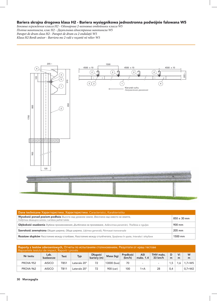 Bariera skrajna drogowa klasa H2 - Bariera wysięgnikowa jednostronna podwójnie falowana W5 Боковые ограждения класса H2 - Одинарные 2-волновые отбойники класса W5 Пътна мантинела, клас H2 - Двувълнова едностранна мантинела W5 Parapet de drum clasa H2 - Parapet de drum cu 2 ondulaţii W5 Klasa H2 Bordi anësor - Barriera me 2 valë e veçantë në reliev W5 205 ∼ 1500 4500 ± 10 4 2 2 4500 ± 10 2 2 205 ∼ 4500 ± 10 5 310 105 3 5 3 1 1 4 800 850 Kierunek ruchu Направление движения 900 1700 2 120 Dane techniczne Характеристики, Характеристики, Caracteristici, Karakteristika Wysokość ponad poziom podłoża Высота над уровнем земли, Височина над нивото на земята, 850 ± 30 mm Înălţimea deasupra solului, Lartësia jashtë tokës Głębokość osadzenia Глубина проникновения, Дълбочина на проникване, Adâncimea penetrării, Thellësia e nguljes 900 mm Szerokość zewnętrzna Общая ширина, Обща ширина, Lăţimea generală, Përmasat transversale 205 mm Rozstaw słupków Расстояние между столбами, Разстояние между стълбчетата, Spaţierea în spate, Interaksi i shtyllave 1500 mm Raporty z testów zderzeniowych, Отчеты по испытаниям столкновением, Резултати от краш тестове Rapoartele testului de impact, Raporti i provës Nr testu Lab. badawcze Test Typ Długość bariery (m) Masa (kg) Prędkość (km/h) ASI maks. 1.4 THIV maks. 33 km/h D m Vi m W m PROVA 952 AISICO TB51 Laterale 20° 72 13000 (bus) 70 - - 1,5 1,6 1,7=W5 PROVA 962 AISICO TB11 Laterale 20° 72 900 (car) 100 1=A 28 0,4 30 Marcegaglia 0,7=W2 300/2131/CPR/2013 2 1 2 4 2 1 3 5 3 5 4 3 5 Komponenty Компоненты, Компоненти, Componente, Komponentët Opis Materiał Kod Описание Материал Обозначение 1 Profil podwójnie falowany 2-волновой профиль, Двувълнов профил, Lisă cu 2 ondulaţii, Fashë 2 valë L=4816 Th=2.85 mm S 355 JR 59300504 2 Słupek “C” Столб “C”, C-образно стълбче, Stâlp C, Shtyllë “C” 120x55x30 Th=4 H=1700 mm S 275 JR 59400943 100x40x4 mm S 275 JR 59600127 3 Płytka maskująca gniazdo Пластина-крышка для паза, Покриваща пластина за отвори, Placă de acoperire pentru fante, Piastër mbuluese shlize 4 Śruba z nakrętką i podkładką Болт с гайкой и шайбой, Болт с гайка и шайба, M16x30 mm Classe 8.8 63800012 5 Şuru cu piuliţă şi şaibă, Bulon komplet me dado dhe rondele M12x50 mm Classe 8.8 63800857 Marcegaglia 31