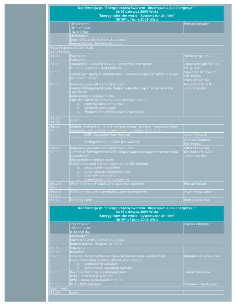 Konferencja pt. "Energie rządzą światem - Rozwiązania dla Energetyki " 18/19 Czerwca 2009 Wisła "Energy rules the world - Systems for Utilities" 18/19th of June 2009 Wisla 18 Czerwiec Firma Company 18th of June I dzień/I day Moderator: Edward Solarski, Siemens Sp. z o.o. Roman Korzus, Siemens Sp. z o.o. Sesja Wspólna 11.00-14.30 Joint Session 11:00 Powitanie Siemens Sp. z o.o. Welcome 30min Energetyka - kierunki rozwoju i przyszłość energetyki Zaproszeni goście/ SpeUtilities - directions and priorities cial guest 60min Sławomir Klimowicz Zanim sieci staną sie inteligentne - zaawansowane zarządzanie majątSAP Polska kiem technicznym Edward Solarski 60min Innowacje na rynku energetycznym. Ryszard Serkowski Energy Management Suite Dedykowane Rozwiązanie Siemens dla Joanna Kostka Elektrowni: Innovations in energy sector EMS dedicated Siemens solution for Power plant a. Optymalizacja remontów b. Dziennik operacyjny c. Planowanie i monitorowanie produkcji 13:3014:30 Sesja I 60min Lunch Modele obsługi klienta w istniejącej sytuacji prawno – organizacyjnej Customer care module in current administrational situation M2B - Customer Care Services Obsługa klienta - Gdzie jest wartość Sesja I 60min Sesja II 90 min Sesja II 30 min 19:30 08:3009:30 60 min 60 min Joanna Nowak Andrzej Chabrzyk SAP Polska Edward Solarski Ryszard Serkowski Joanna Kostka Innowacje na rynku energetycznym -cdn Grid Asset Management Suite Dedykowane Rozwiązanie Siemens dla Dystrubucji: Innovations in energy sector GAMS dedicated Siemens solution for Distribution: a. zarządzanie majątkiem a. optymalizacja remontów sieci b. dziennik operacyjny c. planowanie i monitorowanie SPLM (Siemens Produkt Life Cycle Management Roman Korzus ITSMart – kierunki rozwoju/Solution development Adam Niegodzisz Evening event Marta Koziarska Konferencja pt. "Energie rządzą światem - Rozwiązania dla Energetyki " 18/19 Czerwca 2009 Wisła "Energy rules the world - Systems for Utilities" 18/19th of June 2009 Wisla 19 Czerwiec Firma Company 19th of June II dzień/II day Moderator: Edward Solarski, Siemens Sp. z o.o. Roman Korzus, Siemens Sp. z o.o. Śniadanie Breakfast Optymalizacja kosztów w aspekcie finansowym i społecznym: Magdalena Grzewińska Costs estimation in financial and social aspect a. centralizacji zakupów b. zarządzanie kapitałem ludzkim Business Performance Management Tomasz Bandura BPM – Prezentacja systemu BPM – Demo system presentation PTD – DMS Solution Zbigniew Duszkiewicz 60min Sport Event 14:00 Lunch