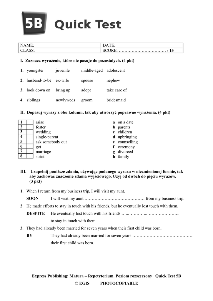NAME: CLASS: DATE: SCORE: …………………………… / 15 I. Zaznacz wyrażenie, które nie pasuje do pozostałych. (4 pkt) 1. youngster juvenile middle-aged adolescent 2. husband-to-be ex-wife spouse nephew 3. look down on bring up adopt take care of 4. siblings newlyweds groom bridesmaid II. Dopasuj wyrazy z obu kolumn, tak aby utworzyć poprawne wyrażenia. (4 pkt) 1 2 3 4 5 6 7 8 a b c d e f g h raise foster wedding single-parent ask somebody out get marriage strict on a date parents children upbringing counselling ceremony divorced family III. Uzupełnij poniższe zdania, używając podanego wyrazu w niezmienionej formie, tak aby zachować znaczenie zdania wyjściowego. Użyj od dwóch do pięciu wyrazów. (3 pkt) 1. When I return from my business trip, I will visit my aunt. SOON I will visit my aunt …………………………………… from my business trip. 2. He made efforts to stay in touch with his friends, but he eventually lost touch with them. DESPITE He eventually lost touch with his friends …..…………..………………….. to stay in touch with them. 3. They had already been married for seven years when their first child was born. BY They had already been married for seven years …………………………………… their first child was born. Express Publishing: Matura – Repetytorium. Poziom rozszerzony Quick Test 5B © EGIS PHOTOCOPIABLE IV. Przeczytaj tekst. Do każdej części tekstu (1.–4.) dopasuj nagłówek, podsumowujący jej treść (A–E) i wpisz w każdą kratkę odpowiednią literę. Jeden nagłówek został podany dodatkowo i nie odnosi się do żadnej części tekstu. (4 pkt) CHALLENGES IN IMPROVING PARENT-CHILD RELATIONSHIPS Relationships are always the hardest goals to work on, because they involve another party. This adds a whole new dynamics, compared to goals like earning a certain income or losing weight, which are more static and linear. Especially parent-child relationships – they are even more challenging due to the following reasons: 1. Unlike other relationships where you start from a clean slate, with parent-child relationships, you have a baggage built up from young. This weighs down the relationship. Rather than work toward the vision, sometimes you may need to work through the baggage first, which makes the goal bigger than it already is. 2. What is your ideal for your relationship with your parents? For them to be stronger mentor figures? To be more open in communication? To be more emotionally expressive? To be good friends with each other? Whatever it is, they may not share the same ideal. If that’s the case, if expectations are already different at the on-start, conflict is inevitable. 3. Being brought up in different times can create deep-seated implications, from differences in communication style, mindset, world views, philosophy on life, way of expressing love, and so on. With my parents, this difference created a very deep chasm that made it nearly impossible for us to communicate. 4. Your parents may have personalities which make it impossible for you to relate to. With my mom, she can be very stubborn, opinionated, and difficult. With my dad, he’s very quiet and inexpressive. Our personalities don’t gel at all, and this made it very difficult for me when I was trying to work through the relationship at the beginning. Adapted from personalexcellence.co A DIFFERENCES IN VISION B DIFFERENT CHARACTERS C BURDEN OF THE PAST D GENERATION GAP E NON-RECIPROCITY Express Publishing: Matura – Repetytorium. Poziom rozszerzony Quick Test 5B © EGIS PHOTOCOPIABLE