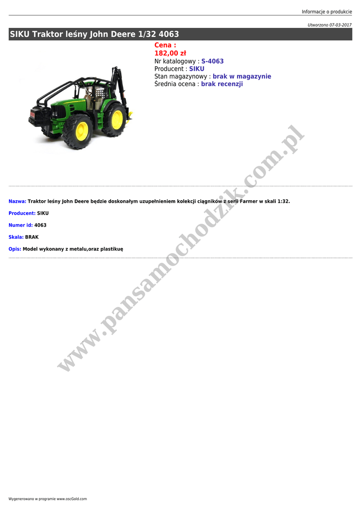 Informacje o produkcie Utworzono 07-03-2017 SIKU Traktor leśny John Deere 1/32 4063 Cena : 182,00 zł dz ik .c om .p l Nr katalogowy : S-4063 Producent : SIKU Stan magazynowy : brak w magazynie Średnia ocena : brak recenzji Nazwa: Traktor leśny John Deere będzie doskonałym uzupełnieniem kolekcji ciągników z serii Farmer w skali 1:32. Producent: SIKU ho Numer id: 4063 w w w .p an sa m Opis: Model wykonany z metalu,oraz plastikuę oc Skala: BRAK Wygenerowano w programie www.oscGold.com