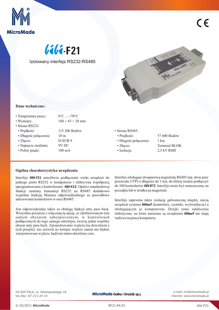 bibi-F21 Izolowany interfejs RS232-RS485 Dane techniczne: • Temperatura pracy: • Wymiary: • Strona RS232: • Prędkość: • Długość połączenia: • Złącze: • Napięcie zasilania: • Pobór prądu: 0°C ... +70°C 108 × 43 × 28 mm 115 200 Bodów 10 m D-SUB 9 9V DC 100 mA • Strona RS485: • Prędkość: • Długość połączenia: • Złącze: • Izolacja: 57 600 Bodów 1 km Terminal BLOK 2,5 kV RMS Ogólna charakterystyka urządzenia Interfejs bibi-F21 umożliwia podłączenie wielu urządzeń do jednego portu RS232 w komputerze i efektywną współpracę oprogramowania z kontrolerami bibi-K12. Oprócz standardowej funkcji zamiany transmisji RS232 na RS485 dodatkowo wypełnia funkcję Mastera odpowiedzialnego za prawidłowe adresowanie kontrolerów w sieci RS485. Jest odpowiedzialny także za obsługę funkcji anty pass back. Wszystkie przejścia z włączoną tą opcją, ze zdefiniowanym tym samym obszarem zabezpieczonym, w kontrolerach podłączonych do tego samego interfejsu, tworzą jeden wspólny obszar anty pass back. Zarejestrowanie wejścia (na dowolnym z tych przejść), nie zezwoli na kolejne wejście zanim nie będzie zarejestrowane wyjście, bądź nie minie określony czas. 64-920 PIŁA, ul. Wieniawskiego 16 tel./fax: 67 213 24 14 © 02/2011 MicroMade Interfejs obsługuje dwuparową magistralę RS485 (np. dwie pary przewodu UTP) o długości do 1 km, do której można podłączyć do 100 kontrolerów bibi-K12. Interfejs może być umieszczony na początku lub w środku tej magistrali. Interfejs zapewnia także izolację galwaniczną między siecią urządzeń systemu bibinet (kontrolery, czytniki, wyświetlacze) a obsługującym je komputerem. Dzięki temu zakłócenia elektryczne, na które narażone są urządzenia bibinet nie mają wpływu na pracę komputera. MicroMade Gałka i Drożdż sp.j. BF21.KK.01 e-mail: [email protected] internet: www.micromade.pl bibi-F21