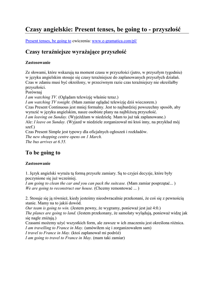 Czasy angielskie: Present tenses, be going to - przyszłość Present tenses, be going to cwiczenia: www.e-gramatica.com/pl/ Czasy teraźniejsze wyrażające przyszłość Zastosowanie Ze słowami, które wskazują na moment czasu w przyszłości (jutro, w przyszłym tygodniu) w języku angielskim stosuje się czasy teraźniejsze do zaplanowanych przyszłych działań. Czas w zdaniu musi być określony, w przeciwnym razie czas teraźniejszy nie określałby przyszłości. Porównaj I am watching TV. (Oglądam telewizję właśnie teraz.) I am watching TV tonight. (Mam zamiar oglądać telewizję dziś wieczorem.) Czas Present Continuous jest mniej formalny. Jest to najbardziej powszechny sposób, aby wyrazić w języku angielskim, nasze osobiste plany na najbliższą przyszłość. I am leaving on Sunday. (Wyjeżdżam w niedzielę. Mam to już tak zaplanowane.) Ale: I leave on Sunday. (Wyjazd w niedziele zorganizował mi ktoś inny, na przykład mój szef.) Czas Present Simple jest typowy dla oficjalnych ogłoszeń i rozkładów. The new shopping centre opens on 1 March. The bus arrives at 6.55. To be going to Zastosowanie 1. Język angielski wyraża tą formą przyszłe zamiary. Są to czyjeś decyzje, które były poczynione się już wcześniej. I am going to clean the car and you can pack the suitcase. (Mam zamiar posprzątać... ) We are going to reconstruct our house. (Chcemy remontować ... ) 2. Stosuje się ją również, kiedy jesteśmy nieodwracalnie przekonani, że coś się z pewnością stanie. Mamy na to jakiś dowód. Our team is going to win. (Jestem pewny, że wygramy, ponieważ jest już 4:0.) The planes are going to land. (Jestem przekonany, że samolaty wylądują, ponieważ widzę jak się nagle zniżają.) Czasami możemy użyć wszystkich form, ale zawsze w ich znaczeniu jest określona różnica. I am travelling to France in May. (umówiłem się i zorganizowałem sam) I travel to France in May. (ktoś zaplanował mi podróż) I am going to travel to France in May. (mam taki zamiar)