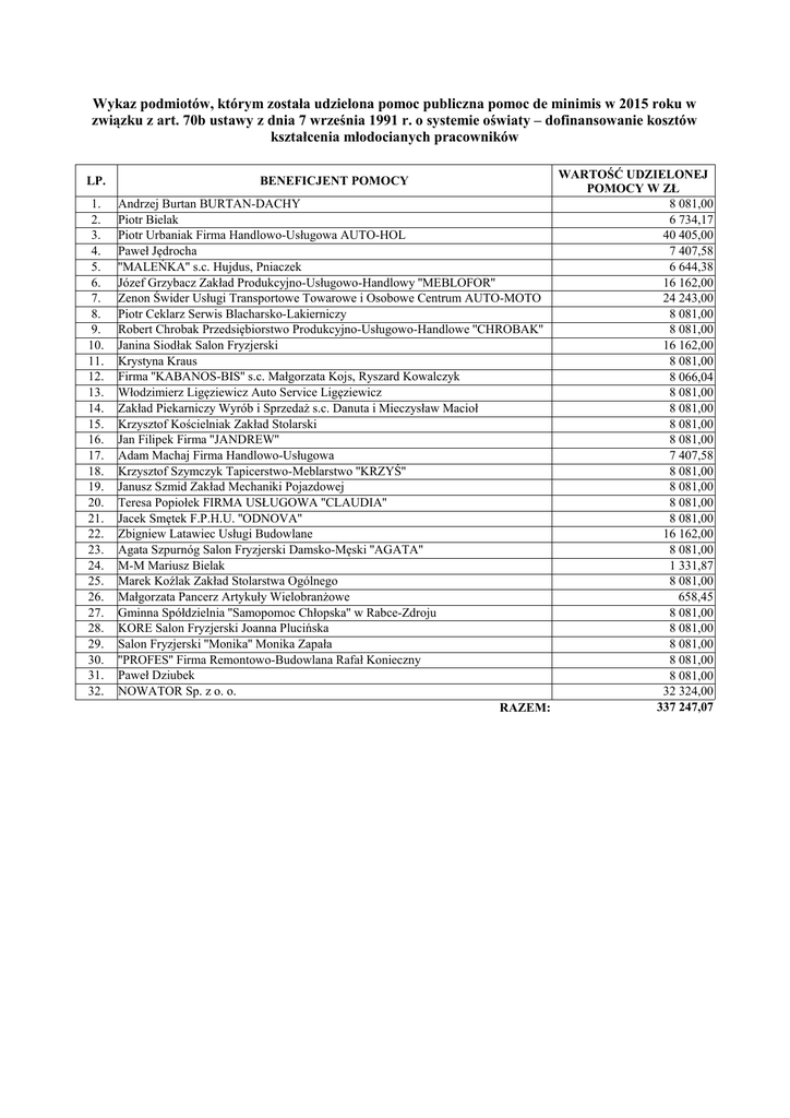 Wykaz podmiotów, którym została udzielona pomoc publiczna pomoc de minimis w 2015 roku w związku z art. 70b ustawy z dnia 7 września 1991 r. o systemie oświaty – dofinansowanie kosztów kształcenia młodocianych pracowników LP. 1. 2. 3. 4. 5. 6. 7. 8. 9. 10. 11. 12. 13. 14. 15. 16. 17. 18. 19. 20. 21. 22. 23. 24. 25. 26. 27. 28. 29. 30. 31. 32. WARTOŚĆ UDZIELONEJ POMOCY W ZŁ Andrzej Burtan BURTAN-DACHY 8 081,00 Piotr Bielak 6 734,17 Piotr Urbaniak Firma Handlowo-Usługowa AUTO-HOL 40 405,00 7 407,58 Paweł Jędrocha ''MALEŃKA'' s.c. Hujdus, Pniaczek 6 644,38 Józef Grzybacz Zakład Produkcyjno-Usługowo-Handlowy ''MEBLOFOR'' 16 162,00 Zenon Świder Usługi Transportowe Towarowe i Osobowe Centrum AUTO-MOTO 24 243,00 Piotr Ceklarz Serwis Blacharsko-Lakierniczy 8 081,00 Robert Chrobak Przedsiębiorstwo Produkcyjno-Usługowo-Handlowe ''CHROBAK'' 8 081,00 Janina Siodłak Salon Fryzjerski 16 162,00 Krystyna Kraus 8 081,00 Firma ''KABANOS-BIS'' s.c. Małgorzata Kojs, Ryszard Kowalczyk 8 066,04 Włodzimierz Ligęziewicz Auto Service Ligęziewicz 8 081,00 Zakład Piekarniczy Wyrób i Sprzedaż s.c. Danuta i Mieczysław Macioł 8 081,00 Krzysztof Kościelniak Zakład Stolarski 8 081,00 Jan Filipek Firma ''JANDREW'' 8 081,00 Adam Machaj Firma Handlowo-Usługowa 7 407,58 Krzysztof Szymczyk Tapicerstwo-Meblarstwo ''KRZYŚ'' 8 081,00 Janusz Szmid Zakład Mechaniki Pojazdowej 8 081,00 Teresa Popiołek FIRMA USŁUGOWA ''CLAUDIA'' 8 081,00 Jacek Smętek F.P.H.U. ''ODNOVA'' 8 081,00 Zbigniew Latawiec Usługi Budowlane 16 162,00 Agata Szpurnóg Salon Fryzjerski Damsko-Męski ''AGATA'' 8 081,00 M-M Mariusz Bielak 1 331,87 Marek Koźlak Zakład Stolarstwa Ogólnego 8 081,00 Małgorzata Pancerz Artykuły Wielobranżowe 658,45 Gminna Spółdzielnia ''Samopomoc Chłopska'' w Rabce-Zdroju 8 081,00 KORE Salon Fryzjerski Joanna Plucińska 8 081,00 Salon Fryzjerski ''Monika'' Monika Zapała 8 081,00 ''PROFES'' Firma Remontowo-Budowlana Rafał Konieczny 8 081,00 Paweł Dziubek 8 081,00 32 324,00 NOWATOR Sp. z o. o. 337 247,07 RAZEM: BENEFICJENT POMOCY