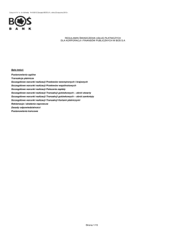 Załącznik Nr 1a do Uchwały Nr 9/2013 Zarządu BOŚ S.A. z dnia 22 stycznia 2013 r. REGULAMIN ŚWIADCZENIA USŁUG PŁATNICZYCH DLA KORPORACJI I FINANSÓW PUBLICZNYCH W BOŚ S.A Spis treści: Postanowienia ogólne Transakcje płatnicze Szczegółowe warunki realizacji Przelewów wewnętrznych i krajowych Szczegółowe warunki realizacji Przelewów wspólnotowych Szczegółowe warunki realizacji Polecenia zapłaty Szczegółowe warunki realizacji Transakcji gotówkowych – obrót otwarty Szczegółowe warunki realizacji Transakcji gotówkowych – obrót zamknięty Szczegółowe warunki realizacji Transakcji Kartami płatniczymi Reklamacje i działania naprawcze Zasady odpowiedzialności Postanowienia końcowe Strona 1/15 Postanowienia ogólne §1 1. 2. „Regulamin świadczenia usług płatniczych dla korporacji i finansów publicznych w BOŚ S.A.”, zwany dalej Regulaminem, określa szczegółowe warunki przeprowadzania usług płatniczych w BOŚ S.A. Umowę ramową, wraz z Umową obsługi rachunków bankowych, stanowią: - Regulamin świadczenia usług płatniczych dla korporacji i finansów publicznych w BOŚ S.A., - Regulamin rachunków bankowych dla korporacji i finansów publicznych w BOŚ S.A., - Komunikat o godzinach granicznych dla przelewów w obrocie krajowym i zagranicznym dla korporacji i finansów publicznych, - Regulamin bankowości elektronicznej – system BOŚBank24 iBOSS w BOŚ S.A. – jeśli Klient korzysta z bankowości elektronicznej, - Regulamin wydawania i użytkowania Karty business Banku Ochrony Środowiska S.A. – jeśli Klient korzysta z karty debetowej, - Regulamin wydawania i użytkowania karty kredytowej dla klientów segmentu korporacyjnego i segmentu finansów publicznych – jeśli Klient korzysta z karty kredytowej, - Regulamin obrotu gotówkowego w formie zamkniętej – jeśli Klient korzysta z obrotu gotówkowego w formie zamkniętej, - Umowa o realizacji rozliczeń w formie Polecenia zapłaty – jeśli Klient korzysta z Polecenia zapłaty w roli Odbiorcy, - Taryfa opłat i prowizji Banku Ochrony Środowiska S.A. za czynności bankowe w obrocie krajowym i zagranicznym dla korporacji i finansów publicznych. §2 Użyte w niniejszym Regulaminie określenia oznaczają: Akceptacja – proces mający na celu wydanie lub odmowę wydania przez Bank zgody na dokonanie Transakcji Kartą, Akceptant – przedsiębiorstwo, instytucja lub punkt handlowo-usługowy, które przyjmują zapłatę za usługę lub towar przy użyciu Kart płatniczych, Bank/BOŚ S.A. – Bank Ochrony Środowiska Spółka Akcyjna z siedzibą w Warszawie, al. Jana Pawła II nr 12, zarejestrowany w Sądzie Rejonowym dla miasta st. Warszawy, XII Wydział Gospodarczy Krajowego Rejestru Sądowego, pod numerem KRS 0000015525, NIP 527 020 33 13, Bank korespondent – bank krajowy/zagraniczny prowadzący na rzecz BOŚ S.A. rachunek w złotych lub w walucie obcej, Dostawca – bank lub inny podmiot świadczący Usługi płatnicze na rzecz Płatnika lub Odbiorcy, Dzień roboczy – dzień niebędący dniem wolnym od pracy, w którym bank Płatnika i bank Odbiorcy świadczą Usługi płatnicze, z uwzględnieniem godzin prowadzenia obsługi Transakcji płatniczych, IBAN – Międzynarodowy Numer Rachunku Bankowego, IDP – Unikatowy Identyfikator Płatności; ciąg o długości do 20 znaków, ustalony pomiędzy Odbiorcą a Płatnikiem, umożliwiający identyfikację Polecenia zapłaty realizowanego na podstawie Zgody, Instrument płatniczy – zindywidualizowane urządzenie lub uzgodniony przez Użytkownika i Dostawcę zbiór procedur, wykorzystywane przez Użytkownika do złożenia Zlecenia płatniczego, Karta płatnicza (Karta) – międzynarodowa karta wydawana przez Bank, do której został wydany PIN, uprawniająca do wypłaty gotówki lub dokonywania zapłaty, na której wskazane są: numer, imię i nazwisko upoważnionego posiadacza karty oraz data ważności, Klient – Płatnik lub Odbiorca Usług płatniczych, na rzecz którego Bank świadczy Usługi płatnicze, Kod BIC – kod identyfikujący bank, który jest uczestnikiem systemu SWIFT. Kod BIC BOŚ S.A. to: EBOSPLPWXXX, Komunikat dla posiadaczy Karty – Komunikat Banku Ochrony Środowiska S.A. dla Posiadaczy Rachunku/użytkownika Karty, stanowiący integralną część Regulaminu wydawania i użytkowania karty kredytowej dla klientów segmentu korporacyjnego i segmentu finansów publicznych, Komunikat o godzinach granicznych – „Komunikat o godzinach granicznych dla przelewów w obrocie krajowym i zagranicznym dla korporacji i finansów publicznych”, zamieszczony na stronie internetowej http:// www.bosbank.pl oraz w Placówkach Banku, Kurs referencyjny – kurs wymiany walut publikowany w Tabeli kursowej BOŚ S.A. lub kurs wymiany walut publikowany w Tabelach kursowych instytucji uczestniczących w rozliczeniu Transakcji, NIP – Numer Identyfikacji Podatkowej, stanowiący Unikatowy identyfikator Odbiorcy Polecenia zapłaty, NIW – Numer Identyfikacji Odbiorcy Polecenia zapłaty, stanowiący Unikatowy identyfikator Odbiorcy Polecenia zapłaty, NRB – Numer Rachunku Bankowego stosowany dla celów prawidłowej identyfikacji Rachunku, używany w rozliczeniach krajowych w złotych, stanowiący Unikatowy identyfikator Płatnika Polecenia zapłaty, Odbiorca – osoba fizyczna, prawna oraz jednostka organizacyjna niebędąca osobą prawną, posiadająca zdolność prawną, będąca odbiorcą środków pieniężnych stanowiących przedmiot Transakcji płatniczej, Odwołanie Polecenia zapłaty – dyspozycja Płatnika wstrzymująca obciążenie jego Rachunku przyszłym Poleceniem zapłaty, składana w banku Płatnika przed terminem jego realizacji, Opcja kosztowa – wskazany przez Płatnika podział kosztów, Opcja kosztowa SHA – instrukcja kosztowa określająca, że opłaty i prowizje banku Płatnika pokrywa Płatnik, zaś koszty banku Odbiorcy pokrywa Odbiorca, Opcja kosztowa OUR – instrukcja kosztowa określająca, że Pła