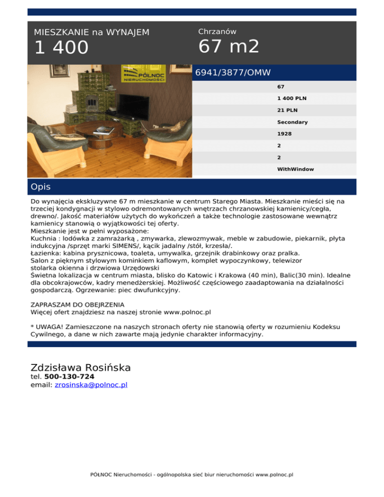 MIESZKANIE na WYNAJEM 1 400 Chrzanów 67 m2 6941/3877/OMW 67 1 400 PLN 21 PLN Secondary 1928 2 2 WithWindow Opis Do wynajęcia ekskluzywne 67 m mieszkanie w centrum Starego Miasta. Mieszkanie mieści się na trzeciej kondygnacji w stylowo odremontowanych wnętrzach chrzanowskiej kamienicy/cegła, drewno/. Jakość materiałów użytych do wykończeń a także technologie zastosowane wewnątrz kamienicy stanowią o wyjątkowości tej oferty. Mieszkanie jest w pełni wyposażone: Kuchnia : lodówka z zamrażarką , zmywarka, zlewozmywak, meble w zabudowie, piekarnik, płyta indukcyjna /sprzęt marki SIMENS/, kącik jadalny /stół, krzesła/. Łazienka: kabina prysznicowa, toaleta, umywalka, grzejnik drabinkowy oraz pralka. Salon z pięknym stylowym kominkiem kaflowym, komplet wypoczynkowy, telewizor stolarka okienna i drzwiowa Urzędowski Świetna lokalizacja w centrum miasta, blisko do Katowic i Krakowa (40 min), Balic(30 min). Idealne dla obcokrajowców, kadry menedżerskiej. Możliwość częściowego zaadaptowania na działalności gospodarczą. Ogrzewanie: piec dwufunkcyjny. ZAPRASZAM DO OBEJRZENIA Więcej ofert znajdziesz na naszej stronie www.polnoc.pl * UWAGA! Zamieszczone na naszych stronach oferty nie stanowią oferty w rozumieniu Kodeksu Cywilnego, a dane w nich zawarte mają jedynie charakter informacyjny. Zdzisława Rosińska tel. 500-130-724 email: [email protected] PÓŁNOC Nieruchomości - ogólnopolska sieć biur nieruchomości www.polnoc.pl Powered by TCPDF (www.tcpdf.org)