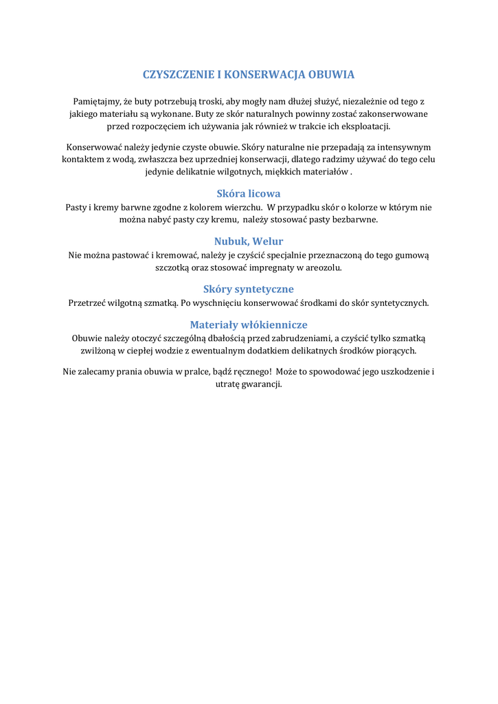 CZYSZCZENIE I KONSERWACJA OBUWIA Pamiętajmy, że buty potrzebują troski, aby mogły nam dłużej służyć, niezależnie od tego z jakiego materiału są wykonane. Buty ze skór naturalnych powinny zostać zakonserwowane przed rozpoczęciem ich używania jak również w trakcie ich eksploatacji. Konserwować należy jedynie czyste obuwie. Skóry naturalne nie przepadają za intensywnym kontaktem z wodą, zwłaszcza bez uprzedniej konserwacji, dlatego radzimy używać do tego celu jedynie delikatnie wilgotnych, miękkich materiałów . Skóra licowa Pasty i kremy barwne zgodne z kolorem wierzchu. W przypadku skór o kolorze w którym nie można nabyć pasty czy kremu, należy stosować pasty bezbarwne. Nubuk, Welur Nie można pastować i kremować, należy je czyścić specjalnie przeznaczoną do tego gumową szczotką oraz stosować impregnaty w areozolu. Skóry syntetyczne Przetrzeć wilgotną szmatką. Po wyschnięciu konserwować środkami do skór syntetycznych. Materiały włókiennicze Obuwie należy otoczyć szczególną dbałością przed zabrudzeniami, a czyścić tylko szmatką zwilżoną w ciepłej wodzie z ewentualnym dodatkiem delikatnych środków piorących. Nie zalecamy prania obuwia w pralce, bądź ręcznego! Może to spowodować jego uszkodzenie i utratę gwarancji.