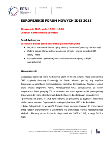 EUROPEJSKIE FORUM NOWYCH IDEI 2013 26 września 2013, godz. 17:30 – 19:00 Centrum Konferencyjne Sheraton Panel dyskusyjny Europejski biznes przed konferencją klimatyczną ONZ Na jakich warunkach biznes byłby skłonny finansować politykę klimatyczną? Zielona księga. Ramy polityki w zakresie klimatu i energii do roku 2030 ideały i realia Rola subsydiów i preferencji w kształtowaniu europejskiej polityki energetycznej Wprowadzenie Dwadzieścia jeden lat temu, na Szczycie Ziemi w Rio de Janeiro, kraje członkowskie ONZ podpisały Ramową Konwencję ds. Zmian Klimatu, po to, aby wspólnie decydować o sposobach przeciwdziałania wzrostowi temperatury. Zgodnie z opinią blisko tysiąca ekspertów Panelu Klimatycznego ONZ, dowodzących, że wzrost temperatury Ziemi powyżej 2oC w stosunku do stanu sprzed epoki przemysłowej doprowadzi do zmian klimatycznych katastrofalnych dla stabilności gospodarczej i politycznej na Ziemi, w 1995 roku uznano, że potrzebne są szybsze i konkretnie zdefiniowane zadania. Doprowadziło to do podpisania w 1997 roku Protokołu z Kioto. Zobowiązuje on w sposób formalny kraje uprzemysłowione do zmniejszenia emisji gazów cieplarnianych o uzgodnione dla pierwszego okresu rozliczeniowego wielkości. Pierwszy okres Protokołu obejmował lata 2008 – 2012, a drugi 2013 – 2020. 1 Ramową Konwencję Klimatyczną podpisały 192 strony1. Dużo mniej, bo 141 stron, odpowiedzialnych za 66% światowej emisji, ratyfikowało Protokół z Kioto. Nie przyjęły go Stany Zjednoczone, a w 2011 roku wycofała się z niego Kanada. Protokół był jednak ważnym, pierwszym krokiem społeczności międzynarodowej formalizującym działania na rzecz ochrony klimatu. Jego zasadniczym walorem było uświadomienie rządom i społeczeństwom wagi problemu i skali zagrożeń wynikających ze zmian klimatu. Sukcesem można też uznać samą kontynuację negocjacji. Niska jest natomiast praktyczna skuteczność Protokołu wymuszania redukcji emisji. Po pierwsze dlatego, że zobowiązania redukcji emisji (o 5-8%) nałożono wyłącznie na kraje rozwinięte, uznając je za moralnie odpowiedzialne za skutki środowiskowe rozwoju przemysłowego. Objęły one kraje, z których pochodziło w 2008 roku jedynie 20% światowej emisji gazów cieplarnianych, z czego 70% - z UE (27). Sześć krajów emitujących w sumie 8,5% gazów cieplarnianych zobowiązało się utrzymać poziom emisji lub zwiększać ją nie więcej niż o 10%. Po drugie, zobowiązania dotyczyły jedynie pierwszego okresu Protokołu (20082012). Pomimo starań podczas spotkań Kopenhadze i w Cancun nie udało się wynegocjować powszechnych zobowiązań na okres drugi (2013 -2020). Przyjęła je praktycznie tylko Unia Europejska, deklarując obniżenie emisji o 20%, w złudnym przekonaniu, że zachęci tym inne kraje. 1 191 krajów (wszyscy członkowie ONZ poza Andorą, Kanadą, Południowym Sudanem i St. Zjednoczonymi) oraz Unia Europejska. 2 Po trzecie, zobowiązań nie podjęły Stany Zjednoczone (18.27% globalnej emisji) i Chiny – kraj o największej (23,5%) oraz rosnącej emisji. Po czwarte, nie przewidziano poważniejszych sankcji ekonomicznych i instytucji, które mogłyby skutecznie egzekwować wypełnienie zobowiązań. W efekcie, pomimo lat negocjacji, corocznych konferencji klimatycznych, dziesiątków spotkań, deklaracji i przeróżnych narzędzi mających stymulować efektywną kosztowo redukcję emisji, w rzeczywistości światowa emisja rośnie (wraz z rozwojem krajów słabiej uprzemysłowionych) a zarazem słabnie nadzieja na ograniczenie wzrostu temperatury do akceptowalnego poziomu + 2oC. Protokół z Kioto wygasa w 2020 roku. Co dalej? Nowa umowa post-Kioto musi zostać uzgodniona na 21 Konferencji Stron Konwencji w Paryżu w 2015 roku. Tegoroczna Konferencja Stron w Warszawie (COP-19) jest ważnym etapem przygotowawczym. Jeśli umowa post-Kioto nie zostanie wypracowana w Paryżu, to będzie bardzo trudno ją osiągnąć przed 2020 rokiem z prozaicznego powodu kolizji kalendarzy wyborczych: w 2016 (i 2020) roku są wybory prezydenckie w Stanach Zjednoczonych, a w 2019 – wybory do Parlamentu UE. Czy jest zatem wola podpisania nowej umowy post-Kioto? Stanowisko biznesu europejskiego jest jasne: UE nie może być, jak dotąd jednostronnym obrońcą klimatu, gdyż jest to nieskuteczne klimatycznie (emisja UE-28 stanowi tylko 11% emisji światowej), a jednocześnie zabójcze gospodarczo. Realizacja europejskiego pakietu 20-20-20 zmniejszy światową emisję jedynie o ok. 1%. UE powinna dążyć do porozumienia klimatycznego przewidującego wkład wszystkich wiodących gospodarek oraz sektorów w ograniczenie emisji 3 i adaptację do zmian klimatu. W przypadku braku takiego porozumienia UE powinna radykalnie zrewidować swoją strategię klimatyczną po 2020 roku. Nowe porozumienie powinno wziąć pod uwagę zmiany, które zaszły na gospodarczej mapie świata. Wciąż 57% ludności Aryki nie ma dostępu do elektryczności2, ale jednocześnie 7 krajów3, zaliczonych w Protokole z Kioto do rozwijających, czyli tych które powinny otrzymywać pomoc od krajów uprzemysłowionych na mitygację i adaptację do zmian klimatu, ma wyższy dochód narodowy per capita niż przeciętny w UE-28. Aż 32 kraje zaliczane w protokole Kioto do rozwijających się mają dochód narodowy per capita wyższy niż Rumunia. Ponadto gospodarka światowa jest coraz bardziej powiązana: coraz łatwiej dochodzi do przepływu kapitału i pracowników. Nierównomierne obciążenia prowadzą nieuchronnie do odpływu inwestycji tam, gdzie standardy klimatyczne i/lub ceny energii są niższe. W dłuższej perspektywie ochrona przemysłu europejskiego np. poprzez częściowo bezpłatne uprawnienia do emisji CO2 jest nieskuteczna. Szokiem dla Niemiec było przeniesienie części produkcji BASF do Stanów Zjednoczonych w 2013 roku. Proces eksportu CO2 i jego importu do Europy w dobrach konsumpcyjnych trwa nieustannie: tak liczony śl