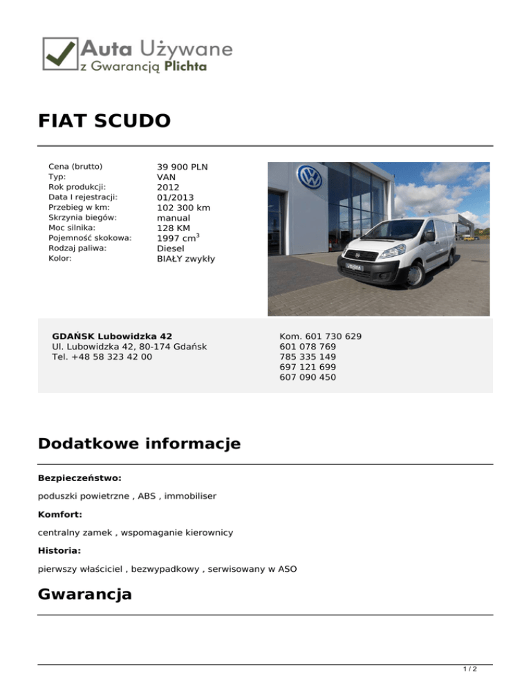 FIAT SCUDO Cena (brutto) Typ: Rok produkcji: Data I rejestracji: Przebieg w km: Skrzynia biegów: Moc silnika: Pojemność skokowa: Rodzaj paliwa: Kolor: 39 900 PLN VAN 2012 01/2013 102 300 km manual 128 KM 1997 cm3 Diesel BIAŁY zwykły GDAŃSK Lubowidzka 42 Ul. Lubowidzka 42, 80-174 Gdańsk Tel. +48 58 323 42 00 Kom. 601 730 629 601 078 769 785 335 149 697 121 699 607 090 450 Dodatkowe informacje Bezpieczeństwo: poduszki powietrzne , ABS , immobiliser Komfort: centralny zamek , wspomaganie kierownicy Historia: pierwszy właściciel , bezwypadkowy , serwisowany w ASO Gwarancja 1/2 Szanowni Państwo, Pragniemy Państwa poinformować, iż firma Plichta – Autoryzowany Dealer Škoda Auto prowadzi skup oraz sprzedaż samochodów używanych wszystkich marek, oferując także samochody używane z gwarancją objęte programem „Auta używane z Gwarancją Plichta”. W ramach programu „Auta Używane z Gwarancją Plichta ” każdy Klient otrzymuje atrakcyjny pakiet zniżek pozwalający zoptymalizować koszty eksploatacji samochodu: -50% na serwis klimatyzacji -50% na ustawienie zbieżności -50% na kosmetykę auta -50% na ścieżkę diagnostyczną -25% na wymiany oleju -25% na zakup opon + 5zł na sezon za hotelowanie opon -15% na części i akcesoria Oferujemy również kompleksową obsługę w zakresie finansowania i ubezpieczenia: - kredyty już od 4,99% - leasingi i kredyty bez zaświadczeń - uproszczone procedury – decyzja już od 30 min. - atrakcyjne pakiety AC/OC/NW/ASS wiodących firm ubezpieczeniowych Możliwość pozostawienia dotychczas użytkowanego auta w rozliczeniu – BEZPŁATNA WYCENA!!! Zapraszamy wszystkich Klientów na jazdę próbną wybranym autem. Numer oferty: D638 Informacja nie stanowi oferty w rozumieniu art. 66 KC. Podane dane mają charakter wyłącznie informacyjny. 2/2 Powered by TCPDF (www.tcpdf.org)
