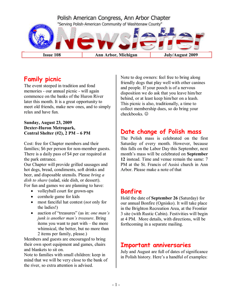 Issue 108 Ann Arbor, Michigan July/August 2009 The event steeped in tradition and fond memories - our annual picnic - will again commence on the banks of the Huron River later this month. It is a great opportunity to meet old friends, make new ones, and to simply relax and have fun. Note to dog owners: feel free to bring along friendly dogs that play well with other canines and people. If your pooch is of a nervous disposition we do ask that you leave him/her behind, or at least keep him/her on a leash. This picnic is also, traditionally, a time to collect membership dues, so do bring your checkbooks. Sunday, August 23, 2009 Dexter-Huron Metropark, Central Shelter (#2), 2 PM – 6 PM Date change of Polish mass Family picnic The Polish mass is celebrated on the first Saturday of every month. However, because this falls on the Labor Day this September, next month’s mass will be celebrated on September 12 instead. Time and venue remain the same: 7 PM at the St. Francis of Assisi church in Ann Arbor. Please make a note of that Cost: free for Chapter members and their families; $6 per person for non-member guests. There is a daily pass of $4 per car required at the park entrance. Our Chapter will provide grilled sausages and hot dogs, bread, condiments, soft drinks and beer, and disposable utensils. Please bring a dish to share (salad, side dish, or dessert). For fun and games we are planning to have: volleyball court for grown-ups cornhole game for kids most fanciful hat contest (not only for the ladies!) auction of “treasures” (as in: one man’s junk is another man’s treasure. Bring items you want to part with – the more whimsical, the better, but no more than 2 items per family, please.) Members and guests are encouraged to bring their own sport equipment and games, chairs and blankets to sit on. Note to families with small children: keep in mind that we will be very close to the bank of the river, so extra attention is advised. Bonfire Hold the date of September 26 (Saturday) for our annual Bonfire (Ognisko). It will take place in the Brighton Recreation Area, at the Frontier 3 site (with Rustic Cabin). Festivities will begin at 4 PM. More details, with directions, will be forthcoming in a separate mailing. Important anniversaries July and August are full of dates of significance in Polish history. Here’s a handful of examples: -1- July 1, 1569: Poland and Lithuania create a union, henceforth called the Republic of Both Nations (Rzeczpospolita Obojga Narodów) July 4, 1934: death of Marie SkłodowskaCurie, Polish-born chemist and physicist, holder of two Nobel Prizes. July 5, 1772: Russia, Prussia, and Austria sign a pact announcing the 1st division of Poland July 15, 1410: the Battle of Grunwald (Tannenberg), brings decisive victory of Polish forces against the knights of the Teutonic Order in one of the most important battles of medieval Europe. July 28, 1998: death of Zbigniew Herbert, poet, playwright, essayist, considered one of the most important Polish poets of the 20th century. Komitet Polskiego Festiwalu Filmowego, zrywając z długoletnią tradycją, przestał się kłócić o filmy i zaczął o pieniądze. Długoletni romans Danuty P. z Krzysztofem G. zakończył się remisem. Donosimy, ze Jurek P. po kryjomu wrócił do Ann Arbor i nieświadomy końca stanu wojennego ukrywa się u Eli M. . Krzysztof G. chałupniczo szyje dratwą pokiereszowanych kolegów. Pierwszymi pacjentami byli Andrzej M., Filip M. i Zbyszek R. Nowi pacjenci mile widziani. Ewa P. obcięła włosy i ku żałości całej męskiej wioski nie zapuszcza. August 1, 1944: starting day of the Warsaw Uprising, heroic and tragic struggle to liberate World War II Warsaw from German occupation. August 13-25, 1920: Battle of Warsaw, also known as the “Miracle at the Vistula” – Polish army unexpectedly defeats the invading Bolshevik army August 31, 1980: the communist regime signs an agreement with the striking workers in the Gdańsk shipyard; the “Solidarity” movement is born. Paweł S. zmienia kelnerki jak skarpetki. W związku z powyższym wpadł w konflikt z Bartkiem K. Andrzej D. przerzucił się ze szkła na wożenie kamieni. Bójcie się piłkarze nie grający według jego zaleceń. Andrzej M., ubrany w polski narodowy strój piłkarski, spadł z motocykla. Incydent zostal zauważony przez grupe Irańczykow. Zbyszek R. nadal zagłębia się w tajniki hinduizmu. Comic relief Baaaardzo… krótka wiadomość o Adamie F.: Wiezie pomarańcze do Kaliforni. Our local troupe of jesters, otherwise known as Blue Noses, offered to provide a comic relief in the form of a satirical section of our newsletter. Enjoy the first installment of their “Society Chronicle” (in Polish) below. (Note: the following is for entertainment purposes only and does not reflect the views and opinions of PAC or our Chapter.) Krystyna A. i Jolanta S. są widywane w klubach latynoskich tańcząc mazura. To ostra Salsa. Andrzej G. po wielomiesięcznym porwaniu przez UFO w końcu objawił się na boisku piłkarskim. Kronika Towarzyska Agencji JPP ( Jedna Pani Powiedziała) Z dobrze poinformowanych źródeł wiemy, że Bartek K. zaprosil 260 osób na swoje wesele. Państwo Andrzej i Krystyna D. zostali zaproszeni, ale nie będą. Niebieskie Nosy nie zostały zaproszone, ale będą. Mietek O. rozpoczął swoją kampanię na Prezydenta RP w Washtenaw County. 2 Terytorium Ann Arbor zostało podzielone między mafię grzybową i mafię brydżową. Niezczłonkowani czują się zterroryzowani. W następnym wydaniu: moda na pikniku. Niebieskie Nosy Contact Us Whenever you have a question, comment or complaint, please contact us:: Vlad (Włodek) Wielbut (President) Zbyszek Robakiewicz (Vice-President) Phone: (734) 644-4796 Phone: (734) 994-5447 E-mail: [email protected] E-mail: [email protected] Sylwia Rejniak (Treasurer) Marcin Walasek (Secretary) E-mail: [email protected] Phone: (734) 557-3259 E-mail: [email protected] Dorota “