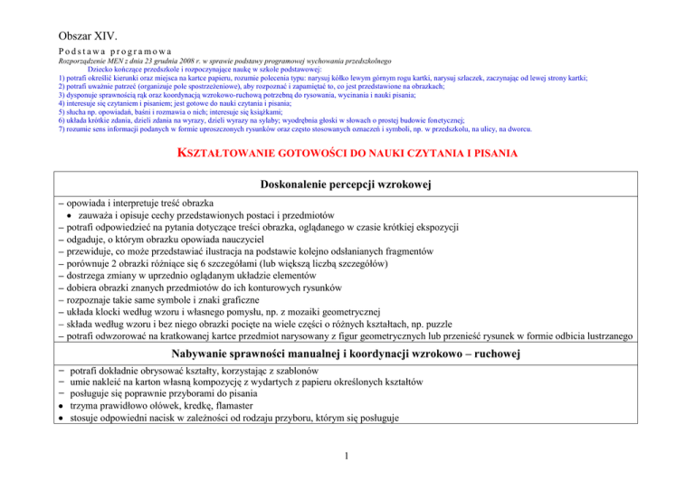Obszar XIV. Podstawa programowa Rozporządzenie MEN z dnia 23 grudnia 2008 r. w sprawie podstawy programowej wychowania przedszkolnego Dziecko kończące przedszkole i rozpoczynające naukę w szkole podstawowej: 1) potrafi określić kierunki oraz miejsca na kartce papieru, rozumie polecenia typu: narysuj kółko lewym górnym rogu kartki, narysuj szlaczek, zaczynając od lewej strony kartki; 2) potrafi uważnie patrzeć (organizuje pole spostrzeżeniowe), aby rozpoznać i zapamiętać to, co jest przedstawione na obrazkach; 3) dysponuje sprawnością rąk oraz koordynacją wzrokowo-ruchową potrzebną do rysowania, wycinania i nauki pisania; 4) interesuje się czytaniem i pisaniem; jest gotowe do nauki czytania i pisania; 5) słucha np. opowiadań, baśni i rozmawia o nich; interesuje się książkami; 6) układa krótkie zdania, dzieli zdania na wyrazy, dzieli wyrazy na sylaby; wyodrębnia głoski w słowach o prostej budowie fonetycznej; 7) rozumie sens informacji podanych w formie uproszczonych rysunków oraz często stosowanych oznaczeń i symboli, np. w przedszkolu, na ulicy, na dworcu. KSZTAŁTOWANIE GOTOWOŚCI DO NAUKI CZYTANIA I PISANIA Doskonalenie percepcji wzrokowej opowiada i interpretuje treść obrazka zauważa i opisuje cechy przedstawionych postaci i przedmiotów potrafi odpowiedzieć na pytania dotyczące treści obrazka, oglądanego w czasie krótkiej ekspozycji odgaduje, o którym obrazku opowiada nauczyciel przewiduje, co może przedstawiać ilustracja na podstawie kolejno odsłanianych fragmentów porównuje 2 obrazki różniące się 6 szczegółami (lub większą liczbą szczegółów) dostrzega zmiany w uprzednio oglądanym układzie elementów dobiera obrazki znanych przedmiotów do ich konturowych rysunków rozpoznaje takie same symbole i znaki graficzne układa klocki według wzoru i własnego pomysłu, np. z mozaiki geometrycznej składa według wzoru i bez niego obrazki pocięte na wiele części o różnych kształtach, np. puzzle potrafi odwzorować na kratkowanej kartce przedmiot narysowany z figur geometrycznych lub przenieść rysunek w formie odbicia lustrzanego Nabywanie sprawności manualnej i koordynacji wzrokowo – ruchowej − potrafi dokładnie obrysować kształty, korzystając z szablonów − umie nakleić na karton własną kompozycję z wydartych z papieru określonych kształtów − posługuje się poprawnie przyborami do pisania trzyma prawidłowo ołówek, kredkę, flamaster stosuje odpowiedni nacisk w zależności od rodzaju przyboru, którym się posługuje 1 Obszar XIV. − potrafi rozpoznać kod i zgodnie z nim pokolorować obrazek − zachowuje prawidłowy kierunek od lewej do prawej strony, np. przy rysowaniu lub układaniu wzorów w układzie pasowym poziomym na wąskich paskach papieru − posługuje się sprawnie nożyczkami, wycinając dowolne kształty, drobne ozdobne elementy, wzory po wyznaczonej linii − odwzorowuje różne wzory graficzne umie dokładnie narysować po linii i wykropkowanym śladzie odrysowuje kształty przez kalkę techniczną Orientacja na kartce papieru potrafi narysować lub ułożyć elementy na kartce papieru według wzoru określa miejsce na kartce papieru, wskazując środek kartki, górny lewy i prawy róg, dolny lewy i prawy róg rysuje na kratkowanym papierze według instrukcji nauczyciela lub podanego wzoru, tworząc szlaczki i labirynty Doskonalenie percepcji słuchowej uczestniczy w zabawach rytmicznych powtarza usłyszany rytm odtwarza rytm według zaprezentowanego wzoru graficznego układa schemat graficzny do usłyszanego rytmu rozpoznaje i nazywa dźwięki z najbliższego otoczenia oraz odgłosy przyrody wskazuje obrazki pasujące do usłyszanych odgłosów, np. szum morza, ruch uliczny, śpiew ptaków określa rodzaj i kierunek, skąd dochodzi dźwięk potrafi wybrać spośród wielu przedmiotów 2, które wydają taki sam dźwięk potrafi policzyć usłyszane dźwięki i odwzorować ich liczebność za pomocą drobnych przedmiotów, określonych znaków lub rysując kreski dzieli zdanie na wyrazy porównuje długość zdań, np. przeliczając liczbę wyrazów na palcach wskazuje miejsca określonego wyrazu w zdaniu dzieli wyrazy na sylaby wymienia kolejne sylaby w wyrazie i układa z elementów model sylabowy wyrazu liczy sylaby i porównuje długość wyrazów wskazuje przedmiot, którego nazwa zawiera określoną liczbę sylab rozwiązuje zagadki z podaniem pierwszej sylaby nazwy lub wymyśla wyrazy rozpoczynające się wskazaną sylabą dokonuje syntezy słuchowej wyrazu wypowiadanego sylabami 2 Obszar XIV. wyodrębnia głoski w wyrazie wskazuje obrazek, którego nazwa rozpoczyna się i kończy podaną głoską nazywa głoski w nagłosie, w wygłosie lub w środku wyrazu o prostej budowie fonetycznej wymienia kolejne głoski w wyrazach jednosylabowych i dłuższych umie wyodrębnić wyrazy, różniące się jedną głoską, np. półka – bułka, mata – łata, kot – koc Korzystanie z książek słucha dłuższych opowiadań i wierszy rozumie treść wysłuchanego utworu i potrafi wypowiedzieć się na jego temat odtwarza treść opowiadania zgodnie z kolejnością zdarzeń wczuwa się w przeżycia bohaterów literackich próbuje formułować główną myśl opowiadania tworzy własne książeczki, rysując kolejne sceny znanego opowiadania lub bajki albo wymyślone przez siebie historie wie, że w książkach można odnaleźć informacje na określony temat zna kolejne etapy powstawania książki szanuje książki i potrafi korzystać z nich tak, aby nie uległy zniszczeniu Rozumienie informacji przedstawionych w formie symbolu wybiera napis oznaczający imię, aby podpisać własną pracę plastyczną rozumie znaczenie wybranych znaków drogowych zna oznaczenia niebezpiecznych miejsc, np. skrzynka elektryczna rozpoznaje wyrazy wprowadzone do czytania globalnego w powiązaniu z obrazkiem lub przedmiotem posługuje się znakami synoptycznymi oznaczającymi wybrane zjawiska atmo