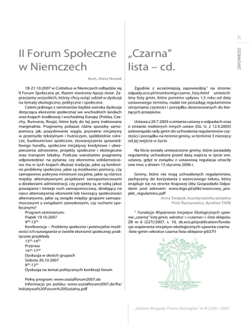 37 tłum. Anna Nowak 18-21.10.2007 w Cottebus w Niemczech odbędzie się II Forum Społeczne pt. Razem stwórzmy lepszy świat. Zapraszamy wszystkich, którzy chcą wziąć udział w dyskusji na tematy ekologiczne, polityczne i społeczne. Celem jednego z seminariów będzie szeroka dyskusja dotycząca ekonomii społecznej we wschodnich landach oraz krajach środkowej i wschodniej Europy (Polska, Czechy, Rumunia, Rosja), które były do tej pory traktowane marginalnie. Pragniemy pokazać różne sposoby samopomocy jak: pozyskiwanie węgla, prywatne inicjatywy w przemyśle tekstylnym i hutniczym, spółdzielnie rolnicze, budownictwo społeczne, stowarzyszenia sprawiedliwego handlu, społeczne inicjatywy kredytowe i ubezpieczenia zdrowotne, projekty społeczne i ekologiczne oraz transport lokalny. Podczas warsztatów pragniemy odpowiedzieć na pytania: czy ekonomia solidarnościowa ma w tych krajach dłuższe tradycje, jakie są konkretne problemy społeczne, jakie są możliwości pomocy, czy samopomoc pokrywa minimum socjalne, jakie są różnice między alternatywnymi projektami samopomocowymi a działaniami administracji, czy projekty są ze sobą jakoś powiązane i istnieje ruch samopomocowy, działający na rzecz alternatywnej ekonomii lub tworzący społeczności alternatywne, jakie są związki między grupami samopomocowymi a związkami zawodowymi, czy ruchami społecznymi? Program seminarium: Piątek 19.10.2007 900-1330 Konferencja – Problemy społeczne i potencjalne możliwości ich rozwiązania w świetle ekonomii społecznej; praktyczne przykłady 1330-1430 Przerwa 1430-1700 Dyskusja w dwóch grupach Sobota 20.10.2007 900-1330 Dyskusja na temat politycznych konkluzji forum Zgodnie z wcześniejszą zapowiedzią*) na stronie: odpady.eco.pl/monitoring/czarne_listy.html umieściliśmy listę gmin, które pomimo upływu 1,5 roku od daty ustawowego terminu, nadal nie posiadają regulaminów utrzymania czystości i porządku dostosowanych do bieżących przepisów. Ustawa z 29.7.2005 o zmianie ustawy o odpadach oraz o zmianie niektórych innych ustaw (Dz. U. z 12.9.2005) zobowiązała rady gmin do uchwalenia regulaminów czystości i porządku na terenie gminy, w terminie 3 miesięcy od jej wejścia w życie. Na liście zostały umieszczone gminy, które posiadały regulaminy uchwalone przed datą wejścia w życie ww. ustawy, gdyż w związku z ustawową regulacja utraciły one moc z dniem 13 stycznia 2006 r. Gminy, które nie mają uchwalonych regulaminów, zachęcamy do korzystania z wzorcowego tekstu, który znajduje się na stronie Krajowej Izby Gospodarki Odpadami pod adresem: www.kigo.pl/pliki/wzorcowy_projekt_regulaminu.pdf Anna Świątek, koordynatorka projektu Piotr Rymarowicz, dyrektor FWIE Fundacja Wspierania Inicjatyw Ekologicznych ujawnia „czarną” listę gmin, wkrótce >>czarna<< lista sklepów, ZB nr 6 (227)/2007, s. 10, zb.eco.pl/publication/fundacja-wspierania-inicjatyw-ekologicznych-ujawnia-czarna -liste-gmin-wkrotce-czarna-lista-sklepow-p927l1 *) Pełny program: www.sozialforum2007.de Informacja po polsku: www.sozialforum2007.de/fix/ Initiatywa%20Forum%20Sozialny.pdf „Zielone Brygady. Pismo Ekologów” nr 8 (229) / 2007 ZAPOWIEDZI II Forum Społeczne „Czarna” lista – cd. w Niemczech
