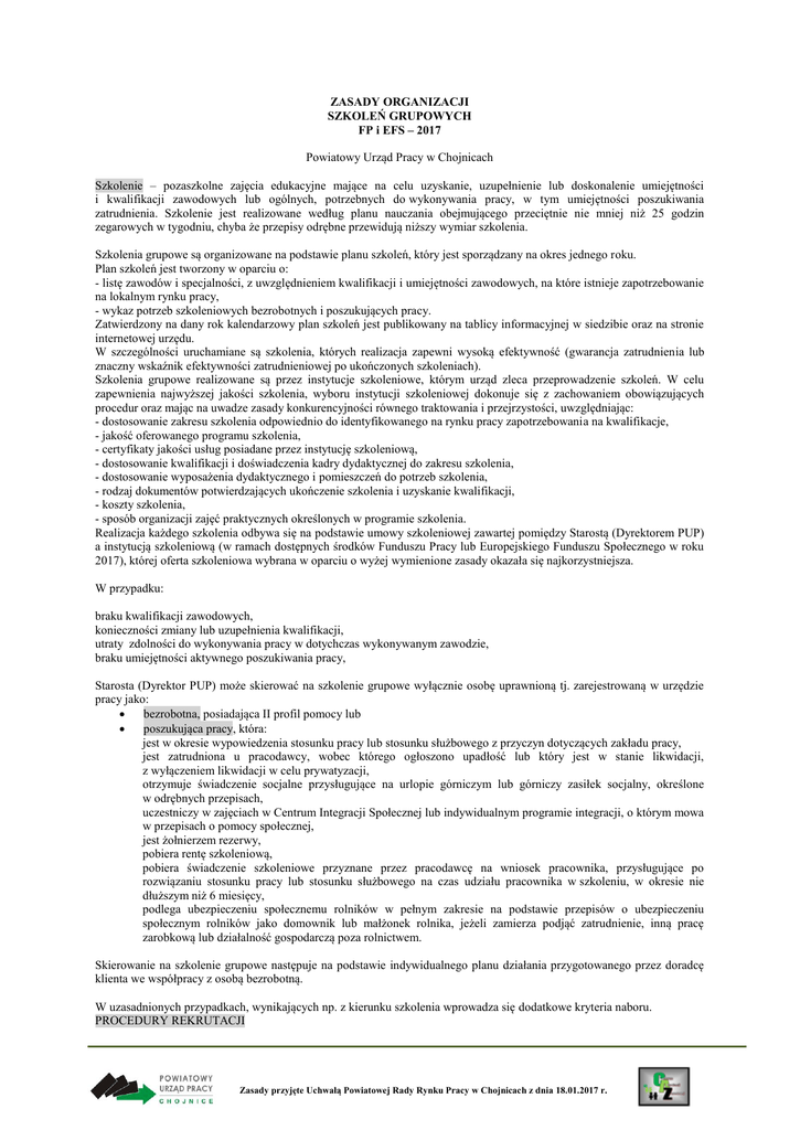 ZASADY ORGANIZACJI SZKOLEŃ GRUPOWYCH FP i EFS – 2017 Powiatowy Urząd Pracy w Chojnicach Szkolenie – pozaszkolne zajęcia edukacyjne mające na celu uzyskanie, uzupełnienie lub doskonalenie umiejętności i kwalifikacji zawodowych lub ogólnych, potrzebnych do wykonywania pracy, w tym umiejętności poszukiwania zatrudnienia. Szkolenie jest realizowane według planu nauczania obejmującego przeciętnie nie mniej niż 25 godzin zegarowych w tygodniu, chyba że przepisy odrębne przewidują niższy wymiar szkolenia. Szkolenia grupowe są organizowane na podstawie planu szkoleń, który jest sporządzany na okres jednego roku. Plan szkoleń jest tworzony w oparciu o: - listę zawodów i specjalności, z uwzględnieniem kwalifikacji i umiejętności zawodowych, na które istnieje zapotrzebowanie na lokalnym rynku pracy, - wykaz potrzeb szkoleniowych bezrobotnych i poszukujących pracy. Zatwierdzony na dany rok kalendarzowy plan szkoleń jest publikowany na tablicy informacyjnej w siedzibie oraz na stronie internetowej urzędu. W szczególności uruchamiane są szkolenia, których realizacja zapewni wysoką efektywność (gwarancja zatrudnienia lub znaczny wskaźnik efektywności zatrudnieniowej po ukończonych szkoleniach). Szkolenia grupowe realizowane są przez instytucje szkoleniowe, którym urząd zleca przeprowadzenie szkoleń. W celu zapewnienia najwyższej jakości szkolenia, wyboru instytucji szkoleniowej dokonuje się z zachowaniem obowiązujących procedur oraz mając na uwadze zasady konkurencyjności równego traktowania i przejrzystości, uwzględniając: - dostosowanie zakresu szkolenia odpowiednio do identyfikowanego na rynku pracy zapotrzebowania na kwalifikacje, - jakość oferowanego programu szkolenia, - certyfikaty jakości usług posiadane przez instytucję szkoleniową, - dostosowanie kwalifikacji i doświadczenia kadry dydaktycznej do zakresu szkolenia, - dostosowanie wyposażenia dydaktycznego i pomieszczeń do potrzeb szkolenia, - rodzaj dokumentów potwierdzających ukończenie szkolenia i uzyskanie kwalifikacji, - koszty szkolenia, - sposób organizacji zajęć praktycznych określonych w programie szkolenia. Realizacja każdego szkolenia odbywa się na podstawie umowy szkoleniowej zawartej pomiędzy Starostą (Dyrektorem PUP) a instytucją szkoleniową (w ramach dostępnych środków Funduszu Pracy lub Europejskiego Funduszu Społecznego w roku 2017), której oferta szkoleniowa wybrana w oparciu o wyżej wymienione zasady okazała się najkorzystniejsza. W przypadku: braku kwalifikacji zawodowych, konieczności zmiany lub uzupełnienia kwalifikacji, utraty zdolności do wykonywania pracy w dotychczas wykonywanym zawodzie, braku umiejętności aktywnego poszukiwania pracy, Starosta (Dyrektor PUP) może skierować na szkolenie grupowe wyłącznie osobę uprawnioną tj. zarejestrowaną w urzędzie pracy jako: bezrobotna, posiadająca II profil pomocy lub poszukująca pracy, która: jest w okresie wypowiedzenia stosunku pracy lub stosunku służbowego z przyczyn dotyczących zakładu pracy, jest zatrudniona u pracodawcy, wobec którego ogłoszono upadłość lub który jest w stanie likwidacji, z wyłączeniem likwidacji w celu prywatyzacji, otrzymuje świadczenie socjalne przysługujące na urlopie górniczym lub górniczy zasiłek socjalny, określone w odrębnych przepisach, uczestniczy w zajęciach w Centrum Integracji Społecznej lub indywidualnym programie integracji, o którym mowa w przepisach o pomocy społecznej, jest żołnierzem rezerwy, pobiera rentę szkoleniową, pobiera świadczenie szkoleniowe przyznane przez pracodawcę na wniosek pracownika, przysługujące po rozwiązaniu stosunku pracy lub stosunku służbowego na czas udziału pracownika w szkoleniu, w okresie nie dłuższym niż 6 miesięcy, podlega ubezpieczeniu społecznemu rolników w pełnym zakresie na podstawie przepisów o ubezpieczeniu społecznym rolników jako domownik lub małżonek rolnika, jeżeli zamierza podjąć zatrudnienie, inną pracę zarobkową lub działalność gospodarczą poza rolnictwem. Skierowanie na szkolenie grupowe następuje na podstawie indywidualnego planu działania przygotowanego przez doradcę klienta we współpracy z osobą bezrobotną. W uzasadnionych przypadkach, wynikających np. z kierunku szkolenia wprowadza się dodatkowe kryteria naboru. PROCEDURY REKRUTACJI Zasady przyjęte Uchwałą Powiatowej Rady Rynku Pracy w Chojnicach z dnia 18.01.2017 r. Rekrutacja osób na poszczególne szkolenia jest ogłaszana na tablicy informacyjnej oraz na stronie internetowej urzędu. Osoba zainteresowana danym szkoleniem składa stosowne zgłoszenie wraz z oświadczeniem o nieuczestniczeniu bądź udziale w szkoleniu finansowanym ze środków FP i EFS w okresie ostatnich 3 lat. Zgłoszenia podlegają ocenie formalnej i merytorycznej. W przypadkach zawodów wymagających szczególnych predyspozycji osoba po złożeniu zgłoszenia może zostać skierowana do doradcy zawodowego. Na szkolenie kwalifikują się osoby z najwyższą liczbą punktów (w przypadku równej liczby punktów brany będzie pod uwagę termin złożenia zgłoszenia). Informacji o osobach zakwalifikowanych na poszczególne szkolenia udziela specjalista ds. rozwoju zawodowego w siedzibie urzędu pracy. Kandydaci zakwalifikowani na szkolenie mogą być skierowani na badania lekarskie finansowane ze środków Funduszu Pracy, których przeprowadzenie warunkuje możliwość przystąpienia do szkolenia. Po zakwalifikowaniu się na szkolenie oraz uzyskaniu pozytywnej opinii lekarskiej (jeżeli jest konieczna) kandydat otrzymuje skierowanie na szkolenie. Prawa i obowiązki osoby uprawnionej Osobie bezrobotnej w trakcie szkolenia przysługuje stypendium w wysokości 120% zasiłku, pod warunkiem, że liczba godzin szkolenia wynosi nie mniej niż 150 godzin miesięcznie, w przypadku niższego miesięcznego wymiaru godzin szkolenia wysokość stypendium ustala się proporcjonalnie. Osobie bezrobotnej uprawn