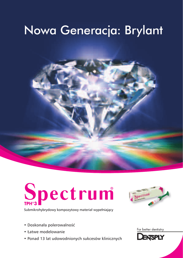Nowa Generacja: Brylant Submikrohybrydowy kompozytowy materiał wypełniający • Doskonała polerowalność • Łatwe modelowanie • Ponad 13 lat udowodnionych sukcesów klinicznych Nowa Generacja: Brylant Doskonała polerowalność i łatwość opracowywania dzięki nowej drobnocząsteczkowej formule wypełniacza szklanego Lustrzana gładkość powierzchni Poprzedni Spectrum®TPH® Nowy Spectrum® TPH® 3 Poprzedni Spectrum®TPH® Nowy Spectrum® TPH® 3 Zalety Korzyści Nowa drobnocząsteczkowa formuła wypełniacza Lustrzana gładkość powierzchni; łatwe opracowywanie i polerowanie Tradycyjny system kolorów oparty na kluczu VITA Ekonomiczna praca we wszystkich klasach ubytku w zębach przednich i bocznych; łatwy i szybki dobór koloru Kremowa konsystencja Komfortowe modelowanie Udokumentowane sukcesy kliniczne (ponad 13 lat obserwacji): - wysoka szczelność brzeżna wypełnień - odporność na pękanie - odpowiedni moduł elastyczności Wieloletnia trwałość wypełnień; rzadkie występowanie zjawiska próchnicy wtórnej; pewny materiał dla każdego pacjenta Bardzo dobra kontrastowość na zdjęciach RTG Łatwa diagnostyka Opakowania Spectrum® TPH® 3 Syringe Starter Kit 6 strzykawek Spectrum® TPH®3 po 4.5 g (kolory A1, A2, A3, A3.5, B1, B2) 4.5 ml Prime&Bond NT 3 ml DeTrey® Conditioner 36 Akcesoria Manufacturer: DENTSPLY DeTrey GmbH De-Trey-Str. 1 78467 Konstanz Germany www.dentsply.de DENTSPLY (DeTrey) GmbH Przedstawicielstwo w Polsce ul. Kolista 46/2, 43-300 Bielsko-Biała Tel: +48 33 8287340 Fax: +48 33 8184170 e-mail: [email protected] www.dentsply.pl Spectrum® TPH® 3 Syringe, Refills 1 strzykawka, 4.5 g Dostępne kolory: A1, A2, A3, A3.5, A4, B1, B2, B3, C2, C3,O-A2, O-A3.5, I-B1
