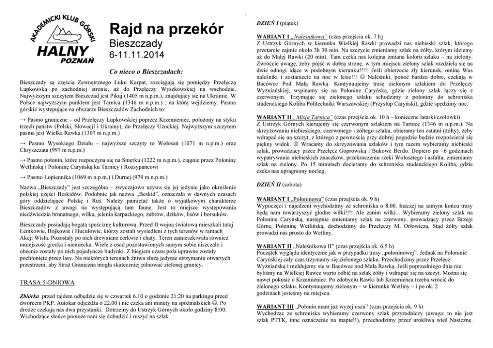 . Rajd na przekór Bieszczady 6-11.11.2014 Co nieco o Bieszczadach: Bieszczady są częścią Zewnętrznego Łuku Karpat, rozciągają się pomiędzy Przełęczą Łupkowską po zachodniej stronie, aż do Przełęczy Wyszkowskiej na wschodzie. Najwyższym szczytem Bieszczad jest Pikuj (1405 m n.p.m.), znajdujący się na Ukrainie. W Polsce najwyższym punktem jest Tarnica (1346 m n.p.m.) , na którą wejdziemy. Pasma górskie występujące na obszarze Bieszczadów Zachodnich to: → Pasmo graniczne – od Przełęczy Łupkowskiej poprzez Krzemieniec, położony na styku trzech państw (Polski, Słowacji i Ukrainy), do Przełęczy Użockiej. Najwyższym szczytem pasma jest Wielka Rawka (1307 m n.p.m.) → Pasmo Wysokiego Działu – najwyższe szczyty to Wołosań (1071 m n.p.m.) oraz Chryszczata (997 m n.p.m.) → Pasmo połonin, które rozpoczyna się na Smerku (1222 m n.p.m.), ciągnie przez Połoninę Wetlińską i Połoninę Caryńską ku Tarnicy i Rozsypańcowi DZIEŃ I (piątek) WARIANT I „Naleśnikowa” (czas przejścia ok. 7 h) Z Ustrzyk Górnych w kierunku Wielkiej Rawki prowadzi nas niebieski szlak, którego przetarcie zajmie około 3h 30 min. Na szczycie zmieniamy szlak na żółty, którym idziemy aż do Małej Rawki (20 min). Tam czeka nas kolejna zmiana koloru szlaku – na zielony. Zwróćcie uwagę, żeby pójść w dobrą stronę, w tym miejscu zielony szlak rozdziela się na dwie odnogi idące w podobnym kierunku!!!!! Jeśli obierzecie zły kierunek, ominą Was naleśniki i zostaniecie na noc w lesie!!! ☺ Naleśniki, ponoć bardzo dobre, czekają w Bacówce Pod Małą Rawką. Kontynuujemy trasę zielonym szlakiem do Przełęczy Wyżniańskiej, wspinamy się na Połoninę Caryńską, gdzie zielony szlak łączy się z czerwonym. Trzymając się zielonego szlaku schodzimy z połoniny do schroniska studenckiego Koliba Politechniki Warszawskiej (Przysłup Caryński), gdzie spędzimy noc. WARIANT II „Misja Tarnica” (czas przejścia ok. 10 h – konieczne latarki/czołówki) Z Ustrzyk Górnych kierujemy się czerwonym szlakiem na Tarnicę (1346 m n.p.m.). Na skrzyżowaniu niebieskiego, czerwonego i żółtego szlaku, obieramy ten ostatni (żółty), żeby wdrapać się na szczyt, z którego z pewnością przy dobrej pogodzie będzie rozpościerał się piękny widok. ☺ Wracamy do skrzyżowania szlaków i tym razem wybieramy niebieski szlak, prowadzący przez Przełęcz Goprowską i Bukowe Berdo. Dopiero po ~6 godzinach wypatrywania niebieskich znaczków, przekroczeniu rzeki Wołosatego i asfaltu, zmieniamy szlak na zielony. Po 15 minutach docieramy do schroniska studenckiego Koliba, gdzie czeka nas upragniony nocleg. → Pasmo Łopiennika (1069 m n.p.m.) i Durnej (979 m n.p.m.) Nazwa „Bieszczady” jest szczególna – zwyczajowo używa się jej jedynie jako określenie polskiej części Beskidów. Podobnie jak nazwa „Beskid”, oznaczała w dawnych czasach góry oddzielające Polskę i Ruś. Należy pamiętać także o wyjątkowym charakterze Bieszczadów z uwagi na występującą tam faunę. Jest to miejsce występowania niedźwiedzia brunatnego, wilka, jelenia karpackiego, żubrów, dzików, lisów i borsuków. Bieszczady posiadają bogatą spuściznę kulturową. Przed II wojną światową mieszkali tutaj Łemkowie, Bojkowie i Hucułowie, którzy zostali wysiedleni z tych terenów w ramach Akcji Wisła. Pozostały po nich drewniane cerkwie i chaty. Teren zamieszkiwała również mniejszość grecka i niemiecka. Wiele z osad pozostawionych samym sobie niszczało i obecnie zostały po nich pojedyncze budynki. Z biegiem czasu pola uprawne zostały pochłonięte przez lasy. Na niektórych terenach żniwa służą jedynie utrzymaniu otwartych przestrzeni, aby Straż Graniczna mogła skuteczniej pilnować zielonej granicy. TRASA 5-DNIOWA . Zbiórka przed rajdem odbędzie się w czwartek 6.10 o godzinie 21:20 na parkingu przed dworcem PKP. Autokar odjeżdża o 22.00 i nie czeka ani minuty na spóźnialskich ☺. Po drodze czekają nas dwa przystanki. Dotrzemy do Ustrzyk Górnych około godziny 8:00. Wschodzące słońce pomoże nam się dobudzić i ruszyć na szlak. DZIEŃ II (sobota) WARIANT I „Połoninowa” (czas przejścia ok. 9 h) Wypoczęci i najedzeni wychodzimy ze schroniska o 8.00. Inaczej na samym końcu trasy będą nam towarzyszyć głodne wilki!!!! Ale zanim wilki... Wybieramy zielony szlak na Połoninę Caryńską, następnie zmieniamy szlak na czerwony, prowadzący przez Brzegi Górne, Połoninę Wetlińską, dochodzimy do Przełęczy M. Orłowicza. Stąd żółty szlak prowadzi nas prosto do Wetliny. WARIANT II „Naleśnikowa II” (czas przejścia ok. 6,5 h) Początek wygląda identycznie jak w przypadku trasy „połoninowej”. Jednak na Połoninie Caryńskiej cały czas trzymamy się zielonego szlaku. Przechodzimy przez Przełęcz Wyżniańską i meldujemy się w Bacówce pod Małą Rawką. Jeśli poprzedniego dnia nie byliśmy na Wielkiej Rawce warto odbić na szlak żółty i wdrapać się na szczyt. Można się nawet pokusić o Krzemieniec. Po zdobyciu Rawki lub Krzemieńca trzeba wrócić do zielonego szlaku. Kontynuujemy zielonym – w kierunku Wetliny – i po ok. 2 godzinach jesteśmy na miejscu. WARIANT III „Połonin mam już wyżej uszu” (czas przejścia ok. 9 h) Wychodząc ze schroniska wybieramy czerwony szlak przyrodniczy (uwaga: to nie jest szlak PTTK, inne oznaczenie na mapie!!), przechodzimy przez urokliwą wieś Nasiczne. . Wspinamy się na Dwernik Kamień (1004 m n.p.m.), z którego roztacza się w południowym kierunku widok na Połoninę Wetlińską i Caryńską (na szczęście jesteśmy od nich daleko... ☺). Następnie schodzimy zielonym szlakiem przyrodniczym do Wodospadu na Hylatym, rozwidla się on na dwie odnogi, tylko od naszej kreatywności zależy, którą opcję wybierzemy. ☺ Przy wodospadzie rozwidlony zielony szlak łączy się ponownie i prowadzi do Zatwarnicy. Tam szukamy żółtego szlaku PTTK, który