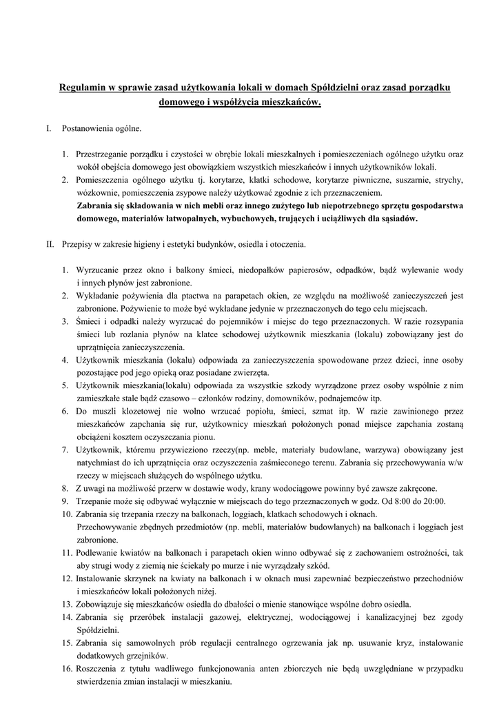 Regulamin w sprawie zasad użytkowania lokali w domach Spółdzielni oraz zasad porządku domowego i współżycia mieszkańców. I. Postanowienia ogólne. 1. Przestrzeganie porządku i czystości w obrębie lokali mieszkalnych i pomieszczeniach ogólnego użytku oraz wokół obejścia domowego jest obowiązkiem wszystkich mieszkańców i innych użytkowników lokali. 2. Pomieszczenia ogólnego użytku tj. korytarze, klatki schodowe, korytarze piwniczne, suszarnie, strychy, wózkownie, pomieszczenia zsypowe należy użytkować zgodnie z ich przeznaczeniem. Zabrania się składowania w nich mebli oraz innego zużytego lub niepotrzebnego sprzętu gospodarstwa domowego, materiałów łatwopalnych, wybuchowych, trujących i uciążliwych dla sąsiadów. II. Przepisy w zakresie higieny i estetyki budynków, osiedla i otoczenia. 1. Wyrzucanie przez okno i balkony śmieci, niedopałków papierosów, odpadków, bądź wylewanie wody i innych płynów jest zabronione. 2. Wykładanie pożywienia dla ptactwa na parapetach okien, ze względu na możliwość zanieczyszczeń jest zabronione. Pożywienie to może być wykładane jedynie w przeznaczonych do tego celu miejscach. 3. Śmieci i odpadki należy wyrzucać do pojemników i miejsc do tego przeznaczonych. W razie rozsypania śmieci lub rozlania płynów na klatce schodowej użytkownik mieszkania (lokalu) zobowiązany jest do uprzątnięcia zanieczyszczenia. 4. Użytkownik mieszkania (lokalu) odpowiada za zanieczyszczenia spowodowane przez dzieci, inne osoby pozostające pod jego opieką oraz posiadane zwierzęta. 5. Użytkownik mieszkania(lokalu) odpowiada za wszystkie szkody wyrządzone przez osoby wspólnie z nim zamieszkałe stale bądź czasowo – członków rodziny, domowników, podnajemców itp. 6. Do muszli klozetowej nie wolno wrzucać popiołu, śmieci, szmat itp. W razie zawinionego przez mieszkańców zapchania się rur, użytkownicy mieszkań położonych ponad miejsce zapchania zostaną obciążeni kosztem oczyszczania pionu. 7. Użytkownik, któremu przywieziono rzeczy(np. meble, materiały budowlane, warzywa) obowiązany jest natychmiast do ich uprzątnięcia oraz oczyszczenia zaśmieconego terenu. Zabrania się przechowywania w/w rzeczy w miejscach służących do wspólnego użytku. 8. Z uwagi na możliwość przerw w dostawie wody, krany wodociągowe powinny być zawsze zakręcone. 9. Trzepanie może się odbywać wyłącznie w miejscach do tego przeznaczonych w godz. Od 8:00 do 20:00. 10. Zabrania się trzepania rzeczy na balkonach, loggiach, klatkach schodowych i oknach. Przechowywanie zbędnych przedmiotów (np. mebli, materiałów budowlanych) na balkonach i loggiach jest zabronione. 11. Podlewanie kwiatów na balkonach i parapetach okien winno odbywać się z zachowaniem ostrożności, tak aby strugi wody z ziemią nie ściekały po murze i nie wyrządzały szkód. 12. Instalowanie skrzynek na kwiaty na balkonach i w oknach musi zapewniać bezpieczeństwo przechodniów i mieszkańców lokali położonych niżej. 13. Zobowiązuje się mieszkańców osiedla do dbałości o mienie stanowiące wspólne dobro osiedla. 14. Zabrania się przeróbek instalacji gazowej, elektrycznej, wodociągowej i kanalizacyjnej bez zgody Spółdzielni. 15. Zabrania się samowolnych prób regulacji centralnego ogrzewania jak np. usuwanie kryz, instalowanie dodatkowych grzejników. 16. Roszczenia z tytułu wadliwego funkcjonowania anten zbiorczych nie będą uwzględniane w przypadku stwierdzenia zmian instalacji w mieszkaniu. III. Przepisy w zakresie zabezpieczenia przeciwpożarowego. 1. Przejść niewolno zastawiać meblami, wózkami, opakowaniami i innymi rzeczami. 2. W piwnicach niewolno przechowywać motocykli, motorowerów, materiałów pędnych i środków łatwopalnych. 3. Palenie tytoniu i używanie otwartego ognia w piwnicach i na strychach, windach i klatkach schodowych jest zabronione. 4. Na podwórkach, klatkach schodowych i w pomieszczeniach nie wolno uruchamiać w celach kontrolnych silników pojazdów mechanicznych. 5. Zabrania się parkowania samochodów w podcieniach budynków, na drogach wewnątrzosiedlowych oraz trawnikach i chodnikach poza wyznaczonymi miejscami postojowymi. Zabrania się napraw i mycia samochodów na stanowiskach parkingowych wewnątrz osiedla nie przystosowanych do tego celu. 6. Posiadacze aparatów telefonicznych są zobowiązani do ich udostępnienia w wypadku konieczności wezwania straży pożarnej, pogotowia ratunkowego lub policji. IV. Przepisy w zakresie współżycia mieszkańców 1. Zasadniczym warunkiem współżycia mieszkańców domu winna być wzajemna pomoc i niezakłócanie spokoju i odpoczynku. 2. Gry i zabawy młodzieży powinny odbywać się tylko i wyłącznie w miejscach do tego przeznaczonych. Za niewłaściwe zachowanie się dzieci i szkody przez nie wyrządzone odpowiadają rodzice. 3. W godzinach od 22:00 do 6:00 obowiązuje cisza nocna. 4. Psy należy wyprowadzać na smyczy ze względu na możliwość zanieczyszczenia posesji oraz bezpieczeństwo mieszkańców. Zabrania się wyprowadzania psów na teren placu zabaw. W wypadku zanieczyszczenia klatki schodowej, windy, piaskownicy lub bezpośrednio otoczenia budynku, obowiązek posprzątania – łącznie z pokryciem kosztów dezynfekcji i ewentualnej wymiany piasku w piaskownicy – spoczywa na właścicielu zwierzęcia. Zabrania się przetrzymywania zwierząt pod nieobecność domowników na balkonach i loggiach. 5. Zabrania się gromadzenia dzieci i młodzieży na terenie klatek schodowych, piwnic, galeriach itp. V. Pozostałe przepisy. 1. Szafki reklamowe, szyldy, ogłoszenia itp. mogą być wywieszane i instalowane tylko za zgodą Spółdzielni i w miejscach do tego przeznaczonych. 2. Mieszkańcy są zobowiązani do ścisłego przestrzegania przepisów meldunkowych. 3. Mieszkańcy są zobowiązani do zamykania drzwi wejściowych budynku. 4. Z wszelkich urządzeń dźwigowych i innych należy korzystać zgodnie z instrukcją i ich