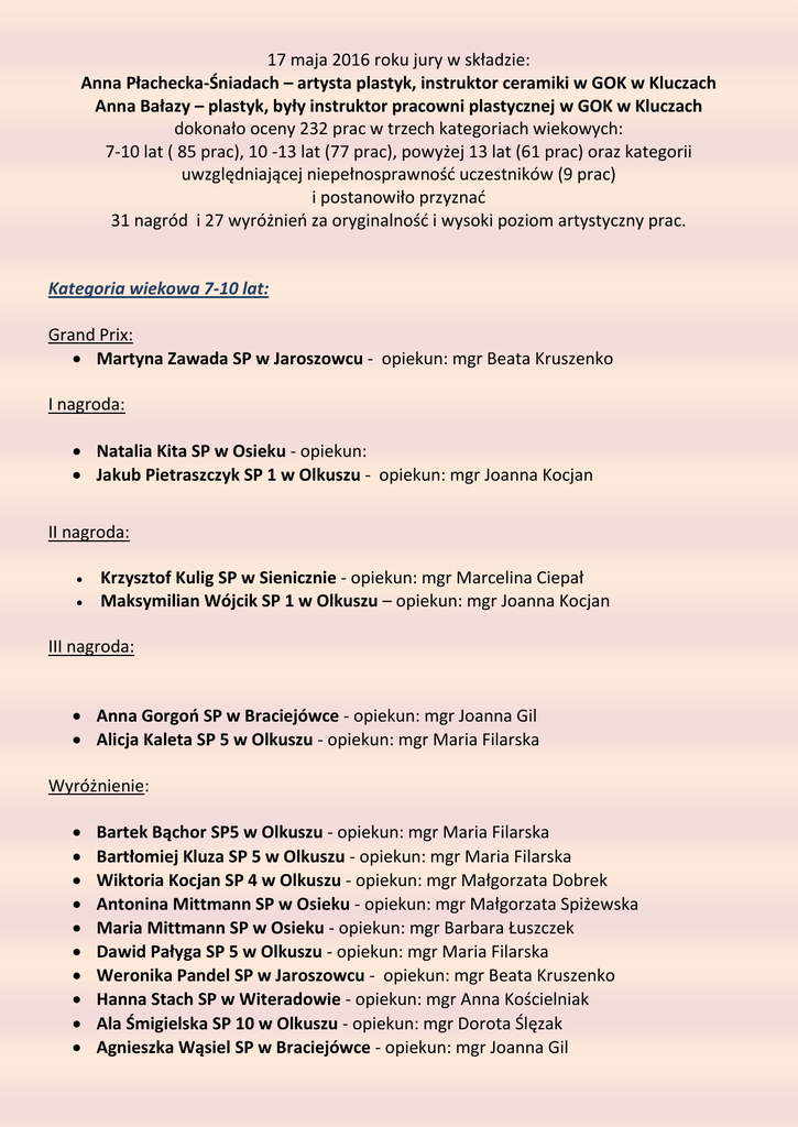 17 maja 2016 roku jury w składzie: Anna Płachecka-Śniadach – artysta plastyk, instruktor ceramiki w GOK w Kluczach Anna Bałazy – plastyk, były instruktor pracowni plastycznej w GOK w Kluczach dokonało oceny 232 prac w trzech kategoriach wiekowych: 7-10 lat ( 85 prac), 10 -13 lat (77 prac), powyżej 13 lat (61 prac) oraz kategorii uwzględniającej niepełnosprawność uczestników (9 prac) i postanowiło przyznać 31 nagród i 27 wyróżnień za oryginalność i wysoki poziom artystyczny prac. Kategoria wiekowa 7-10 lat: Grand Prix: Martyna Zawada SP w Jaroszowcu - opiekun: mgr Beata Kruszenko I nagroda: Natalia Kita SP w Osieku - opiekun: Jakub Pietraszczyk SP 1 w Olkuszu - opiekun: mgr Joanna Kocjan II nagroda: Krzysztof Kulig SP w Sienicznie - opiekun: mgr Marcelina Ciepał Maksymilian Wójcik SP 1 w Olkuszu – opiekun: mgr Joanna Kocjan III nagroda: Anna Gorgoń SP w Braciejówce - opiekun: mgr Joanna Gil Alicja Kaleta SP 5 w Olkuszu - opiekun: mgr Maria Filarska Wyróżnienie: Bartek Bąchor SP5 w Olkuszu - opiekun: mgr Maria Filarska Bartłomiej Kluza SP 5 w Olkuszu - opiekun: mgr Maria Filarska Wiktoria Kocjan SP 4 w Olkuszu - opiekun: mgr Małgorzata Dobrek Antonina Mittmann SP w Osieku - opiekun: mgr Małgorzata Spiżewska Maria Mittmann SP w Osieku - opiekun: mgr Barbara Łuszczek Dawid Pałyga SP 5 w Olkuszu - opiekun: mgr Maria Filarska Weronika Pandel SP w Jaroszowcu - opiekun: mgr Beata Kruszenko Hanna Stach SP w Witeradowie - opiekun: mgr Anna Kościelniak Ala Śmigielska SP 10 w Olkuszu - opiekun: mgr Dorota Ślęzak Agnieszka Wąsiel SP w Braciejówce - opiekun: mgr Joanna Gil Jury postanowiło także w specjalny sposób podziękować wszystkim uczniom z klasy II b ze Szkoły Podstawowej nr 1 w Olkuszu, za piękne portrety, które wykonali pod kierunkiem pani Joanny Kocjan. Kategoria wiekowa 10-13 lat: I nagroda: Małgorzata Gęgotek SP 4 w Olkuszu - opiekun: mgr Katarzyna Michalska Julia Kowal SP w Witeradowie - opiekun: mgr Anna Kościelniak II nagroda: Paweł Cieślik SP 9 w Olkuszu - opiekun: mgr Anna Pasich Natalia Kula SP 1 w Olkuszu – opiekun: mgr Małgorzata Wróbel III nagroda: Julia Gęgotek SP w Kluczach - opiekun: mgr Martyna Smaruj Paweł Gęgotek SP 4 w Olkuszu - opiekun: mgr Katarzyna Michalska Wyróżnienie: Kacper Gumieniak SP 9 w Olkuszu - opiekun: mgr Anna Pasich Amelia Jędrzejek SP 1 w Olkuszu – opiekun mgr Małgorzata Wróbel Zuzanna Jurkiewicz SP w Kluczach - opiekun: mgr Martyna Smaruj Marcelina Konieczna SP 2 w Olkuszu – opiekun: mgr Urszula Baran, mgr Anna Brzezińska Wiktoria Krzeczowska SP w Kluczach - opiekun: mgr Martyna Smaruj Igor Leśniewski SP 9 w Olkuszu - opiekun: mgr Anna Pasich Wiktor Makowski SP 2 w Olkuszu – opiekun: mgr Urszula Baran, mgr Anna Brzezińska Wiktoria Mlaś SP 9 w Olkuszu - opiekun: mgr Anna Pasich Agnieszka Nocoń SP w Braciejówce - opiekun: mgr Joanna Gil Maciej Pałka SP4 w Olkuszu - opiekun: mgr Katarzyna Michalska Wojciech Sołtysik SP4 w Olkuszu - opiekun: mgr Katarzyna Michalska Anna Zych SP4 w Olkuszu - opiekun: mgr Katarzyna Michalska Uczniowie z grup integracyjnych: I nagroda: Igor Kasprzyk SP 2 w Olkuszu – opiekun: mgr Dorota Kowalczyk, mgr Urszula Baran, mgr Anna Brzezińska II nagroda: Michał Chmiest SP 2 w Olkuszu – opiekun: mgr Dorota Kowalczyk III nagroda: Kinga Tracz SP 2 w Olkuszu – opiekun: mgr Dorota Kowalczyk, mgr Sylwia Konik Kategoria wiekowa 13-16 lat: I nagroda: Maciej Kaleciński Gimnazjum 2 w Olkuszu - opiekun: mgr Arkadiusz Królewicz, mgr Ewa Gutkowska-Żak Maria Opiela Gimnazjum 1 w Olkuszu – opiekun: mgr Joanna Jurkiewicz Karolina Porębska Gimnazjum 2 w Olkuszu - opiekun: mgr Arkadiusz Królewicz, mgr Ewa Gutkowska-Żak II nagroda: Angelika Grajewska Gimnazjum 1 w Olkuszu – opiekun: mgr Joanna Jurkiewicz Mateusz Hrabia Gimnazjum 1 w Olkuszu – opiekun: mgr Joanna Jurkiewicz Kamila Przepiórka Gimnazjum 2 w Olkuszu - opiekun: mgr Arkadiusz Królewicz, mgr Ewa Gutkowska-Żak III nagroda: Weronika Bryła Gimnazjum w Kluczach - opiekun: mgr Ewa Molenda Magdalena Czyż Gimnazjum 1 w Olkuszu – opiekun: mgr Joanna Jurkiewicz Piotr Grzanka Gimnazjum w Kluczach - opiekun: mgr Ewa Molenda Wyróżnienie: Weronika Furman Gimnazjum 3 w Olkuszu - opiekun: mgr Małgorzata Kocjan Kamila Jewiarz Gimnazjum 4 w Olkuszu - opiekun: mgr Arkadiusz Królewicz Łucja Kordaszewska Gimnazjum 4 w Olkuszu - opiekun: mgr Arkadiusz Królewicz Paulina Koza Gimnazjum 3 w Olkuszu - opiekun: mgr Małgorzata Kocjan Sylwia Krawiec Gimnazjum 1 w Olkuszu – opiekun: mgr Joanna Jurkiewicz Uczniowie z grup integracyjnych: I nagroda: Kinga Kaliwoda Gimnazjum 1 w Olkuszu – opiekun: mgr Joanna Jurkiewicz Marcin Zimowski Gimnazjum 1 w Olkuszu – opiekun: mgr Joanna Jurkiewicz II nagroda: Kamil Środoń Gimnazjum 1 w Olkuszu – opiekun: mgr Joanna Jurkiewicz Mateusz Szadkowski Gimnazjum 1 w Olkuszu – opiekun: mgr Joanna Jurkiewicz III nagroda: Anna Baron Gimnazjum 1 w Olkuszu – opiekun: mgr Joanna Jurkiewicz Laura Wilk Gimnazjum 1 w Olkuszu – opiekun: mgr Joanna Jurkiewicz Serdecznie gratulujemy wszystkim laureatom! Podsumowanie konkursu odbędzie się podczas wernisażu zorganizowanego w Gimnazjum Nr 1 w Olkuszu. O terminie powiadomimy opiekunów nagrodzonych uczniów.