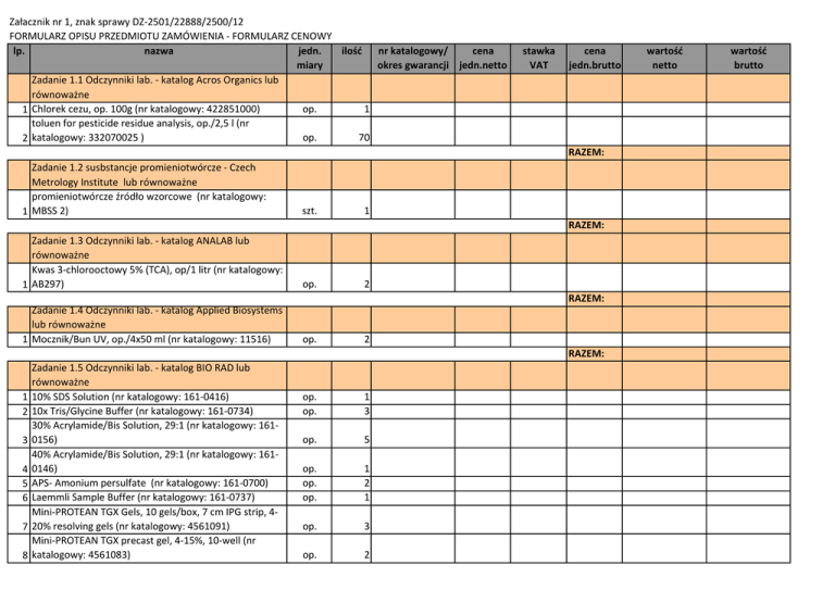 Załacznik nr 1, znak sprawy DZ-2501/22888/2500/12 FORMULARZ OPISU PRZEDMIOTU ZAMÓWIENIA - FORMULARZ CENOWY lp. nazwa jedn. ilość nr katalogowy/ cena miary okres gwarancji jedn.netto Zadanie 1.1 Odczynniki lab. - katalog Acros Organics lub równoważne op. 1 1 Chlorek cezu, op. 100g (nr katalogowy: 422851000) toluen for pesticide residue analysis, op./2,5 l (nr op. 70 2 katalogowy: 332070025 ) stawka VAT cena jedn.brutto RAZEM: Zadanie 1.2 susbstancje promieniotwórcze - Czech Metrology Institute lub równoważne promieniotwórcze źródło wzorcowe (nr katalogowy: 1 MBSS 2) szt. 1 RAZEM: Zadanie 1.3 Odczynniki lab. - katalog ANALAB lub równoważne Kwas 3-chlorooctowy 5% (TCA), op/1 litr (nr katalogowy: 1 AB297) op. 2 RAZEM: Zadanie 1.4 Odczynniki lab. - katalog Applied Biosystems lub równoważne 1 Mocznik/Bun UV, op./4x50 ml (nr katalogowy: 11516) op. 2 RAZEM: 1 2 3 4 5 6 7 8 Zadanie 1.5 Odczynniki lab. - katalog BIO RAD lub równoważne 10% SDS Solution (nr katalogowy: 161-0416) 10x Tris/Glycine Buffer (nr katalogowy: 161-0734) 30% Acrylamide/Bis Solution, 29:1 (nr katalogowy: 1610156) 40% Acrylamide/Bis Solution, 29:1 (nr katalogowy: 1610146) APS- Amonium persulfate (nr katalogowy: 161-0700) Laemmli Sample Buffer (nr katalogowy: 161-0737) Mini-PROTEAN TGX Gels, 10 gels/box, 7 cm IPG strip, 420% resolving gels (nr katalogowy: 4561091) Mini-PROTEAN TGX precast gel, 4-15%, 10-well (nr katalogowy: 4561083) op. op. 1 3 op. 5 op. op. op. 1 2 1 op. 3 op. 2 wartość netto wartość brutto 9 10 11 12 13 14 15 Mini-PROTEAN TGX precast gel, 4-20%, 10-well (nr katalogowy: 4561093) precision plus protein kaleidoscope standards (nr katalogowy: 1610375) SDS (nr katalogowy: 161-0300) Silver stain plus kit (nr katalogowy: 161-0449) silver stain sds-page standards, low range (nr katalogowy: 1610314) TEMED (nr katalogowy: 161-0801) TEMED, op. 5 ml (nr katalogowy: 161-0800) op. 3 op. op. op. 1 2 1 op. op. op. 1 3 1 RAZEM: Zadanie 1.6 odczynniki lab. - Chemia Łódź lub równoważne 1 soda kaustyczna, granulki, op./25 kg op. 320 RAZEM: Zadanie 1.7 Odczynniki lab. - katalog BIOMEDA lub równoważne 1 10x automation Buffer pH 7.5 (nr katalogowy: M30) op 1 RAZEM: Zadanie 1.8 odczynniki lab. - katalog BioMerieux lub równoważne Evans Blue (nr katalogowy: 75491) Fiolet krystaliczny, op./500 ml (nr katalogowy: 29524) Fluoprep, op. 1 x 15 ml (nr katalogowy: 75521) Fuksyna, op./500 ml (nr katalogowy: 29522) NaCl 0,85% Medium (nr katalogowy: 20070) NaCl 0,85% medium 5ml (nr katalogowy: 20230) op. op. op. op. op. op. 3 4 2 4 13 1 7 NOZZLE CLEANING SOLUTION 5l (nr katalogowy: 29525) 8 Płyn Lugola, op. 500 ml (nr katalogowy: 29523) 9 Rapid ID32 STREP (nr katalogowy: 32600) op. op. op. 1 4 25 1 2 3 4 5 6 RAZEM: Zadanie 1.9 Odczynniki lab. - katalog BORPOL lub równoważne Zestaw do oznaczania białka całkowitego op/2x250 ml 1 (nr katalogowy: 11500) Zestaw do oznaczania glukozy op/1x500 ml (nr 2 katalogowy: 11504) op 2 op 1 RAZEM: 1 2 3 4 5 Zadanie 1.10 Odczynniki lab. - katalog BOULE MEDICAL AP lub równoważne Cleaning Kit (nr katalogowy: 1504111) Detectoterge 5 l (nr katalogowy: 1504103) Diluid AC 900 20 l (nr katalogowy: 1504103) Kubeczki rozpyłowe, (nr katalogowy: 150 00 02) Lyse diff AC 900 cyanide free 5 l (nr katalogowy: 1504104) op. op. op. szt. 2 1 4 100 op. 1 RAZEM: Zadanie 1.11 Odczynniki lab. - katalog Neolab lub równoważne perełki suche wskaźnikowe, op. 1000 ml (nr katalogowy: 1 1-7031) op. 1 RAZEM: Zadanie 1.12 Odczynniki lab. - katalog BTL lub równoważne 1 Pepsyna 2.000 FIP/G 500g (nr katalogowy: E-0161 ) op. 25 RAZEM: 1 2 3 4 5 6 Zadanie 1.13 Odczynniki lab. - katalog Chempur lub równoważne kadmu siarczan uwodniony cz.d.a. op. 500g (nr katalogowy: 114976705) Kwas siarkowy 2mol/l roztwór mianowany, op/ 1litr (nr katalogowy: 815749500) Kwas siarkowy 2mol/l roztwór mianowany, op/500ml (nr katalogowy: 815749500) wzorzec do aktywności wody 0.760 aw (nr katalogowy: DE 506) wzorzec do aktywności wody 0.920 aw (nr katalogowy: DE 512) wzorzec do aktywności wody 0.984 aw (nr katalogowy: DE 507) op. 2 op. 8 op. 2 op. 1 op. 1 op. 1 RAZEM: Zadanie 1.14 odczynniki lab. - katalog BioSystems lub równoważne 1 Białko całkowite, op./50 ml (nr katalogowy: 11800) op. 3 2 Bilirubina całkowita, op./4x50ml (nr katalogowy: 11510) op. 2 3 Glukoza, op./1x50 ml (nr katalogowy: 11803) 4 Kreatynina, op./4x50 ml (nr katalogowy: 11502) op. op. 2 2 RAZEM: Zadanie 1.15 Odczynniki lab. - katalog DAKO CYTOMATION lub równoważne 1 Glycergel Mounting Medium (nr katalogowy: C056330) op. 1 2 polyclonal goat anti mouse/AP (nr katalogowy: D0486) 3 Proteinaza K, op./ 15 ml (nr katalogowy: S302080) op. op. 1 1 RAZEM: 1 2 3 4 5 6 7 Zadanie 1.16 Odczynniki lab. - katalog FERMENTAS lub równoważne 10X TBE (Tris-borate-EDTA) (nr katalogowy: B52) 10X Tris-glycine-SDS Electrophoresis Buffer (nr katalogowy: B46) 10x Tris-tricine/SDS Electrophoresis buffer, op./1000 ml (nr katalogowy: B48) 50X TAE Electrophoresis Buffer, op/1000ml (nr katalogowy: B49) IPTG Solution, ready-to-use (nr katalogowy: R1171) TopVision Agarose, 100g (nr katalogowy: R0491) TopVision Low Melting Point Agarose (nr katalogowy: R0801) op. 31 op. 7 op. 3 op op. op. 8 2 16 op. 1 RAZEM: Zadanie 1.17 Odczynniki lab. - katalog Fisher lub równoważne smar silikonowy do uszczelniania instalacji próżniowych, Glisseal high vacuum, op. 60 ml (nr katalogowy: 1 9116935) op. 1 RAZEM: Zadanie 1.18 Odczynniki lab. - katalog FOSS ELECTRIC lub równoważne BactoScan 8000 Control Sample (nr katalogowy: (P/N 1 59559)) 2 Buffer Powder (nr katalogowy: P/N 431163) op. szt. 1 2 3 Calibration Suspension BZ (nr katalogowy: P/N 431791) 4 Emulsifier (nr katalogowy: P/N 431197) op. op. 1 2 5 Gradient (nr katalogowy: P/N 431171) 6 Lysing Powder (nr katalogowy: P/N 431155) 7 Membrane Disc Filters (nr katalogowy: P/N 702027) Reagent C Dye Stains for Fossomatic, op/0,5 l (nr 8 katalogowy: 60053687) 9 Reagent D Clean 5000 (nr katalogowy: P/N 1010901) 10 S-470 Liquid do MSC (nr kata