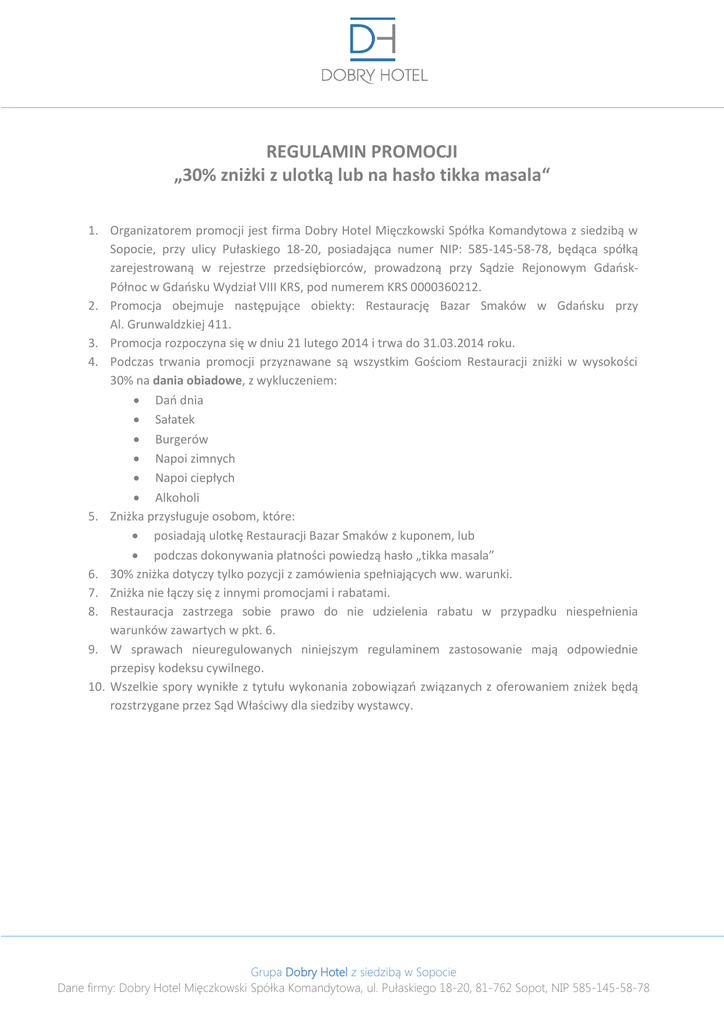 REGULAMIN PROMOCJI „30% zniżki z ulotką lub na hasło tikka masala“ 1. Organizatorem promocji jest firma Dobry Hotel Mięczkowski Spółka Komandytowa z siedzibą w Sopocie, przy ulicy Pułaskiego 18-20, posiadająca numer NIP: 585-145-58-78, będąca spółką zarejestrowaną w rejestrze przedsiębiorców, prowadzoną przy Sądzie Rejonowym GdańskPółnoc w Gdańsku Wydział VIII KRS, pod numerem KRS 0000360212. 2. Promocja obejmuje następujące obiekty: Restaurację Bazar Smaków w Gdańsku przy Al. Grunwaldzkiej 411. 3. Promocja rozpoczyna się w dniu 21 lutego 2014 i trwa do 31.03.2014 roku. 4. Podczas trwania promocji przyznawane są wszystkim Gościom Restauracji zniżki w wysokości 30% na dania obiadowe, z wykluczeniem:  Dań dnia  Sałatek  Burgerów  Napoi zimnych  Napoi ciepłych  Alkoholi 5. Zniżka przysługuje osobom, które:  posiadają ulotkę Restauracji Bazar Smaków z kuponem, lub  podczas dokonywania płatności powiedzą hasło „tikka masala” 6. 30% zniżka dotyczy tylko pozycji z zamówienia spełniających ww. warunki. 7. Zniżka nie łączy się z innymi promocjami i rabatami. 8. Restauracja zastrzega sobie prawo do nie udzielenia rabatu w przypadku niespełnienia warunków zawartych w pkt. 6. 9. W sprawach nieuregulowanych niniejszym regulaminem zastosowanie mają odpowiednie przepisy kodeksu cywilnego. 10. Wszelkie spory wynikłe z tytułu wykonania zobowiązań związanych z oferowaniem zniżek będą rozstrzygane przez Sąd Właściwy dla siedziby wystawcy. Grupa Dobry Hotel z siedzibą w Sopocie Dane firmy: Dobry Hotel Mięczkowski Spółka Komandytowa, ul. Pułaskiego 18-20, 81-762 Sopot, NIP 585-145-58-78