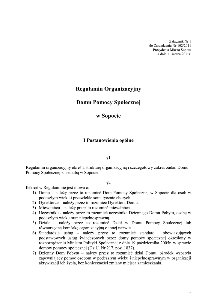 Załącznik Nr 1 do Zarządzenia Nr 102/2011 Prezydenta Miasta Sopotu z dnia 11 marca 2011r. Regulamin Organizacyjny Domu Pomocy Społecznej w Sopocie I Postanowienia ogólne §1 Regulamin organizacyjny określa strukturę organizacyjną i szczegółowy zakres zadań Domu Pomocy Społecznej z siedzibą w Sopocie. §2 Ilekroć w Regulaminie jest mowa o: 1) Domu – naleŜy przez to rozumieć Dom Pomocy Społecznej w Sopocie dla osób w podeszłym wieku i przewlekle somatycznie chorych. 2) Dyrektorze – naleŜy przez to rozumieć Dyrektora Domu. 3) Mieszkańcu – naleŜy przez to rozumieć mieszkańca. 4) Uczestniku - naleŜy przez to rozumieć uczestnika Dziennego Domu Pobytu, osobę w podeszłym wieku oraz niepełnosprawną. 5) Dziale – naleŜy przez to rozumieć Dział w Domu Pomocy Społecznej lub równorzędną komórkę organizacyjną o innej nazwie. 6) Standardzie usług - naleŜy przez to rozumieć standard obowiązujących podstawowych usług świadczonych przez domy pomocy społecznej określony w rozporządzeniu Ministra Polityki Społecznej z dnia 19 października 2005r. w sprawie domów pomocy społecznej (Dz.U. Nr 217, poz. 1837). 7) Dzienny Dom Pobytu – naleŜy przez to rozumieć dział Domu, ośrodek wsparcia zapewniający pomoc osobom w podeszłym wieku i niepełnosprawnym w organizacji aktywizacji ich Ŝycia, bez konieczności zmiany miejsca zamieszkania. 1 §3 Dom działa na podstawie: 1) ustawy z dnia 12 marca 2004 r. o pomocy społecznej ( Dz. U. 2009 Nr 175, poz. 1392 z późn. zm.) 2) rozporządzenia z dnia 19 października 2005 r. w sprawie domów pomocy społecznej (Dz.U. Nr 217, poz. 1837), 3) ustawie z dnia 5 czerwca 1998 r. o samorządzie powiatowym (Dz. U. 2001 r. Nr 142, poz. 1592 z późn. zm.) 4) ustawie z dnia 27 sierpnia 2009 r. o finansach publicznych (Dz.U. Nr 157, poz. 1240) 5) Uchwały Nr XXXIX/461/2010 z dnia 30 kwietnia 2010 roku Rady Miasta Sopotu w sprawie utworzenia jednostki organizacyjnej Miasta Sopotu – Domu Pomocy Społecznej w Sopocie dla osób w podeszłym wieku i przewlekle somatycznie chorych, 6) Uchwały Nr XXXIX/462/2010 z dnia 30 kwietnia 2010 roku Rady Miasta Sopotu w sprawie nadania statutu Domowi Pomocy Społecznej w Sopocie. §4 Dom jest jednostką organizacyjną pomocy społecznej, prowadzącą gospodarkę finansową w formie jednostki budŜetowej Miasta Sopotu o zasięgu gminnym. §5 1. Dom przeznaczony jest dla: - osób w podeszłym wieku - osób przewlekle somatycznie chorych. 2. Dom posiada 83 miejsca, w tym 48 dla osób w podeszłym wieku i 35 dla osób przewlekle somatycznie chorych. II Ogólne cele i zadania Domu §6 1. Działalność Domu łączy dzienną opiekę dla osób w podeszłym wieku oraz całodobową opiekę dla osób w podeszłym wieku i przewlekle somatycznie chorych poprzez: - zapewnienie mieszkańcom całodobowej opieki oraz zaspokojenie ich niezbędnych potrzeb bytowych, opiekuńczych, wspomagających na poziomie obowiązującego standardu, w zakresie i formach wynikających z indywidualnych potrzeb mieszkańców, 2 - świadczenie dziennych usług opiekuńczych i specjalistycznych usług opiekuńczych dla osób w nim niezamieszkujących oraz wsparcia w ramach Dziennego Domu Pobytu. 2. Organizacja Domu, zakres i poziom świadczonych usług uwzględnia w szczególności wolność, intymność, godność i poczucie bezpieczeństwa mieszkańców Domu oraz stopień ich fizycznej i psychicznej sprawności. §7 1.Dom świadczy mieszkańcom usługi bytowe, opiekuńcze i wspomagające. 2. Dom świadczy usługi bytowe zapewniając: a) miejsce zamieszkania w budynku i otoczeniu bez barier architektonicznych z dwoma windami dostosowanymi do potrzeb osób niepełnosprawnych, wyposaŜony w system przyzywowo - alarmowy i alarmowo - przeciwpoŜarowy, b) pomieszczenia: - pokoje mieszkalne jednoosobowe i wieloosobowe, - pokoje dziennego pobytu, - jadalnię, - gabinet medycznej pomocy doraźnej, - pomieszczenia do terapii i rehabilitacji, - kuchenkę pomocniczą, - pomieszczenie pomocnicze do prania i suszenia, - palarnię, - pokoje gościnne, - miejsce kultu religijnego zgodne z wyznaniem mieszkańca Domu, - bibliotekę, - czytelnię, - kawiarenkę internetową, - pomieszczenia techniczne słuŜące zaspokajaniu potrzeb sanitarnych mieszkańców Domu, c) WyŜywienie: - 3 posiłki dziennie, - moŜliwość wyboru posiłków lub otrzymania posiłku dodatkowego oraz dietetycznego, zgodnie ze wskazaniami lekarza, - podstawowe produkty Ŝywnościowe oraz napoje dostępne całą dobę. d) odzieŜ i obuwie mieszkańcom Domu nieposiadającym własnej odzieŜy i obuwia oraz moŜliwości ich zakupienia z własnych środków: odzieŜ całodzienną i zewnętrzną (płaszcze, kurtki); bieliznę dzienną i nocną; obuwie i pantofle domowe – odpowiedniego rozmiaru, dostosowane do pory roku, utrzymane w czystości i wymieniane w razie potrzeby. e) pomoc w utrzymaniu higieny osobistej, a w przypadku gdy mieszkańcy sami nie są w stanie zapewnić sobie środków czystości i higienicznych, zapewnia się im, w miarę potrzeb: osobiste środki czystości, przybory toaletowe, ręczniki, pościel i inne niezbędne przedmioty. 2. a) b) c) Dom świadczy mieszkańcom usługi opiekuńcze polegające na: udzielaniu pomocy w podstawowych czynnościach Ŝyciowych, pielęgnacji, udzielaniu niezbędnej pomocy w załatwianiu spraw codziennych. 3 3. a) b) c) d) e) f) g) h) i) j) k) l) m) n) o) p) Dom świadczy mieszkańcom usługi wspomagające, polegające na: pracy socjalnej, umoŜliwieniu udziału w pracowniach terapii, podnoszeniu sprawności i aktywizowaniu mieszkańców, umoŜliwieniu zaspokojenia potrzeb religijnych i kulturalnych, zapewnieniu warunków do rozwoju samorządności mieszkańców, stymulowaniu nawiązywania, utrzymywania i rozwijania kontaktów z rodziną i środowiskiem, działaniach zmierzających do usamodzielnienia mieszkańca, w miarę jego moŜliwości, zapewnieniu bezpiecznego przechowywania środków pienięŜnych i przed
