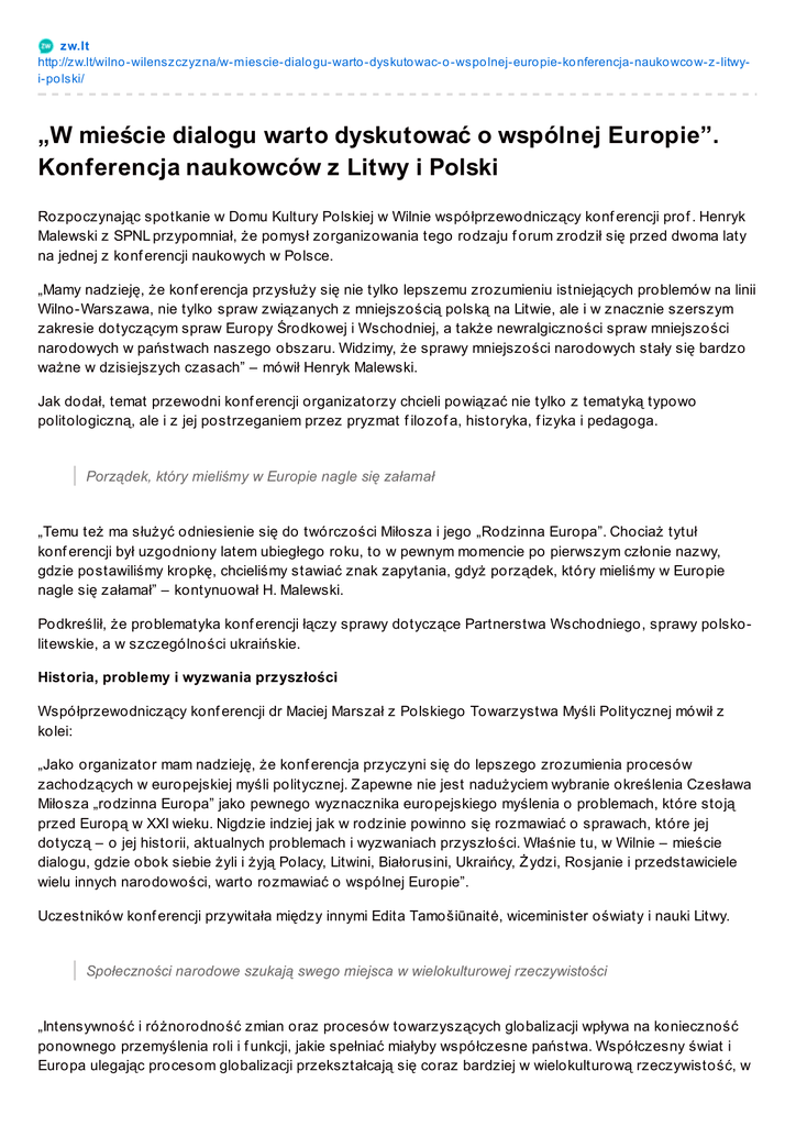 zw.lt http://zw.lt/wilno -wilenszczyzna/w-miescie-dialo gu-warto -dyskuto wac-o -wspo lnej-euro pie-ko nferencja-nauko wco w-z-litwyi-po lski/ „W mieście dialogu warto dyskutować o wspólnej Europie”. Konferencja naukowców z Litwy i Polski Rozpoczynając spotkanie w Domu Kultury Polskiej w Wilnie współprzewodniczący konf erencji prof . Henryk Malewski z SPNL przypomniał, że pomysł zorganizowania tego rodzaju f orum zrodził się przed dwoma laty na jednej z konf erencji naukowych w Polsce. „Mamy nadzieję, że konf erencja przysłuży się nie tylko lepszemu zrozumieniu istniejących problemów na linii Wilno-Warszawa, nie tylko spraw związanych z mniejszością polską na Litwie, ale i w znacznie szerszym zakresie dotyczącym spraw Europy Środkowej i Wschodniej, a także newralgiczności spraw mniejszości narodowych w państwach naszego obszaru. Widzimy, że sprawy mniejszości narodowych stały się bardzo ważne w dzisiejszych czasach” – mówił Henryk Malewski. Jak dodał, temat przewodni konf erencji organizatorzy chcieli powiązać nie tylko z tematyką typowo politologiczną, ale i z jej postrzeganiem przez pryzmat f ilozof a, historyka, f izyka i pedagoga. Porządek, który mieliśmy w Europie nagle się załamał „Temu też ma służyć odniesienie się do twórczości Miłosza i jego „Rodzinna Europa”. Chociaż tytuł konf erencji był uzgodniony latem ubiegłego roku, to w pewnym momencie po pierwszym członie nazwy, gdzie postawiliśmy kropkę, chcieliśmy stawiać znak zapytania, gdyż porządek, który mieliśmy w Europie nagle się załamał” – kontynuował H. Malewski. Podkreślił, że problematyka konf erencji łączy sprawy dotyczące Partnerstwa Wschodniego, sprawy polskolitewskie, a w szczególności ukraińskie. Historia, problemy i wyzwania przyszłości Współprzewodniczący konf erencji dr Maciej Marszał z Polskiego Towarzystwa Myśli Politycznej mówił z kolei: „Jako organizator mam nadzieję, że konf erencja przyczyni się do lepszego zrozumienia procesów zachodzących w europejskiej myśli politycznej. Z apewne nie jest nadużyciem wybranie określenia Czesława Miłosza „rodzinna Europa” jako pewnego wyznacznika europejskiego myślenia o problemach, które stoją przed Europą w XXI wieku. Nigdzie indziej jak w rodzinie powinno się rozmawiać o sprawach, które jej dotyczą – o jej historii, aktualnych problemach i wyzwaniach przyszłości. Właśnie tu, w Wilnie – mieście dialogu, gdzie obok siebie żyli i żyją Polacy, Litwini, Białorusini, Ukraińcy, Ż ydzi, Rosjanie i przedstawiciele wielu innych narodowości, warto rozmawiać o wspólnej Europie”. Uczestników konf erencji przywitała między innymi Edita Tamošiūnaitė, wiceminister oświaty i nauki Litwy. Społeczności narodowe szukają swego miejsca w wielokulturowej rzeczywistości „Intensywność i różnorodność zmian oraz procesów towarzyszących globalizacji wpływa na konieczność ponownego przemyślenia roli i f unkcji, jakie spełniać miałyby współczesne państwa. Współczesny świat i Europa ulegając procesom globalizacji przekształcają się coraz bardziej w wielokulturową rzeczywistość, w której swojego miejsca szukają także wspólnoty narodowe. Głębszej ref leksji wymaga zatem poczucie własnej tożsamości narodowej wśród współcześnie f unkcjonujących w Europie dużych i małych społeczności” – zaznaczyła wiceminister. Czy istnieje wspólna tożsamość europejska? Ambasador RP na Litwie Jarosław Czubiński, który objął konf erencję swoim patronatem, nawiązał w swoim wystąpieniu do słów prezydenta USA Johna Kennedy’ego, wypowiedzianych w 1963 r. podczas pobytu w Republice Federalnej Niemiec: „Ich bin ein Berliner” – „Jestem berlińczykiem” „Jako ambasador Rzeczpospolitej Polskiej przebywam na Litwie już od dziewięciu miesięcy, reprezentując tu polską rację stanu i nasze interesy oraz sprzyjając rozwojowi współpracy między naszymi krajami. Uwzględniając kontekst berlińskiej wypowiedzi prezydenta Kennedy’ego, w świetle spraw, które potraf ią tak silnie angażować nasze społeczeństwa i państwa zarówno w wymiarze historycznym, jak i bieżącym, z pełną świadomością znaczenia wypowiadanych słów stwierdzam – prisirišimu prie miesto jau esu vilnietis – z przywiązania do miasta już jestem wilniukiem” – powiedział Jarosław Czubiński. „Czy rzeczywiście obiektywnie i poprzez wieki istnieje pewna wspólna tożsamość Europy, którą zaczęto nazywać Europą Środkową? Miłosz sądził, że tak. Składa się na nią, w jego opinii, pewien dystans wobec wielkiej historii – mnie natomiast wydaje się, że może pewna f orma determinizmu – ale jednocześnie silna zależność od niej, a także pewne unikalne, niespotykane nigdzie indziej stany świadomościowe mieszkańców tego regionu. Czy mistrz Miłosz miał rację? Nie wiem, nie mnie to osądzać, jeszcze zbyt młodym wilniukiem jestem. Są do tego powołani inni, których elita zebrała się w tej sali. Z niecierpliwością oczekuję rezultatów konf erencji” – dodał ambasador Polski. Myśl polityczna na Litwie nie istnieje Sygnatariusz Aktu Niepodległości, prawnik Czesław Okińczyc w swoim przemówieniu żałował, że w konf erencji bierze udział tak mało naukowców Litwinów. „W obliczu zagrożeń, które czyhają, musimy od nowa spojrzeć na siebie, na historię, relacje polityczne i wyciągnąć z tego daleko idące wnioski. Rozmowa Polaków z Polakami jest potrzebna, ale rozmowa Polaków z Litwinami na poziomie intelektualnym mogłaby być bardziej skuteczna” – wyraził opinię Cz. Okińczyc. Panuje kompletny chaos, nie wiadomo, kto jest kim Odnotował, że myśl przewodnia konf erencji jest szczególnie aktualna dla Litwy, gdzie myśl polityczna jako taka nie istnieje. „Kompletny chaos, nie wiadomo, kto kim jest. Nie ma ani klasycznych konserwatystów, ani li