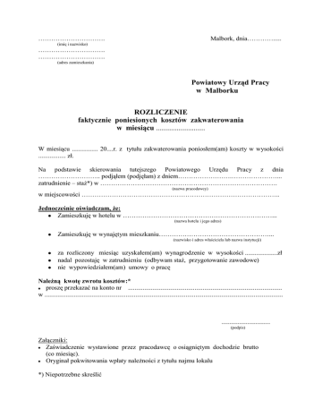 …………………………. Malbork, dnia…………..... (imię i nazwisko) …………………………. …………………………. (adres zamieszkania) Powiatowy Urząd Pracy w Malborku ROZLICZENIE faktycznie poniesionych kosztów zakwaterowania w miesiącu .......................... W miesiącu ................ 20....r. z tytułu zakwaterowania poniosłem(am) koszty w wysokości ................. zł. Na podstawie skierowania tutejszego Powiatowego Urzędu Pracy z dnia ……………………….. podjąłem (podjęłam) z dniem…………………….…………………... zatrudnienie – staż*) w ………………………………………………………………………. (nazwa pracodawcy) w miejscowości ……………………………………………………………………………….. Jednocześnie oświadczam, że: Zamieszkuję w hotelu w ……………………………………………………………... (nazwa hotelu i jego adres) Zamieszkuję w wynajętym mieszkaniu……………………………………………... (nazwisko i adres właściciela lub nazwa instytucji) za rozliczony miesiąc uzyskałem(am) wynagrodzenie w wysokości ....................zł nadal pozostaję w zatrudnieniu (odbywam staż, przygotowanie zawodowe) nie wypowiedziałem(am) umowy o pracę Należną kwotę zwrotu kosztów:* proszę przekazać na konto nr ............................................................................................... w ................................................................................................................................................... .............................. (podpis) Załączniki: Zaświadczenie wystawione przez pracodawcę o osiągniętym dochodzie brutto (co miesiąc). Oryginał pokwitowania wpłaty należności z tytułu najmu lokalu *) Niepotrzebne skreślić