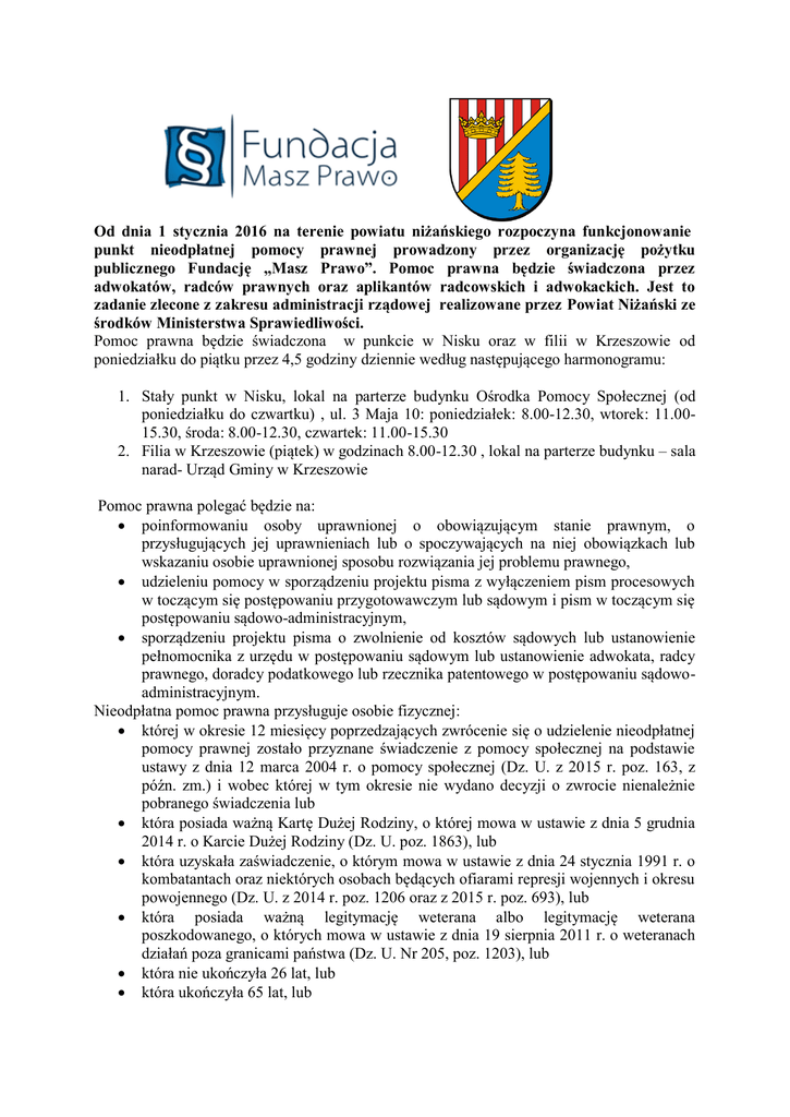 Od dnia 1 stycznia 2016 na terenie powiatu niżańskiego rozpoczyna funkcjonowanie punkt nieodpłatnej pomocy prawnej prowadzony przez organizację pożytku publicznego Fundację „Masz Prawo”. Pomoc prawna będzie świadczona przez adwokatów, radców prawnych oraz aplikantów radcowskich i adwokackich. Jest to zadanie zlecone z zakresu administracji rządowej realizowane przez Powiat Niżański ze środków Ministerstwa Sprawiedliwości. Pomoc prawna będzie świadczona w punkcie w Nisku oraz w filii w Krzeszowie od poniedziałku do piątku przez 4,5 godziny dziennie według następującego harmonogramu: 1. Stały punkt w Nisku, lokal na parterze budynku Ośrodka Pomocy Społecznej (od poniedziałku do czwartku) , ul. 3 Maja 10: poniedziałek: 8.00-12.30, wtorek: 11.0015.30, środa: 8.00-12.30, czwartek: 11.00-15.30 2. Filia w Krzeszowie (piątek) w godzinach 8.00-12.30 , lokal na parterze budynku – sala narad- Urząd Gminy w Krzeszowie Pomoc prawna polegać będzie na: poinformowaniu osoby uprawnionej o obowiązującym stanie prawnym, o przysługujących jej uprawnieniach lub o spoczywających na niej obowiązkach lub wskazaniu osobie uprawnionej sposobu rozwiązania jej problemu prawnego, udzieleniu pomocy w sporządzeniu projektu pisma z wyłączeniem pism procesowych w toczącym się postępowaniu przygotowawczym lub sądowym i pism w toczącym się postępowaniu sądowo-administracyjnym, sporządzeniu projektu pisma o zwolnienie od kosztów sądowych lub ustanowienie pełnomocnika z urzędu w postępowaniu sądowym lub ustanowienie adwokata, radcy prawnego, doradcy podatkowego lub rzecznika patentowego w postępowaniu sądowoadministracyjnym. Nieodpłatna pomoc prawna przysługuje osobie fizycznej: której w okresie 12 miesięcy poprzedzających zwrócenie się o udzielenie nieodpłatnej pomocy prawnej zostało przyznane świadczenie z pomocy społecznej na podstawie ustawy z dnia 12 marca 2004 r. o pomocy społecznej (Dz. U. z 2015 r. poz. 163, z późn. zm.) i wobec której w tym okresie nie wydano decyzji o zwrocie nienależnie pobranego świadczenia lub która posiada ważną Kartę Dużej Rodziny, o której mowa w ustawie z dnia 5 grudnia 2014 r. o Karcie Dużej Rodziny (Dz. U. poz. 1863), lub która uzyskała zaświadczenie, o którym mowa w ustawie z dnia 24 stycznia 1991 r. o kombatantach oraz niektórych osobach będących ofiarami represji wojennych i okresu powojennego (Dz. U. z 2014 r. poz. 1206 oraz z 2015 r. poz. 693), lub która posiada ważną legitymację weterana albo legitymację weterana poszkodowanego, o których mowa w ustawie z dnia 19 sierpnia 2011 r. o weteranach działań poza granicami państwa (Dz. U. Nr 205, poz. 1203), lub która nie ukończyła 26 lat, lub która ukończyła 65 lat, lub która w wyniku wystąpienia klęski żywiołowej, katastrofy naturalnej lub awarii technicznej znalazła się w sytuacji zagrożenia lub poniosła straty. Uprawnieni będą mogli uzyskać informacje w zakresie: prawa pracy, spraw karnych, spraw administracyjnych spraw rodzinnych, przygotowania do rozpoczęcia działalności gospodarczej, ubezpieczenia społecznego, spraw podatkowych z wyłączeniem spraw podatkowych związanych z prowadzeniem działalności gospodarczej. Nieodpłatna pomoc prawna nie obejmuje spraw: 1) podatkowych związanych z prowadzeniem działalności gospodarczej; 2) z zakresu prawa celnego, dewizowego i handlowego; 3) związanych z prowadzeniem działalności gospodarczej, z wyjątkiem przygotowania do rozpoczęcia tej działalności.