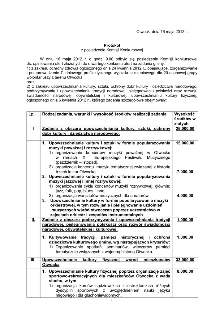 Otwock, dnia 16 maja 2012 r. Protokół z posiedzenia Komisji Konkursowej W dniu 16 maja 2012 r. o godz. 9.00 odbyło się posiedzenie Komisji konkursowej ds. opiniowania ofert złożonych do otwartego konkursu ofert na zadania gminy: 1) z zakresu ochrony zdrowia ogłoszonego dnia 24 kwietnia 2012 r., obejmujące, zorganizowanie i przeprowadzenie 7- dniowego profilaktycznego wyjazdu szkoleniowego dla 20-osobowej grupy wolontariuszy z terenu Otwocka oraz 2) z zakresu upowszechniania kultury, sztuki, ochrony dóbr kultury i dziedzictwa narodowego, podtrzymywaniu i upowszechnianiu tradycji narodowej, pielęgnowaniu polskości oraz rozwoju świadomości narodowej, obywatelskiej i kulturowej, upowszechnianiu kultury fizycznej, ogłoszonego dnia 6 kwietnia 2012 r., którego zadania szczegółowe obejmowały: Lp. I. II. III. Rodzaj zadania, warunki i wysokość środków realizacji zadania Wysokość środków w złotych Zadania z obszaru upowszechniania kultury, sztuki, ochrony 26.000,00 dóbr kultury i dziedzictwa narodowego: 1. Upowszechnianie kultury i sztuki w formie popularyzowania muzyki poważnej i rozrywkowej: 1) organizowanie koncertów muzyki poważnej w Otwocku w ramach IX Europejskiego Festiwalu Muzycznego (październik –listopad), 2) organizacja koncertu muzyki tematycznej związanej z historią trzech kultur Otwocka. 2. Upowszechnianie kultury i sztuki w formie popularyzowania muzyki jazzowej i innej rozrywkowej: 1) organizowanie cyklu koncertów muzyki rozrywkowej, głównie: jazz, folk, pop, blues i inne, 2) organizacja warsztatów muzycznych dla amatorów. 3. Upowszechnianie kultury w formie popularyzowania muzyki orkiestrowej, w tym rozwijanie i pielęgnowanie uzdolnień muzycznych wśród otwocczan poprzez uczestnictwo w zajęciach orkiestr i zespołów instrumentalnych. Zadania z obszaru podtrzymywania i upowszechniania tradycji narodowej, pielęgnowania polskości oraz rozwój świadomości narodowej, obywatelskiej i kulturowej: 15.000,00 1. Kultywowanie tradycji, pamięci historycznej i ochrona dziedzictwa kulturowego gminy, wg następujących kryteriów: 1) Organizowanie spotkań, seminariów, wieczorów pamięci tematycznie związanych z wojenną historią Otwocka. 1.000,00 Upowszechnianie Otwocka mieszkańców 33.000,00 1. Upowszechnianie kultury fizycznej poprzez organizację zajęć sportowo-rekreacyjnych dla mieszkańców Otwocka z wadą słuchu, w tym: 1) organizacja kursów sędziowskich i instruktorskich różnych dyscyplin sportowych z uwzględnieniem nauki języka migowego i dla głuchoniewidomych, 8.000,00 kultury fizycznej 1 wśród 7.000,00 4.000,00 1.000,00 2) organizacja turniejów, mitingów, zlotów dla otwocczan. 7.000,00 2. Upowszechnianie kultury fizycznej wśród mieszkańców Otwocka poprzez organizację integracyjnych zajęć sportowych, szkoleń i rejsów w sekcji żeglarskiej. 3. Upowszechnianie kultury fizycznej wśród mieszkańców Otwocka poprzez organizowanie pozalekcyjnych zajęć sportowych w sekcji szachów, w tym w szczególności: 1) organizacja edukacji sportowej, 2) organizacja i uczestnictwo w zawodach. 4. Upowszechnianie kultury fizycznej wśród dzieci, młodzieży i dorosłych z Otwocka poprzez organizację zajęć sportowych w sekcji kolarskiej, w tym w szczególności: 1) organizacja edukacji, szkoleń i treningów dla otwocczan, 2) udział w zawodach, w tym promocja Otwocka. 15.000,00 3.000,00 Komisja konkursowa do spraw opiniowania ofert została powołana Zarządzeniem Nr 234/2011 Prezydenta Miasta Otwocka z dnia 29 listopada 2011 r. w sprawie powołania Komisji Konkursowej do spraw opiniowania ofert złożonych przez organizacje pozarządowe i podmioty, o których mowa w art. 3 ust 3 ustawy z dnia 24 kwietnia 2003 r. o działalności pożytku publicznego i o wolontariacie (Dz.U. z 2010 r. Nr 234, poz. 1536 z późn. zmianami). Komisję powołano w składzie: 1. 2. 3. 4. 5. 6. 7. Artur G. Brodowski - przedstawiciel Miasta Otwocka - Przewodniczący Komisji. Izabela Milewska - przedstawiciel Miasta Otwocka - Wiceprzewodnicząca Komisji. Agnieszka Dąbrowska - przedstawiciel Miasta Otwocka - Sekretarz Komisji. Wanda Kowalska - przedstawiciel Miasta Otwocka. Marta Woźniak – przedstawiciel Miasta Otwocka. Kazimiera Oszajca- Wiernicka – przedstawiciel organizacji pozarządowej. Zbigniew Wiliński - przedstawiciel organizacji pozarządowej. Na posiedzeniu nieobecna była Pani Kazimiera Oszajca – Wiernicka, Pan Zbigniew Wiliński. I. Na zadanie z zakresu ochrony zdrowia wpłynęła 1 oferta. Oferta została złożona przez Polski Związek Żeglarzy Niepełnosprawnych Regionalną Sekcję Mazowiecką w Nadbrzeżu z wnioskiem o wsparcie realizacji zadania w kwocie 15.000 zł. II. Na zadania z zakresu upowszechniania kultury, sztuki, ochrony dóbr kultury i dziedzictwa narodowego, podtrzymywania i upowszechniania tradycji narodowej, pielęgnowania polskości oraz rozwój świadomości narodowej, obywatelskiej i kulturowej, upowszechnianie kultury fizycznej wpłynęło łącznie 7 ofert, w tym: 1. Na zadanie z zakresu upowszechniania kultury i sztuki w formie popularyzowania muzyki poważnej i rozrywkowej wpłynęła: 1) Oferta została złożona przez Fundację Promocji Kultury „Otwarte” w Otwocku przy ul. Łukasińskiego 30 A z wnioskiem o wsparcie realizacji zadania w kwocie 15.000 zł. 2) Oferta została złożona przez Otwockie Towarzystwo Bluesa i Ballady w Otwocku przy ul. Pułaskiego 6 m. 5 z wnioskiem o wsparcie realizacji zadania w kwocie 7.000 zł. 3) Oferta została złożona przez Stowarzyszenie „Gloria”” w Otwocku przy ul. Czerskiej 21 z wnioskiem o wsparcie realizacji zadania w kwocie 4.000 zł. 2 2. Na zadania z zakresu podtrzymywania i upowszechniania tradycji narodowej, pielęgnowania polskości oraz rozwój świadomości narodowej, obywatelskiej i kulturowej wpłynęła jedna oferta została złożona przez Światowy Związek Żołnierzy Armii Krajowej Okręg Warszawa Powiat Koło Nr 4 „Fromczyn” 