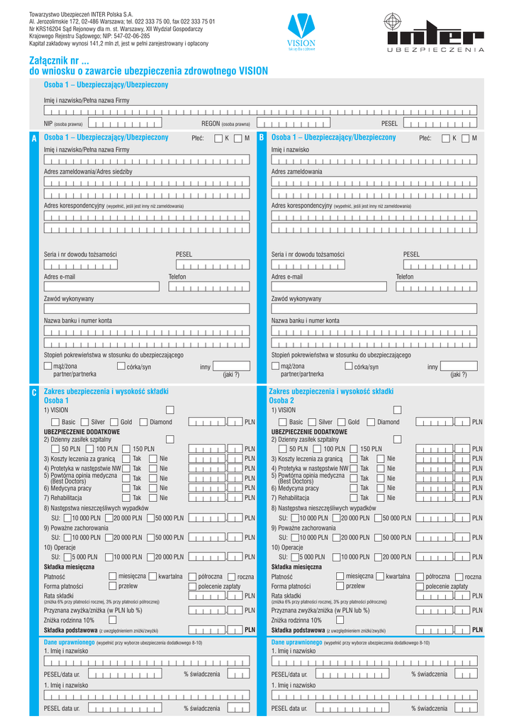 Towarzystwo Ubezpieczeń INTER Polska S.A. Al. Jerozolimskie 172, 02-486 Warszawa; tel. 022 333 75 00, fax 022 333 75 01 Nr KRS16204 Sąd Rejonowy dla m. st. Warszawy, XII Wydział Gospodarczy Krajowego Rejestru Sądowego; NIP: 547-02-06-285 Kapitał zakładowy wynosi 141,2 mln zł, jest w pełni zarejestrowany i opłacony Załącznik nr ... do wniosku o zawarcie ubezpieczenia zdrowotnego VISION Osoba 1 – Ubezpieczający/Ubezpieczony Imię i nazwisko/Pełna nazwa Firmy NIP (osoba prawna) REGON (osoba prawna) A Osoba 1 – Ubezpieczający/Ubezpieczony Płeć: K M PESEL B Osoba 1 – Ubezpieczający/Ubezpieczony Płeć: Imię i nazwisko/Pełna nazwa Firmy Imię i nazwisko Adres zameldowania/Adres siedziby Adres zameldowania Adres korespondencyjny (wypełnić, jeśli jest inny niż zameldowania) Adres korespondencyjny (wypełnić, jeśli jest inny niż zameldowania) Seria i nr dowodu tożsamości Seria i nr dowodu tożsamości PESEL Adres e-mail Zawód wykonywany Nazwa banku i numer konta Nazwa banku i numer konta Stopień pokrewieństwa w stosunku do ubezpieczającego Stopień pokrewieństwa w stosunku do ubezpieczającego córka/syn inny mąż/żona partner/partnerka (jaki ?) C Zakres ubezpieczenia i wysokość składki 1) VISION Silver Gold Diamond , 150 PLN , 3) Koszty leczenia za granicą Tak Nie , 4) Protetyka w następstwie NW 5) Powtórna opinia medyczna (Best Doctors) 6) Medycyna pracy Tak Nie Tak 7) Rehabilitacja inny Basic Silver Gold Diamond (jaki ?) , PLN , PLN , PLN Nie , PLN Tak Nie , PLN Tak Nie , PLN Tak Nie , PLN 50 000 PLN , PLN 50 000 PLN , PLN 20 000 PLN , PLN PLN 150 PLN PLN 3) Koszty leczenia za granicą Tak Nie , PLN Tak Nie , PLN Tak Nie , PLN 4) Protetyka w następstwie NW 5) Powtórna opinia medyczna (Best Doctors) 6) Medycyna pracy Tak Nie , PLN 7) Rehabilitacja PLN 8) Następstwa nieszczęśliwych wypadków 20 000 PLN 10 000 PLN SU: PLN 9) Poważne zachorowania 20 000 PLN 10 000 PLN SU: PLN 10) Operacje 5 000 PLN SU: 9) Poważne zachorowania 20 000 PLN 10 000 PLN SU: 10) Operacje 5 000 PLN SU: PLN UBEZPIECZENIE DODATKOWE 2) Dzienny zasiłek szpitalny 50 PLN 100 PLN 8) Następstwa nieszczęśliwych wypadków 20 000 PLN 10 000 PLN SU: 10 000 PLN 50 000 PLN , 50 000 PLN , 20 000 PLN , Składka miesięczna 10 000 PLN Składka miesięczna Płatność miesięczna Forma płatności Rata składki przelew kwartalna (zniżka 6% przy płatności rocznej, 3% przy płatności półrocznej) półroczna roczna polecenie zapłaty , PLN , Przyznana zwyżka/zniżka (w PLN lub %) PLN Zniżka rodzinna 10% Płatność miesięczna Forma płatności Rata składki przelew kwartalna (zniżka 6% przy płatności rocznej, 3% przy płatności półrocznej) półroczna roczna polecenie zapłaty , PLN Przyznana zwyżka/zniżka (w PLN lub %) , PLN , PLN Zniżka rodzinna 10% , Składka podstawowa (z uwzględnieniem zniżki/zwyżki) Dane uprawnionego (wypełnić przy wyborze ubezpieczenia dodatkowego 8-10) 1. Imię i nazwisko % świadczenia 1. Imię i nazwisko PESEL data ur. córka/syn 1) VISION UBEZPIECZENIE DODATKOWE 2) Dzienny zasiłek szpitalny 50 PLN 100 PLN PESEL/data ur. M Zakres ubezpieczenia i wysokość składki Osoba 2 Osoba 1 Basic Telefon Zawód wykonywany mąż/żona partner/partnerka K PESEL Adres e-mail Telefon PLN Składka podstawowa (z uwzględnieniem zniżki/zwyżki) Dane uprawnionego (wypełnić przy wyborze ubezpieczenia dodatkowego 8-10) 1. Imię i nazwisko PESEL/data ur. % świadczenia 1. Imię i nazwisko % świadczenia PESEL data ur. % świadczenia C Liczba osób ubezpieczonych (razem z załącznikami do wniosku) Wykup ogólnego okresu karencji (jednorazowa opłata, OWU § 11.5) Osoba 1 D Początek ubezpieczenia Osoba 1 Składka łączna podstawowa (razem z załącznikami do wniosku) , 0 1 Wykup ogólnego okresu karencji (jednorazowa opłata, OWU § 11.5) PLN Osoba 2 Początek ubezpieczenia 2 0 Osoba 2 E Pytania dotyczące stanu zdrowia Ubezpieczonego 0 1 , PLN , PLN 2 0 Osoba 1 Osoba 2 1. Czy w chwili obecnej jest Pani/Pan w trakcie leczenia lub cierpi na jakieś dolegliwości zdrowotne ? Tak Nie Tak Nie 2. Czy występowały lub występują u Pani/Pana choroby przewlekłe ? Tak Nie Tak Nie 3. Czy cierpi lub cierpiał/a Pani/Pan na choroby zawodowe lub inne związane z wykonywanym zawodem ? Tak Nie Tak Nie 4. Czy w okresie ostatnich 10 lat był/a Pani/Pan leczona/y w szpitalu lub poddana/y operacji (także zabiegom chirurgicznym) ? Jeśli TAK – konieczne jest przedłożenie karty leczenia lub karty wypisu ze szpitala. Tak Nie Tak Nie 5. Czy w okresie ostatnich 5 lat wystąpiły u Pani/Pana i zostały stwierdzone lub leczone (także zapobiegawczo) jakiekolwiek choroby, dolegliwości lub następstwa wypadku ? Tak Nie Tak Nie 6. Czy w okresie ostatnich 6 miesięcy z przyczyn zdrowotnych przyjmowała/ł Pani/Pan leki ? Jeśli TAK – prosimy podać nazwę leku, dawkę oraz w związku z jakim zachorowaniem był przyjmowany. Tak Nie Tak Nie 7. Czy zostało stwierdzone u Pani / Pana zakażenie wirusem HIV lub żółtaczki typu C ? Tak Nie Tak Nie 8. Czy istnieje u Pani/Pana wada wzroku ? Tak Nie Tak Nie L P L P Nie Tak Jeśli tak, prosimy podać ilość dioptrii. Tak 9. Czy jest Pani w ciąży ? Nie miesiąc Jeśli tak, to prosimy podać w którym miesiącu miesiąc 10.Waga ciała kg kg cm cm Wzrost 11.Czy pali Pani/Pan papierosy ? Tak Nie Tak Nie 12.a) Czy zostały Pani/Panu usunięte zęby (za wyjątkiem zębów mlecznych i mądrości) ? Tak Nie Tak Nie Tak Nie Tak Nie Tak Nie Tak Nie b) Liczba brakujących i niezastąpionych zębów ? (zwyżka za każdy brakujący i niezastąpiony ząb w VISION Gold – 5 PLN, w VISION Diamond – 10 PLN) c) Liczba zastąpionych zębów i liczba koron ? d) Czy stwierdzona została choroba przyzębia lub nieprawidłowe ustawienie zębów ? e) Czy w chwili obecnej jest Pan/Pani w trakcie leczenia dentystycznego (uzupełnianie ubytków, wstawianie koron, implantów, leczenie ortodontyczne, leczenia paradontozy) lub czy takie leczenie jest z