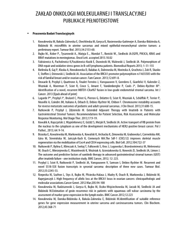 ZAKŁAD ONKOLOGII MOLEKULARNEJ I TRANSLACYJNEJ PUBLIKACJE PEŁNOTEKSTOWE • Pracownia Badań Translacyjnych: 1. Kowalewska M, Bakula-Zalewska E, Chechlinska M, Goryca K, Nasierowska-Guttmejer A, Danska-Bidzinska A, Bidzinski M. microRNAs in uterine sarcomas and mixed epithelial-mesenchymal uterine tumors: a preliminary report. Tumour Biol. 2013;34:2153-60. 2. Bujko M., Kober P., Tysarowski A., Matyja E.., Mandat T., Bonicki W., Siedlecki JA.EGFR, PIK3CA, KRAS and BRAF mutations in meningiomas. Oncol Lett. accepted 2013.10.02 3. Fabisiewicz A, Pacholewicz K,Paszkiewicz-Kozik E, Osowiecki M, Walewski J, Siedlecki JA. Polymorphism of DNA repair and oxidative stress genes in B-cell lymphoma patients. Biomedical Reports 2013; 1: 51-155 4. Bielinska B, Gaj P, Kluska A, Nowakowska D, Balabas A, Dabrowska M, Niwinska A, Gruchota J, Zub R, Skasko E, Steffen J, Ostrowski J, Siedlecki JA. Association of the BRCA1 promoter polymorphism rs11655505 with the risk of familial breast and/or ovarian cancer. Fam Cancer. 2013;12:691-8. 5. Dewaele B, Przybyl J, Quattrone A, Finalet Ferreiro J, Vanspauwen V, Geerdens E, Gianfelici V, Kalender Z, Wozniak A, Moerman P, Sciot R, Croce S, Amant F, Vandenberghe P, Cools J*, Debiec-Rychter M*. Identification of a novel, recurrent MBTD1-CXorf67 fusion in low-grade endometrial stromal sarcoma. Int J Cancer. 2013 [Epub ahead of print] 6. Lagarde P*, Przybyl J*, Brulard C, Pérot G, Pierron G, Delattre O, Sciot R, Wozniak A, Schöffski P, Terrier P, Neuville A, Coindre JM, Italiano A, Orbach D, Debiec-Rychter M, Chibon F. Chromosome instability accounts for reverse metastatic outcomes of pediatric and adult synovial sarcomas. J Clin Oncol. 2013;31:608-15. 7. Rutkowski P, Przybył J, Zdzienicki M. Extended Adjuvant Therapy with Imatinib in Patients with Gastrointestinal Stromal Tumors: Recommendations for Patient Selection, Risk Assessment, and Molecular Response Monitoring. Mol Diagn Ther. 2013;17:9-19. 8. Kowalik A, Kopczyński J, Wypiórkiewicz E, Góźdź S, Meżyk R, Siedlecki JA. Active transport of RB protein from the nucleus to the cytoplasm as one of the development mechanisms of HER2-positive breast cancer. Pol J Pathol., 2013; 64: 9-14. 9. Brzoska E, Kowalewska M, Markowska A, Kowalski K, Archacka K, Zimowska M, Grabowska I, Czerwińska AM, Góra M, Stremińska W, Jańczyk-Ilach K, Ciemerych MA.The Sdf-1 (CXCL12) improves skeletal muscle regeneration via the mobilization of Cxcr4 and CD34 expressing cells. Biol Cell. 2012;104:722-37 10. Rutkowski P, Bylina E, Klimczak A, Switaj T, Falkowski S, Kroc J, Lugowska I, Brzeskwiniewicz M, Melerowicz W, Osuch C, Mierzejewska E, Wasielewski K, Woźniak A, Grzesiakowska U, Nowecki ZI, Siedlecki JA, Limon J. The outcome and predictive factors of sunitinib therapy in advanced gastrointestinal stromal tumors (GIST) after imatinib failure - one institution study. BMC Cancer, 2012; 12: 223. 11. Przybyl J, Sciot R, Rutkowski P, Siedlecki JA, Vanspauwen V, Samson I, Debiec-Rychter M. Recurrent and novel SS18-SSX fusion transcripts in synovial sarcoma: description of three new cases. Tumour Biol. 2012;33:2245-53. 12. Rzepecka IK, Szafron L, Stys A, Bujko M, Plisiecka-Halasa J, Madry R, Osuch B, Markowska J, Bidzinski M, Kupryjanczyk J. High frequency of allelic loss at the BRCA1 locus in ovarian cancers: clinicopathologic and molecular associations.Cancer Genet. 2012 Mar;205:94-100 13. Kowalewska M, Radziszewski J, Goryca K, Bujko M, Oczko-Wojciechowska M, Jarzab M, Siedlecki JA and Bidzinski M.Estimation of groin recurrence risk in patients with squamous cell vulvar carcinoma by the assessment of marker gene expression in the lymph nodes. BMC Cancer.2012;12:223 14. Kowalewska M, Danska-Bidzinska A, Bakula-Zalewska E, Bidzinski M.Identification of suitable reference genes for gene expression measurement in uterine sarcoma and carcinosarcoma tumors. Clin Biochem. 2012;45:368-71 ZAKŁAD ONKOLOGII MOLEKULARNEJ I TRANSLACYJNEJ PUBLIKACJE PEŁNOTEKSTOWE 15. Przybyl J, Jurkowska M, Rutkowski P, Debiec-Rychter M, Siedlecki JA. Downstream and intermediate interactions of synovial sarcoma-associated fusion oncoproteins and their implication for targeted therapy. Sarcoma. 2012;2012:249219. Epub 2012 Mar 25. 16. Rutkowski P, Badalamenti G, La Paglia L, Przybyl J, Debiec-Rychter M. Chapter: “Gene Signatures in Gastrointestinal Stromal Tumors”, Book Title: “Diagnostic, Prognostic, and Therapeutic Values of Gene Signatures”; “Current Clinical Pathology” series edited by A. Russo, S. Iacobelli, and J. L. Iovanna. Springer 2012, p.35-50. ISBN: 978-1-61779-358-5. 17. Rutkowski P, Wozniak A, Dębiec-Rychter M, Kąkol M, Dziewirski W, Zdzienicki M, Ptaszynski K, Jurkowska M, Limon J, Siedlecki JA. Clinical utility of the new American Joint Committee on Cancer staging system for gastrointestinal stromal tumors: current overall survival after primary tumor resection. Cancer, 2011; 117: 4916-24. 18. Fabisiewicz A., Paszkiewicz-Kozik E., Osowiecki M., Walewski J, Siedlecki J.A. FcgRIIA and FcgRIIIA polymorphisms do not influence survival and response to rituximab, cyclophosphamide, doxorubicin, vincristine, and prednisone immunochemotherapy in patients with diffuse large B-celllymphoma, Leukemia & Lymphoma 2011 ;52:1604-6 19. Kober P, Bujko M, Olędzki, J, Tysarowski A, Siedlecki JA."Methyl-CpG binding column-based identification of nine genes hypermethylated in colorectal cancer" Mol Carcinog. 2011;50:846-56 20. Walidacja wybranych ośrodków zaangażowanych w diagnostykę molekularną chorób nowotworowych w zakresie oznaczania mutacji w genie EGFR1. Tysarowski A, Kowalski D, Kowalczuk O. Onkol. Prakt. Klin. 2011; 7:138-145. 21. Chechlinska M, Kowalewska M, Brzoska-Wojtowicz E, Radziszewski J, Ptaszynski K, Rys J, Kaminska J, Nowak R. Squamous cell carcinoma antigen 1 and 2 expression in cultured normal peripheral blood mononuclear cells and in vulvar squamous cell carcinoma. Tumour Biol. 2010;31:559-67 22. Kowalewska M, Szkoda MT, Ra