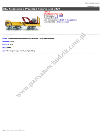 Informacje o produkcie Utworzono 07-03-2017 SIKU Ciężarówka z Przyczepą Koparka 1/55 3920 Cena : Chwilowy brak ceny .p l Nr katalogowy : S-3920 Producent : SIKU Stan magazynowy : brak w magazynie Średnia ocena : brak recenzji om Nazwa: Zestaw zawiera metalowy model ciężarówki z przyczepą i koparkę. Producent: SIKU Numer id: 3920 .c Skala: BRAK w w w .p an sa m oc ho dz ik Opis: Model wykonany z metalu,oraz plastikuę Wygenerowano w programie www.oscGold.com